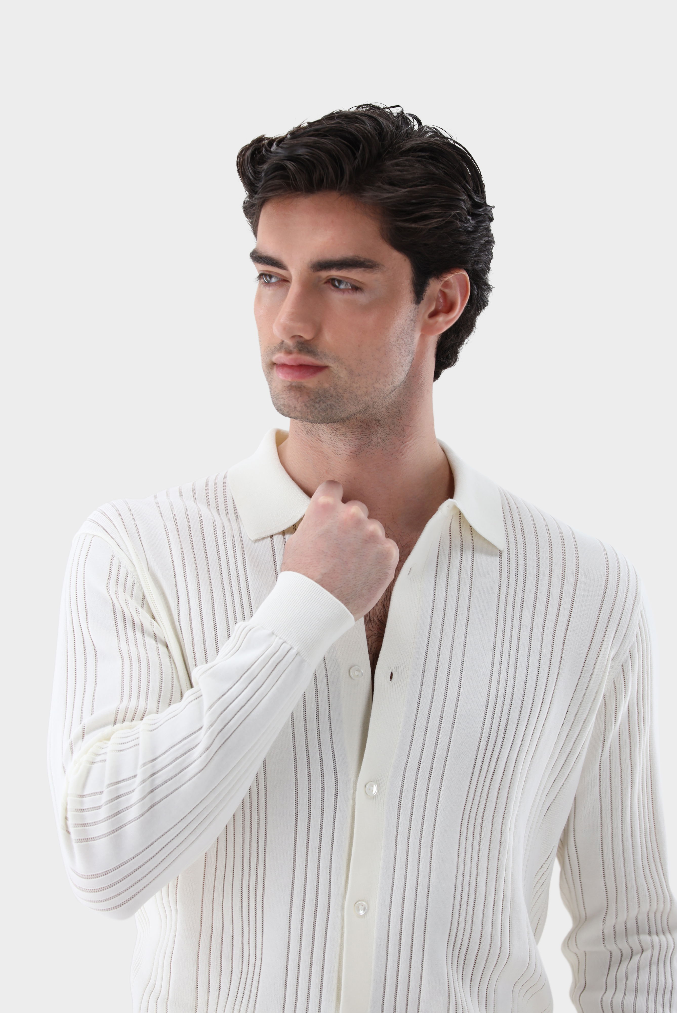 Das Strick Hemd mit Streifen Struktur aus Air Cotton überzeugt durch Tragekomfort und hochwertige Verarbeitung. Der Einsatz von gezwirnten, fein gestrickten Baumwollgarnen mit einer modernen Struktur in Streifen-Form, welche gleichzeitig blickdicht sind, bewirkt besondere Luftdurchlässigkeit und verleiht dem Hemd einen besonders modernen look.