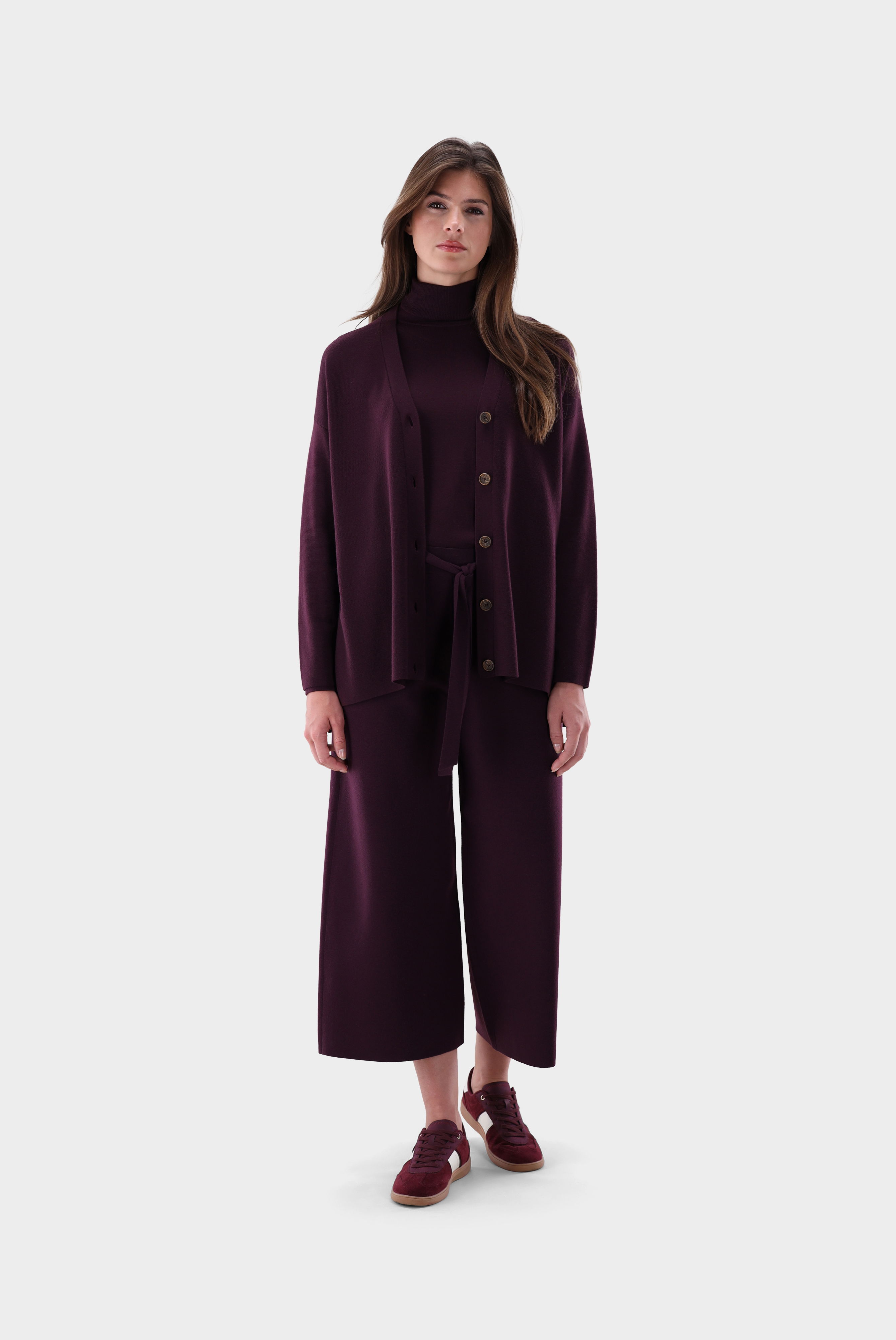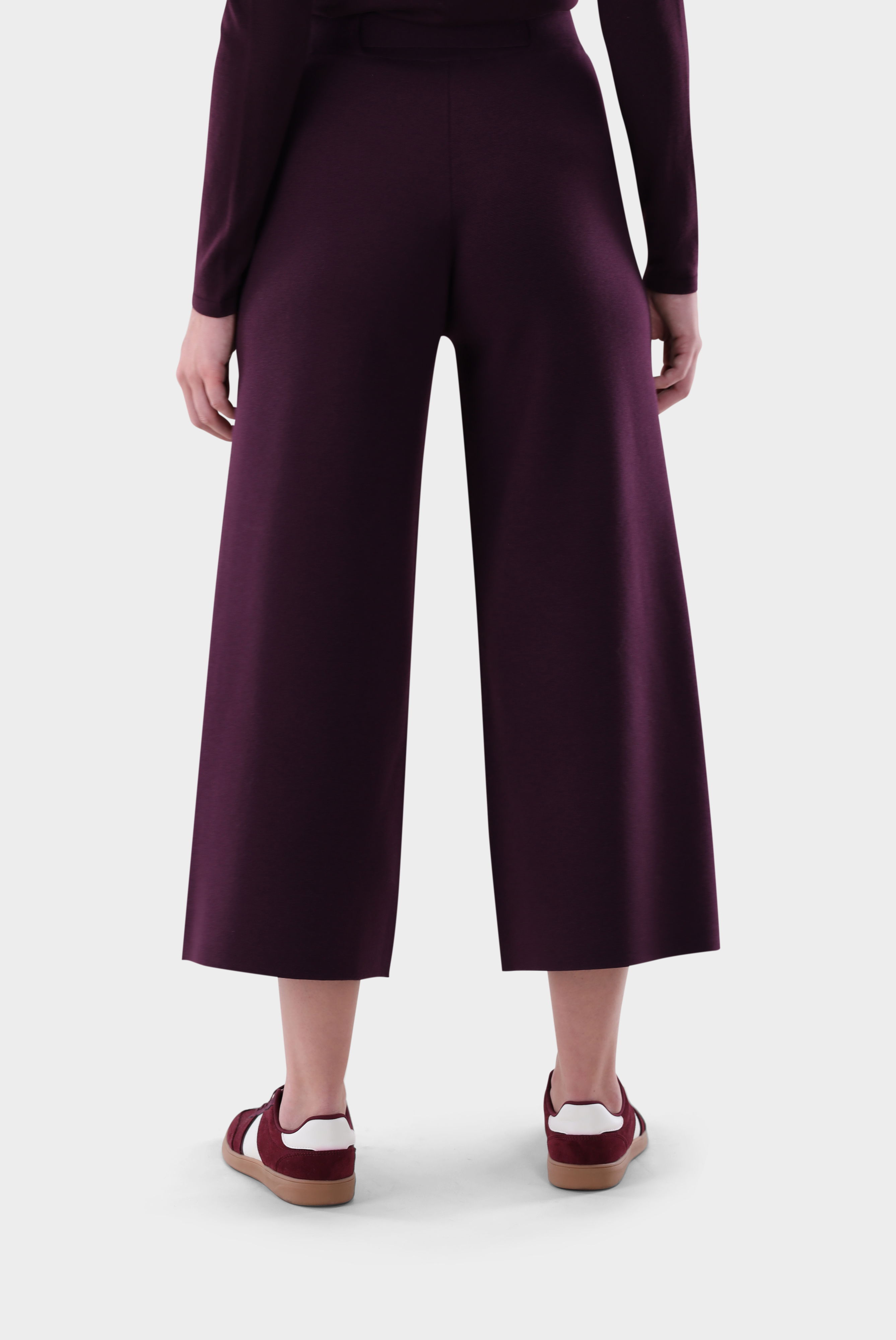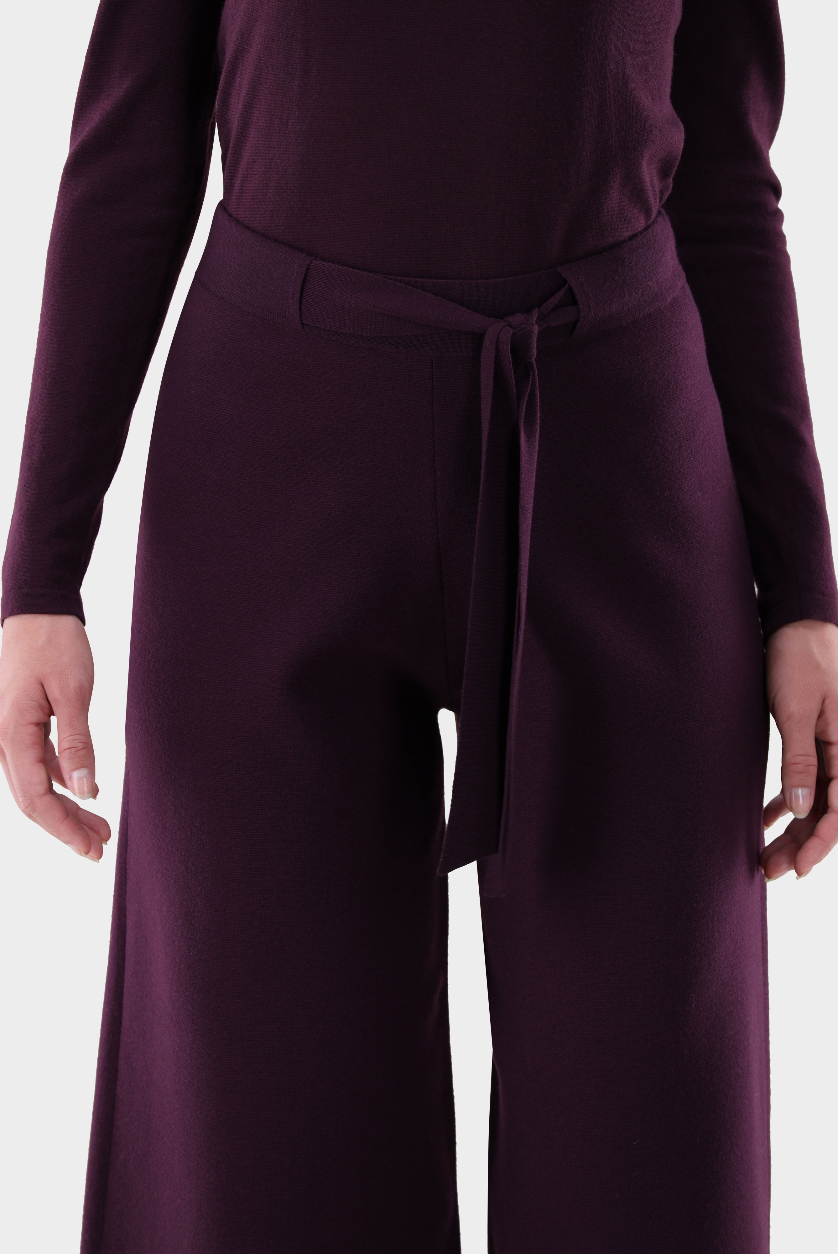 Diese 7/8-Strickhose überzeugt mit weitem Bein und moderner Silhouette. Der abnehmbare Gürtel betont die Taille und ermöglicht individuelle Stylingvarianten. Gefertigt aus ultrafeiner Merinowolle mit Stretch-Anteil bietet die Hose hohen Tragekomfort, Formbeständigkeit und eine luxuriöse Haptik. Die hochwertige Strickqualität sorgt für Bewegungsfreiheit und einen fließenden Fall. Ein vielseitiges Modell, das sowohl für entspannte Freizeit-Looks als auch für elegante Kombinationen geeignet ist.