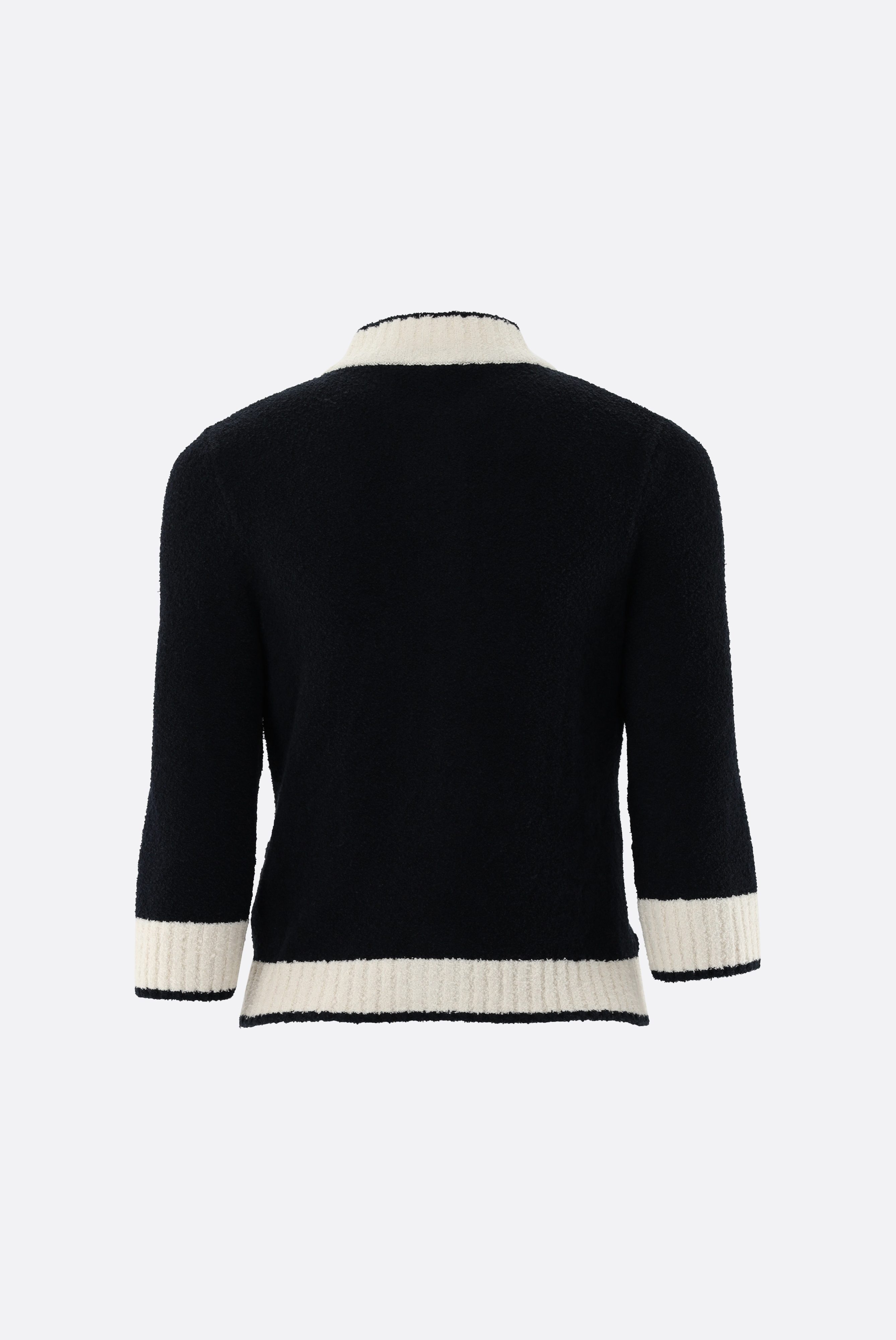 Diese leicht taillierte Strickjacke mit 2/3 Armlänge überzeugt durch ihre elegante Silhouette und moderne Details. Der Stehkragen verleiht dem Modell eine stilvolle Note, während kontrastierende Akzente das Design raffiniert unterstreichen. Die strukturierte Bouclé-Strickqualität sorgt für eine besondere Optik und angenehmen Tragekomfort. Goldfarbene Knöpfe setzen edle Highlights und runden den hochwertigen Look ab – ideal für feminine Casual- und Smart-Casual-Kombinationen.