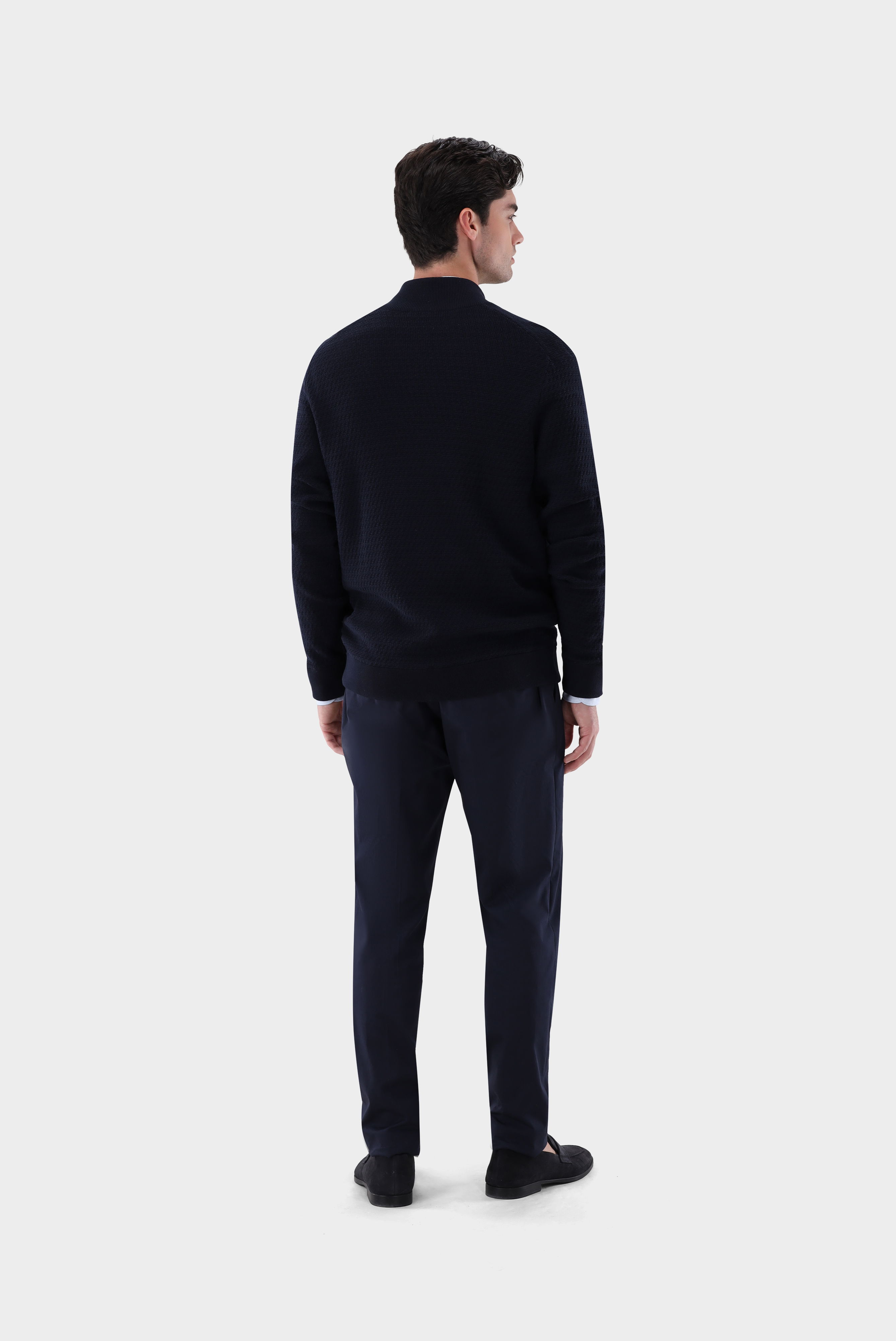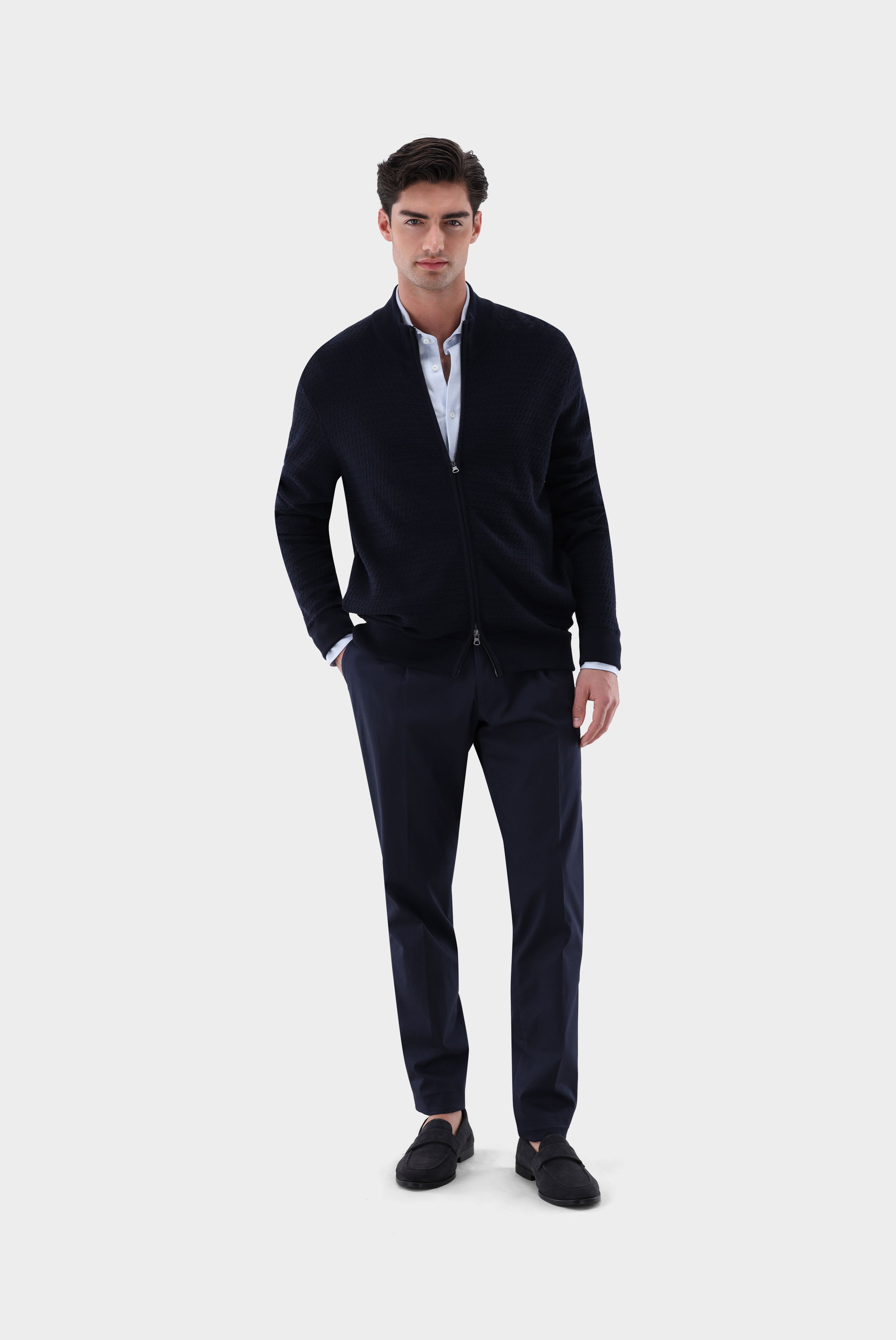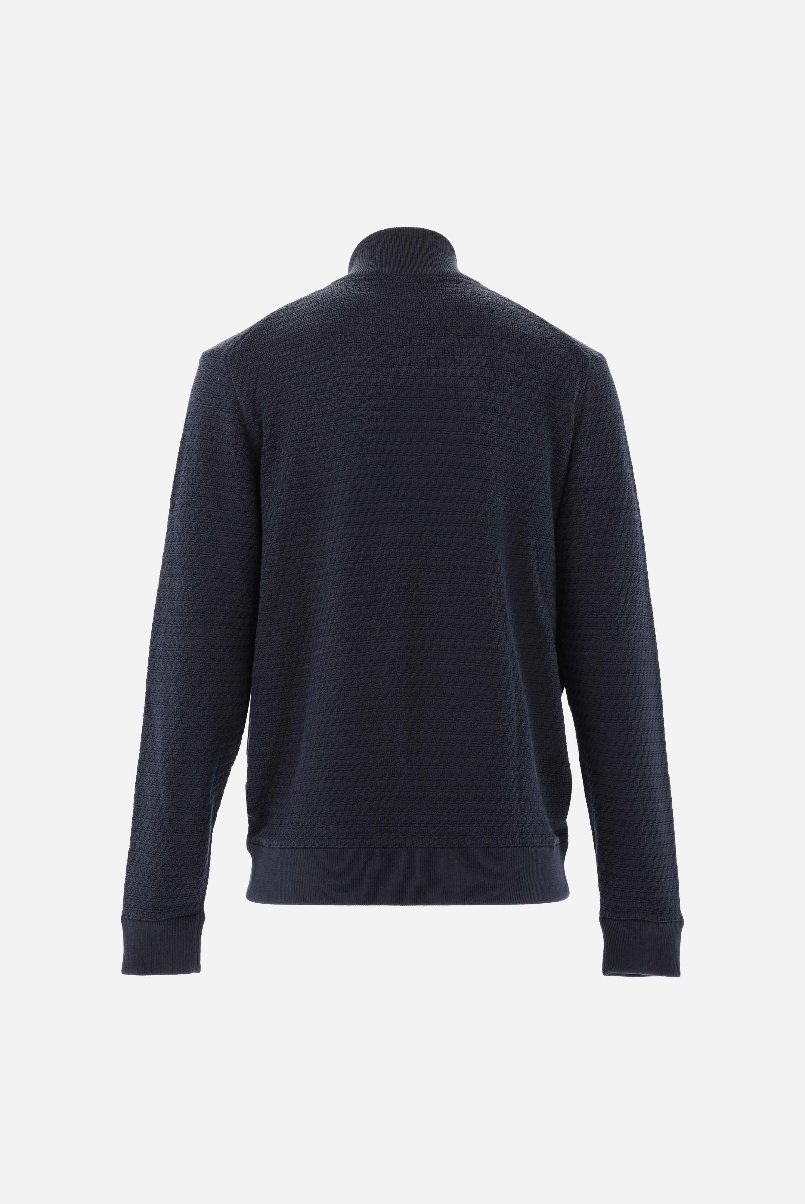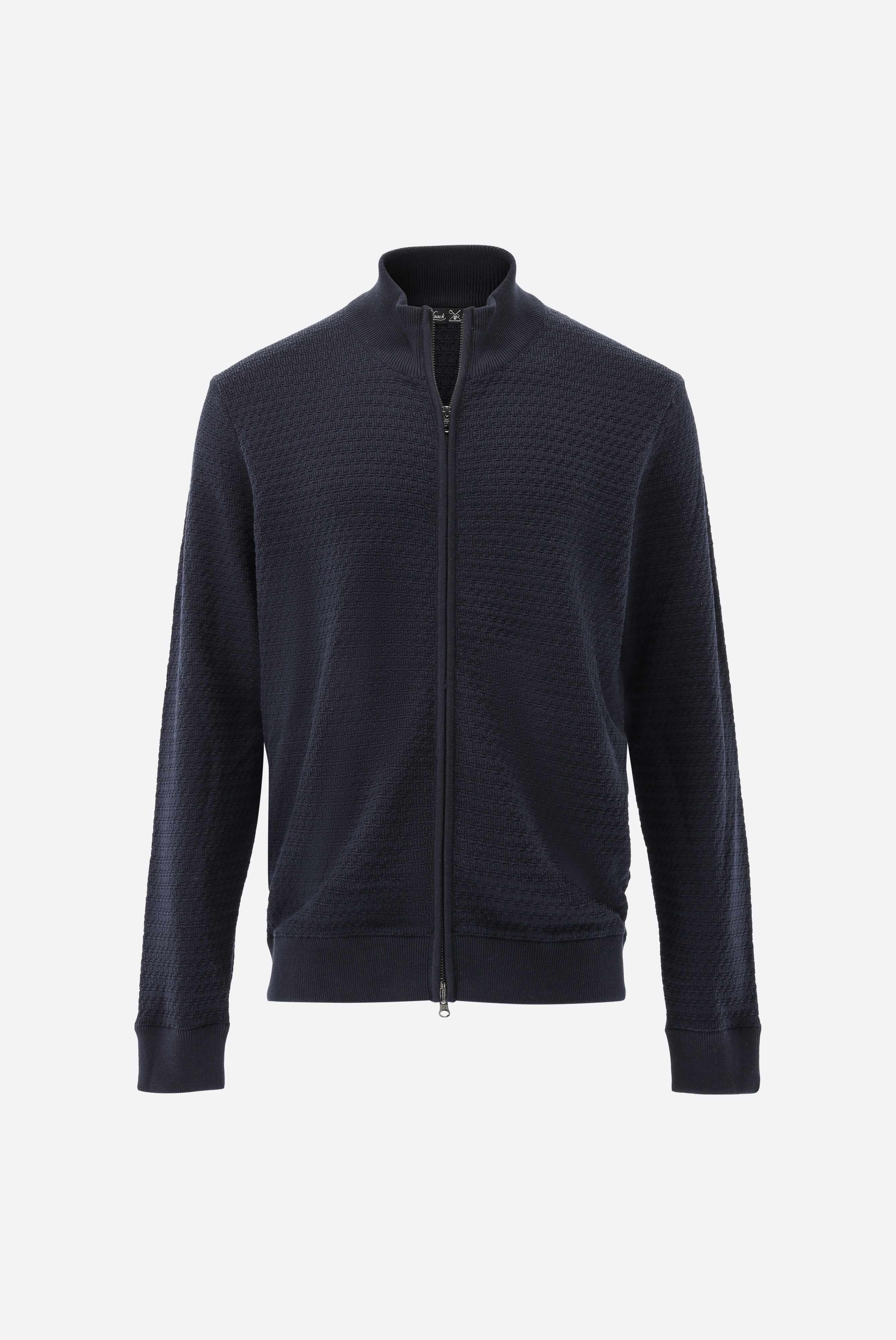 Die Strickjacke mit 2-Wege Reißverschluss wir aus hochwertigen Baumwollgarnen gstrickt. Die Merzerisierte Verarbeitung der Baumwolle sorgt für einen edlen Glanz und für ein weiches, fast schon seidiges, Tragegefühl. Das Design besticht durch eine Struktur, welche die van Laack Signature Struktur mit einem kleinen v und einem L darstellt.