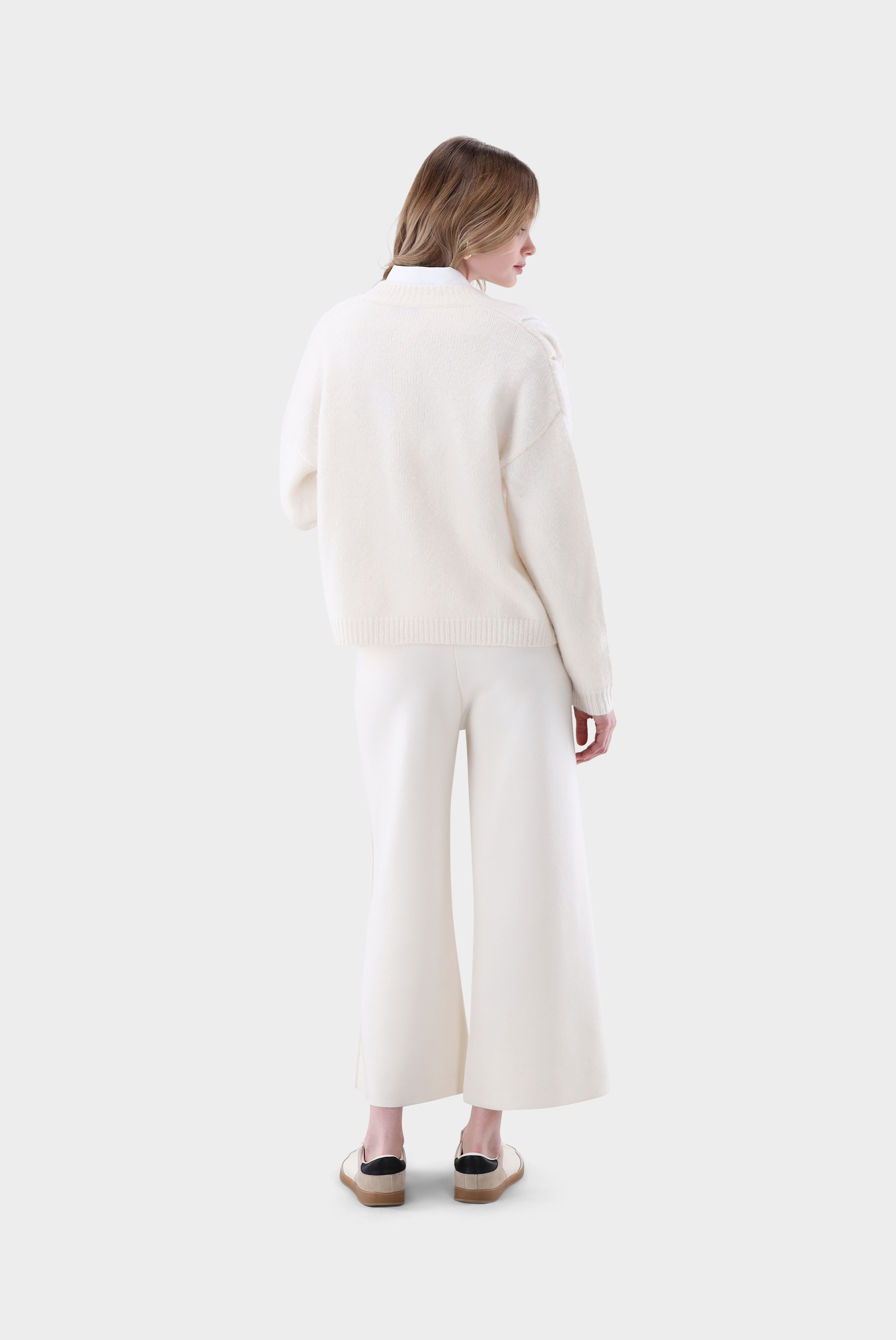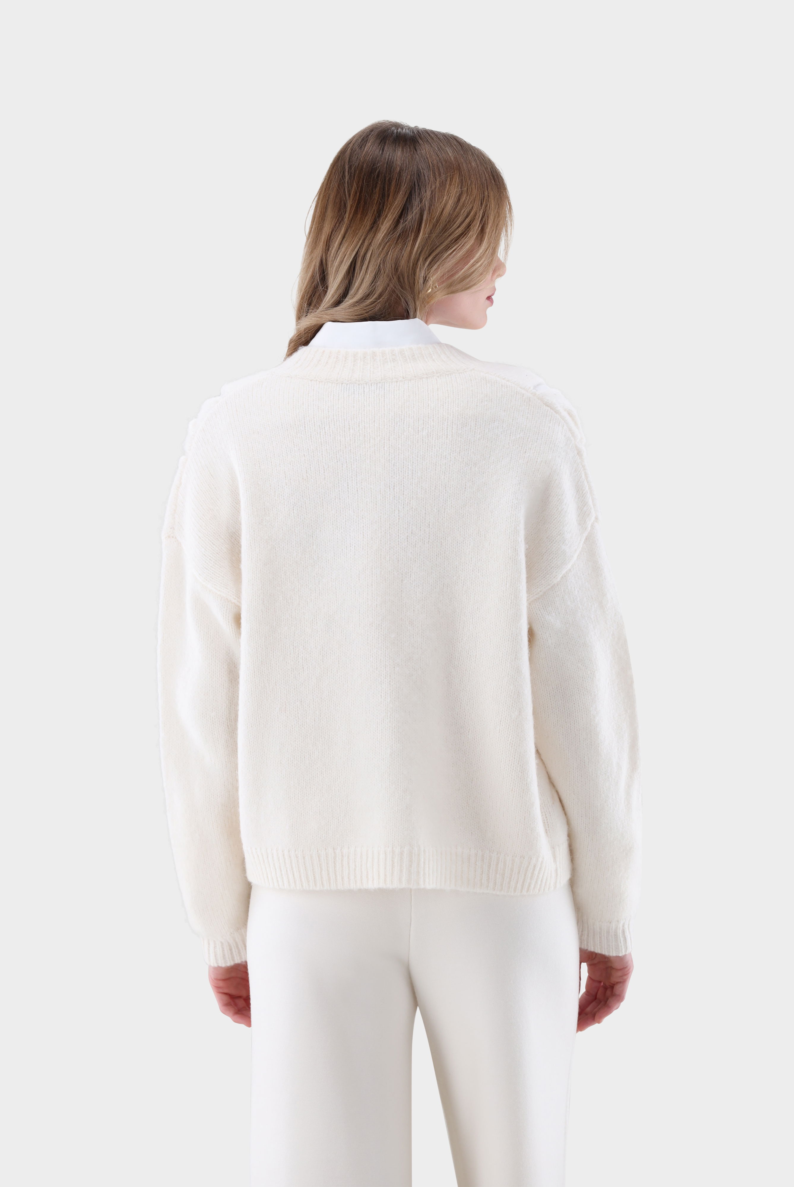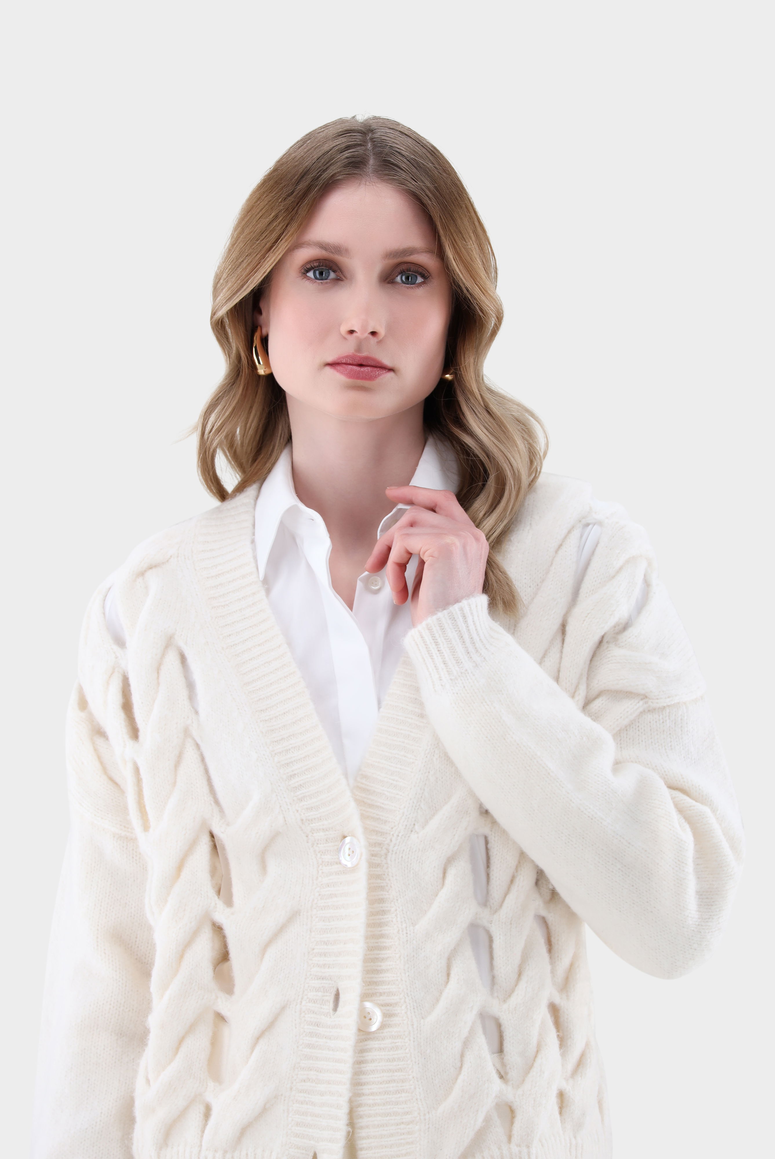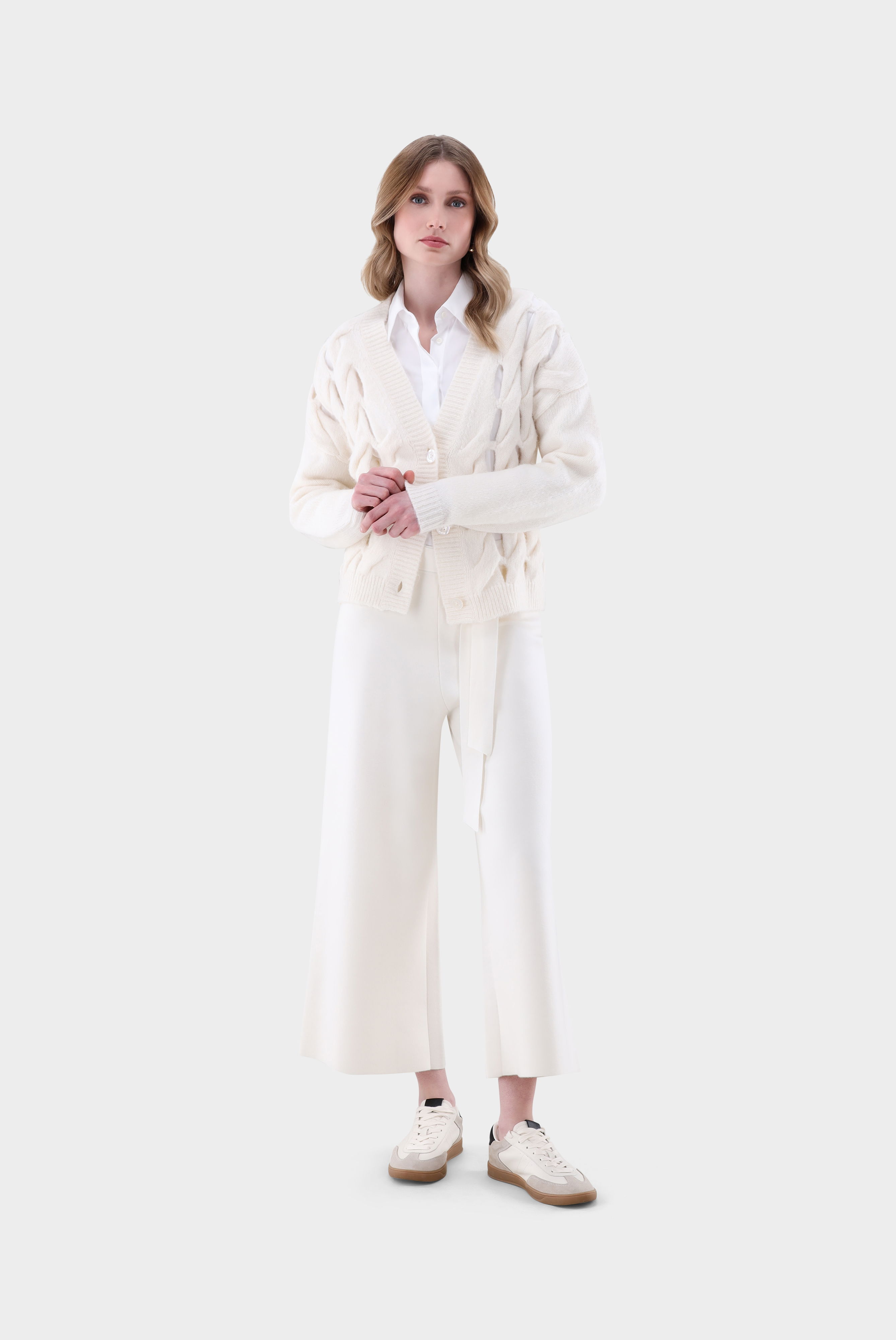 Look aus Strickjacke mit offenem Zopfstrickmuster