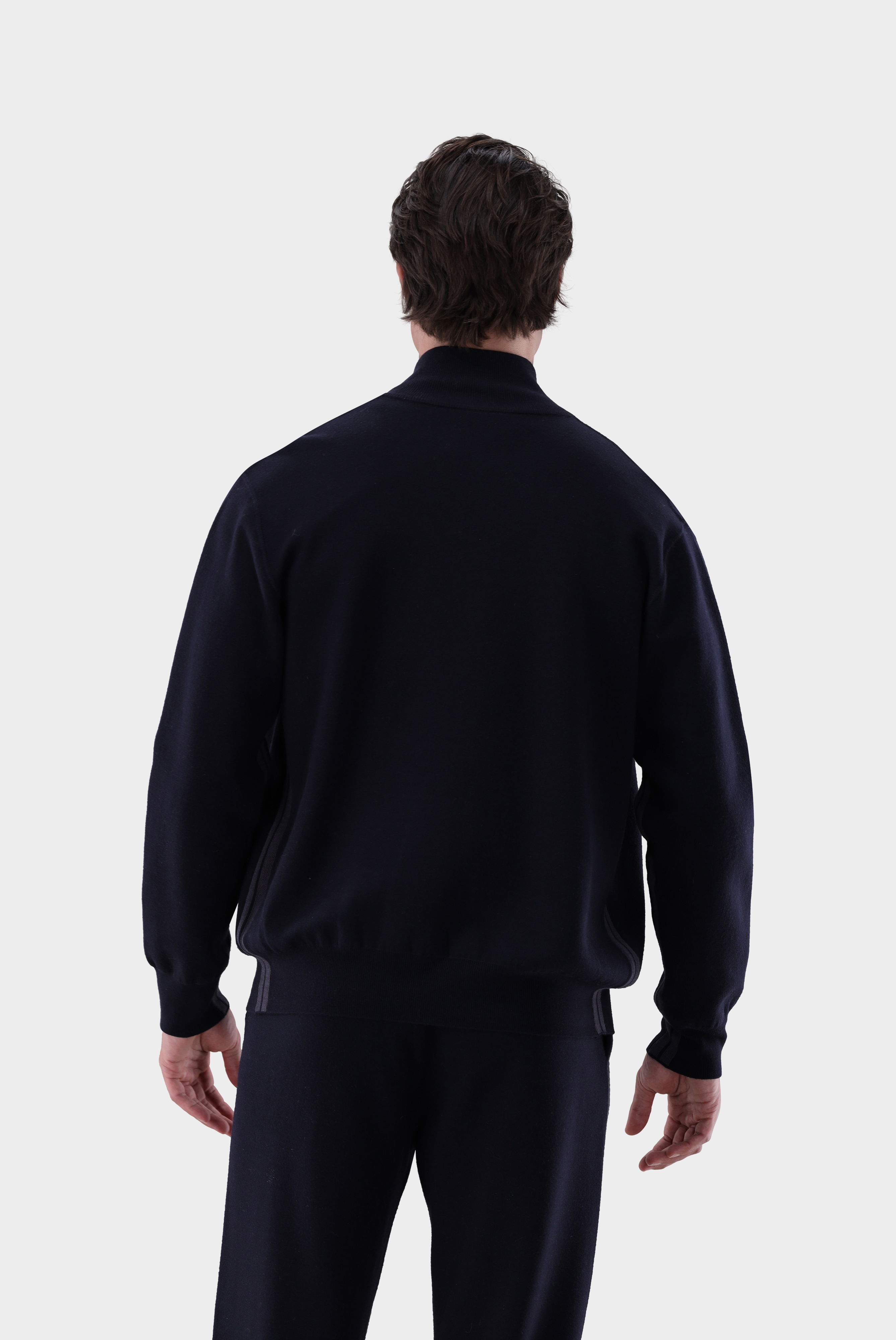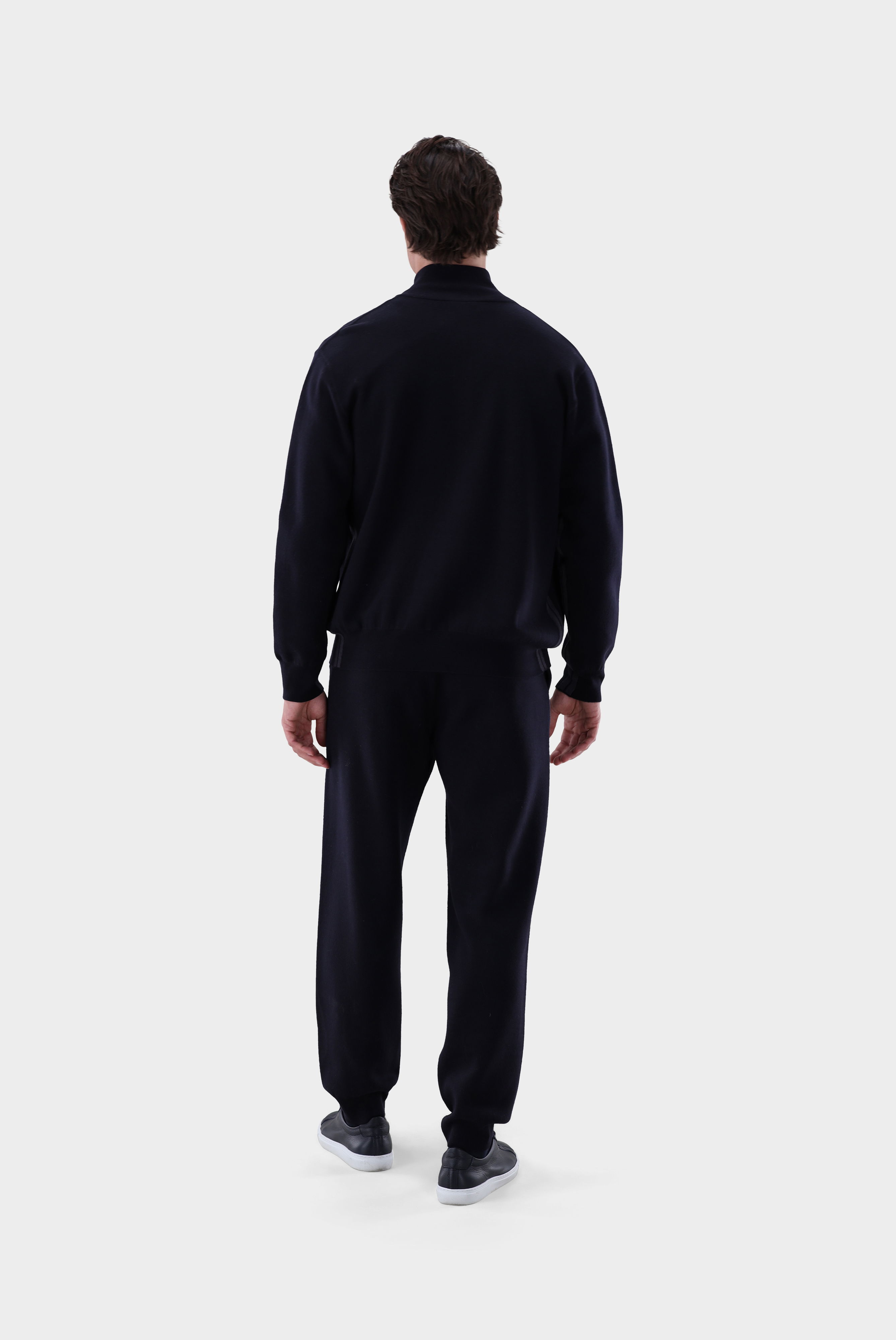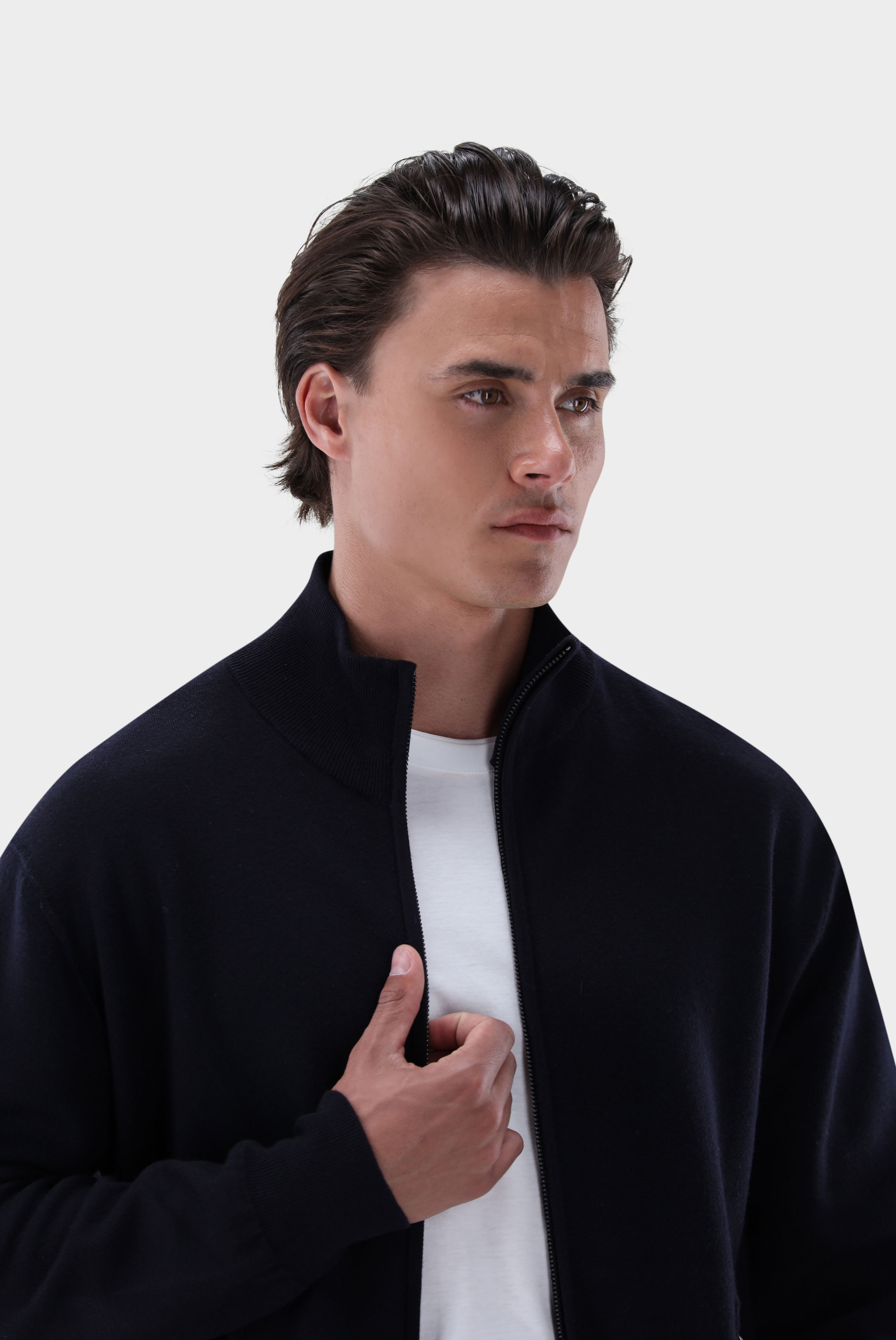 Luxuriöse Strickjacke mit Reißverschluss, gefertigt aus einer edlen Mischung aus Wolle und Seide mit weicher Baumwoll-Innenseite für höchsten Tragekomfort. Seitentaschen mit Reißverschluss bieten praktische Aufbewahrungsmöglichkeiten und unterstreichen das durchdachte Design. Die Kombination aus hochwertigen Materialien und funktionalen Details macht diese Jacke zu einem vielseitigen Begleiter für kühle Tage – ideal für stilvolle Freizeit- und Reiseoutfits. Sie ist zudem mit der Joggingose Sylar als luxuriöser Jogginganzug kombinierbar.