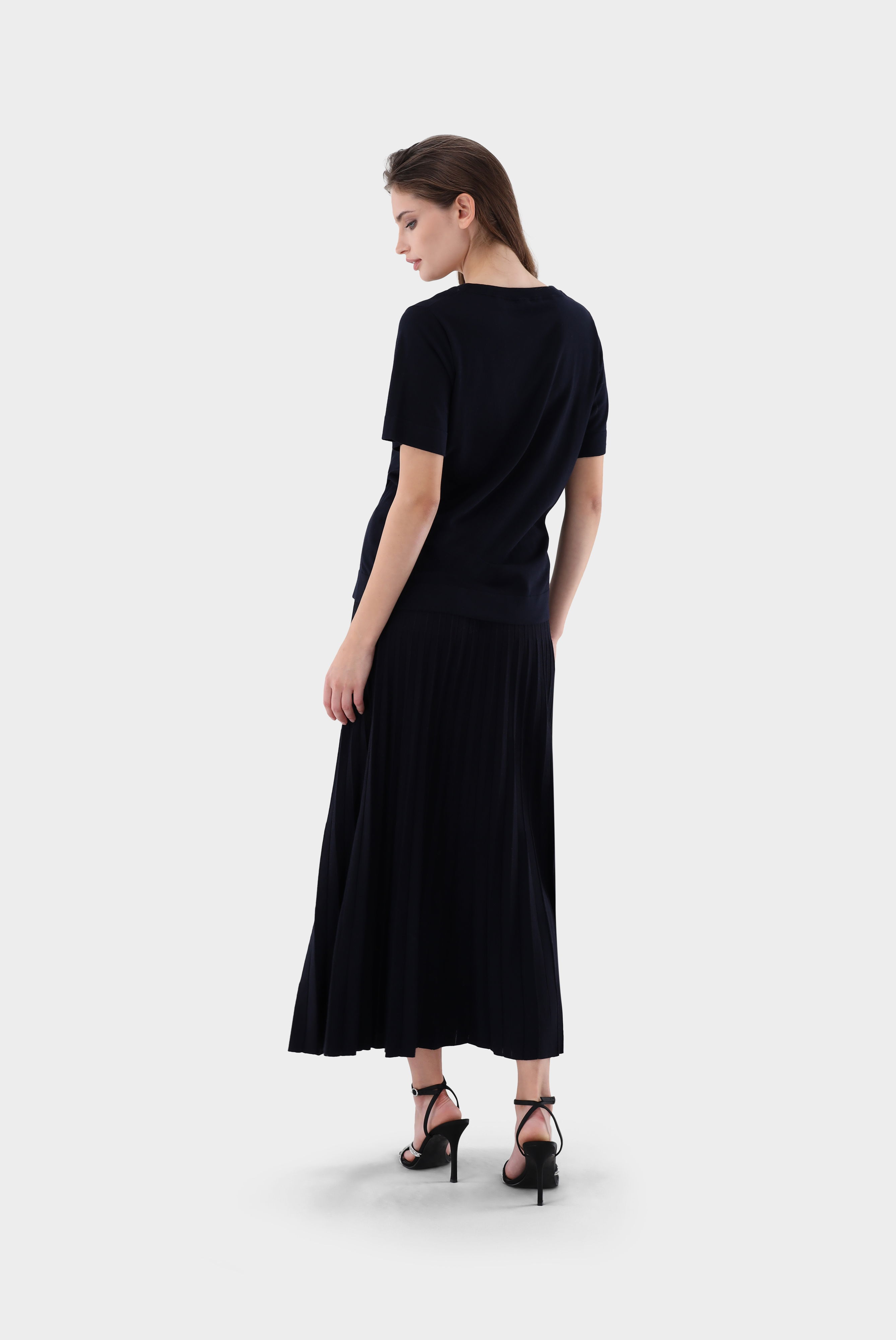 Das lockere Strick T-Shirt aus Air Cotton besticht durch eine legere Passform. Die kurzen Ärmel und die gezwirnten und leicht gestrickten Garne, sorgen für besondere Leichtigkeit. Der Rundhals rundet den sportiven Look ab. Ideal für sommer Looks und auch als total Look mit unserem plissierten Rock kombinierbar.