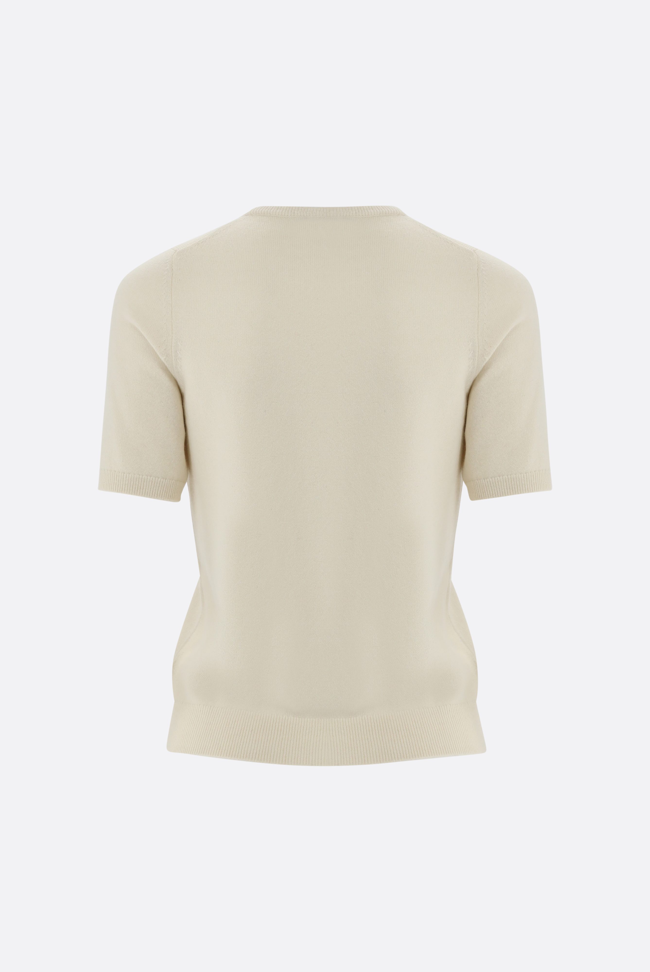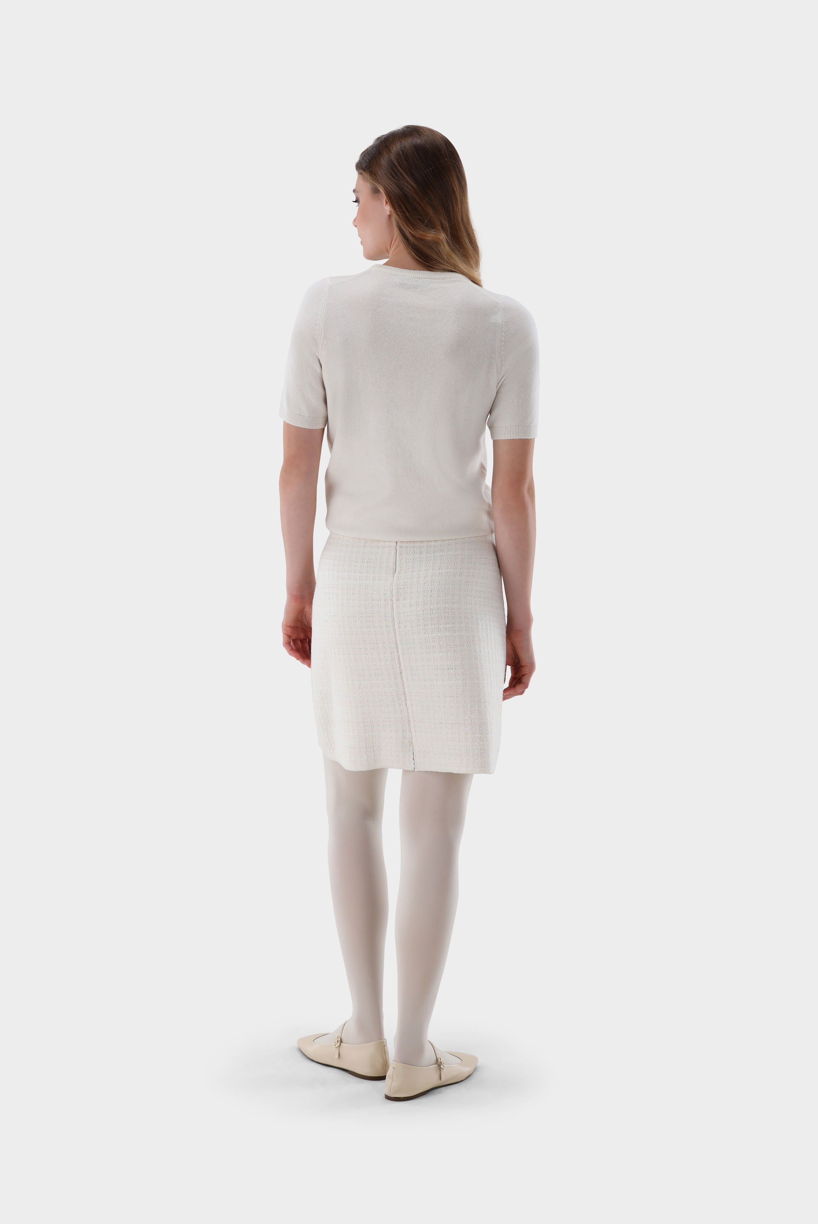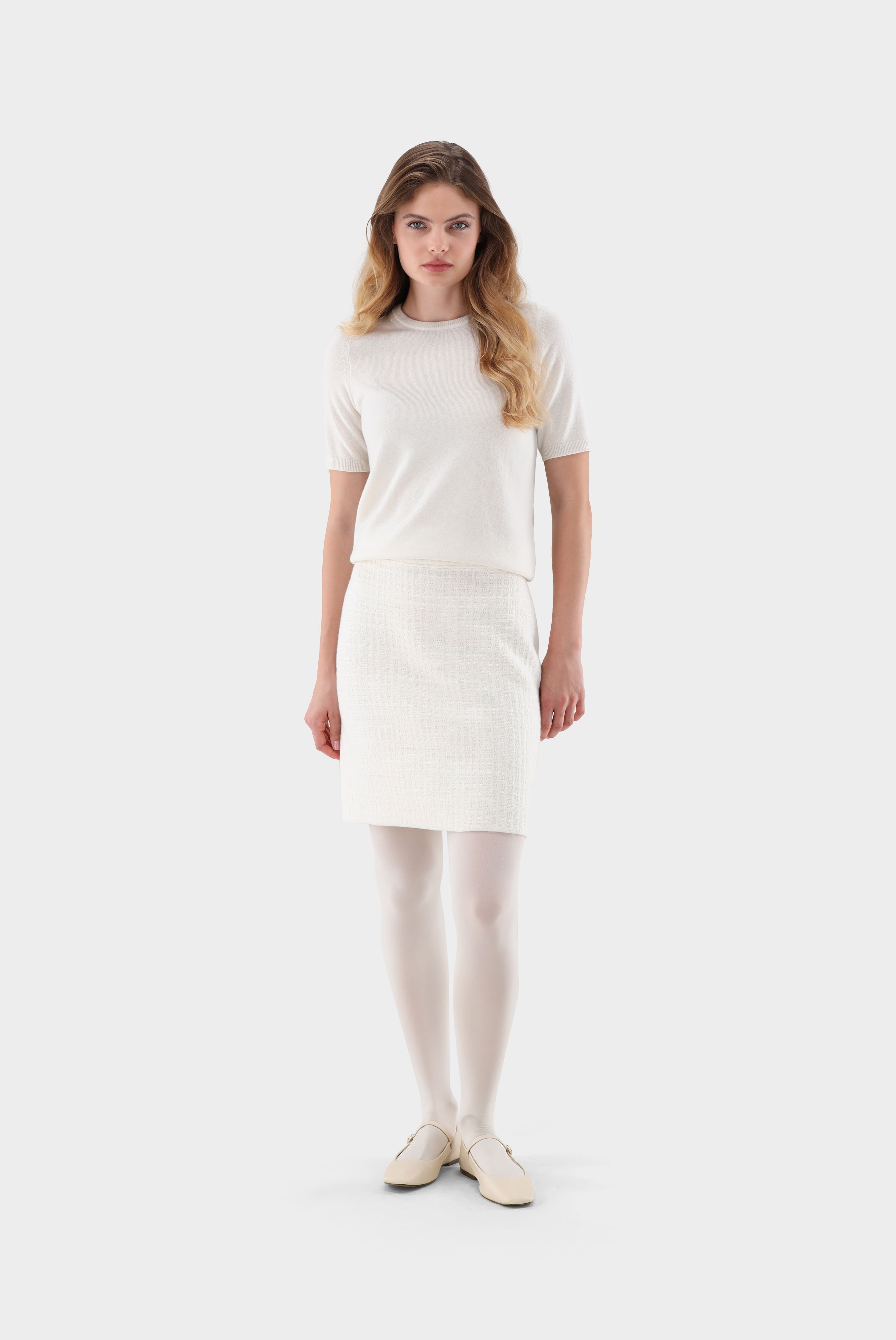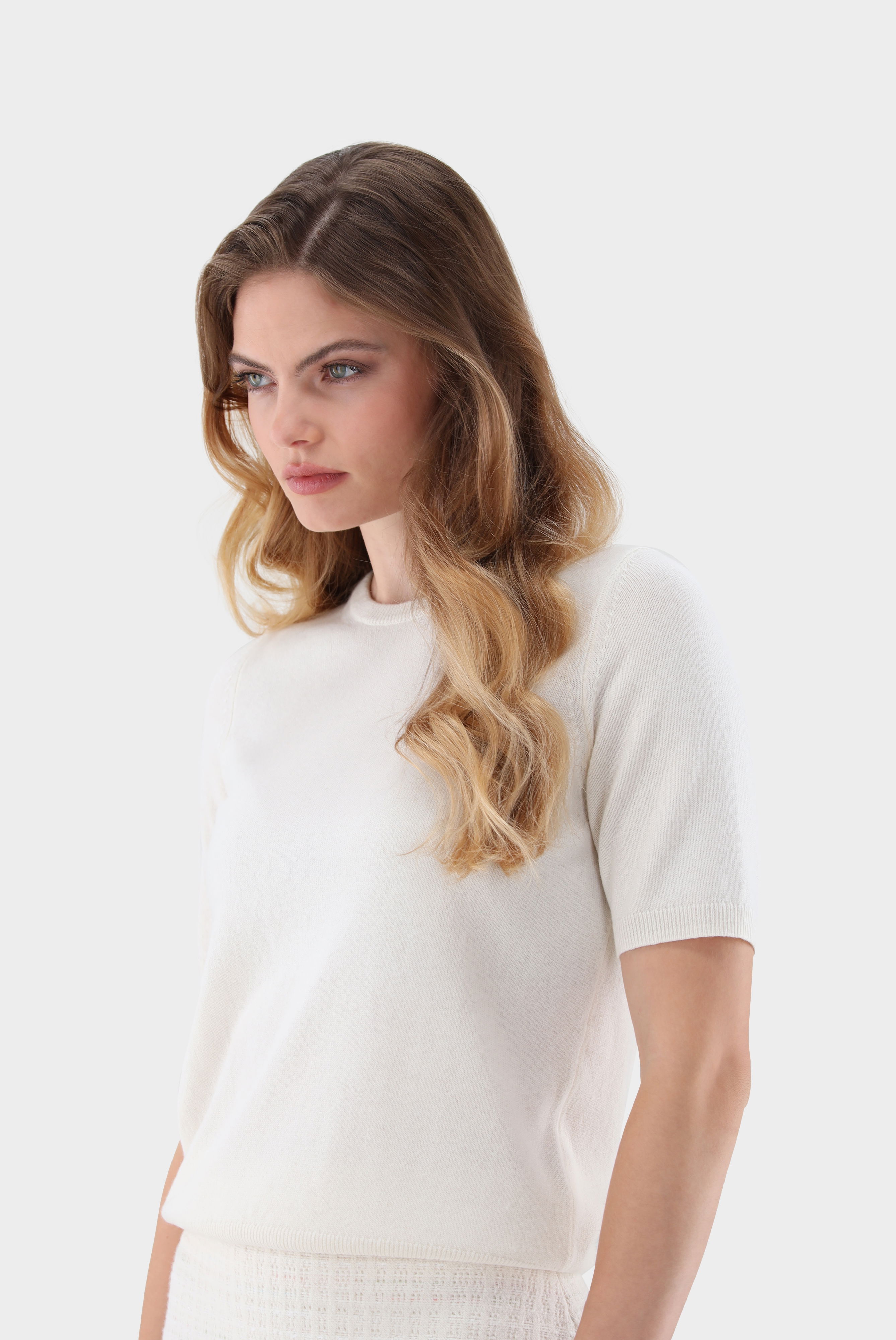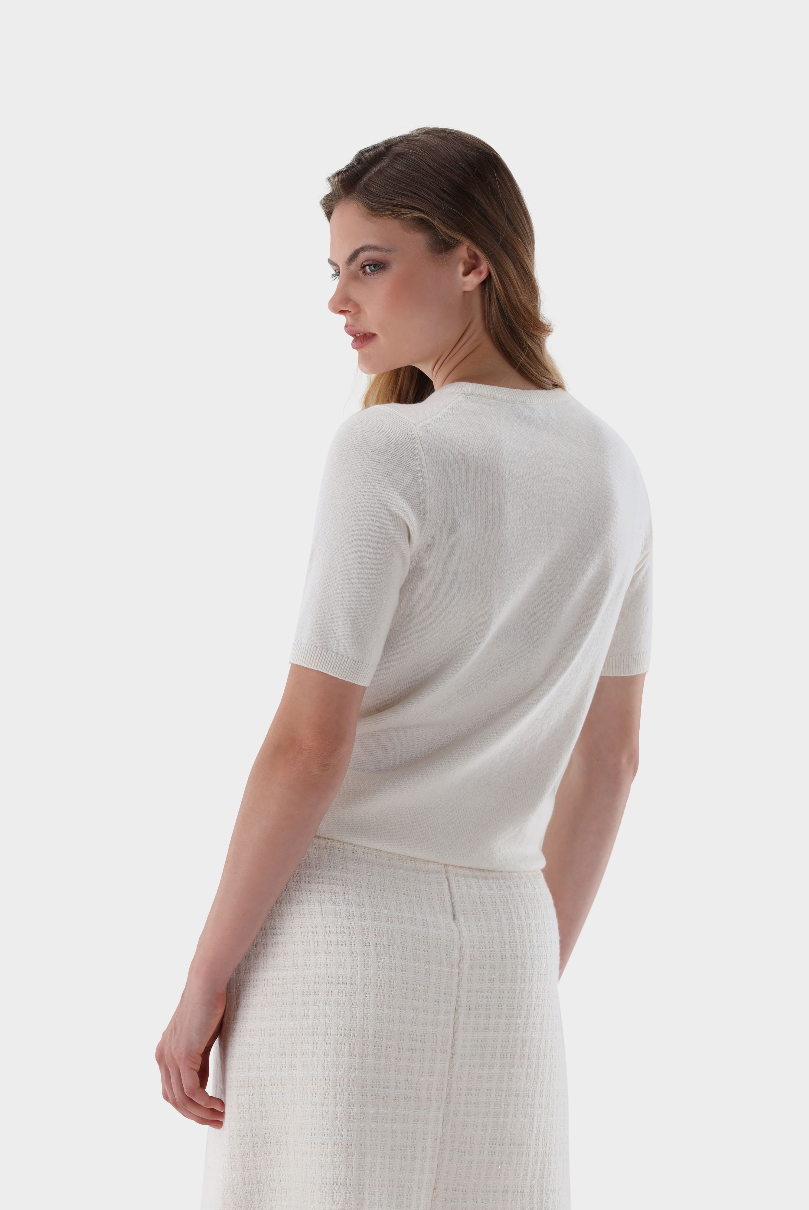 Das Strickshirt besteht aus hochwertigem Kaschmir und verfügt über einen klassischen Rundhalsausschnitt sowie kleine Bündchen an den Ärmeln und am Torso. Es ist kurzärmelig und bietet vielseitige Tragemöglichkeiten, besonders gut in Kombination mit dem Unser Modell Sayana als Twinset. Die Qualität des Kaschmirs verleiht dem Shirt ein angenehmes Tragegefühl und macht es zu einer stilvollen Option für verschiedene Anlässe.