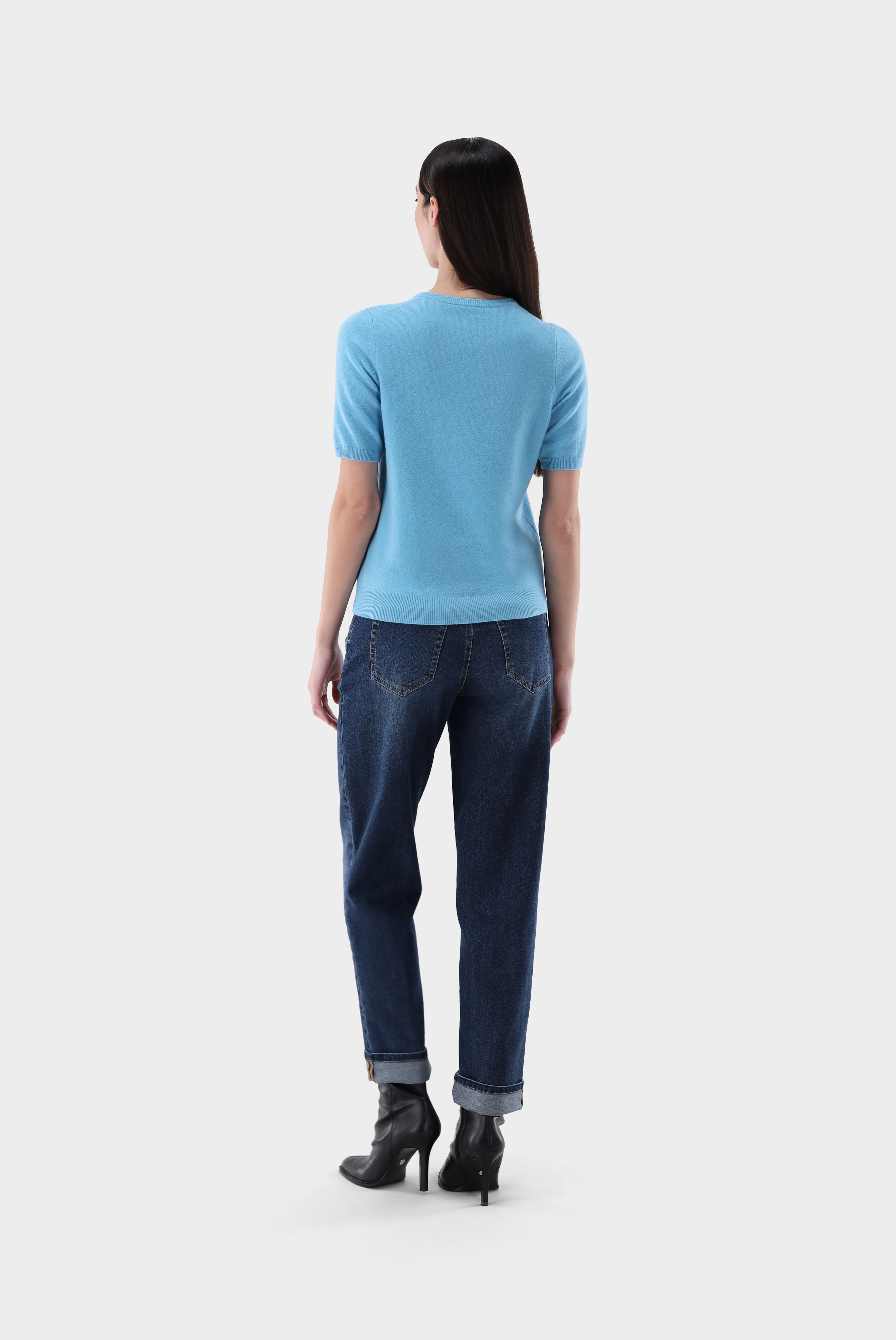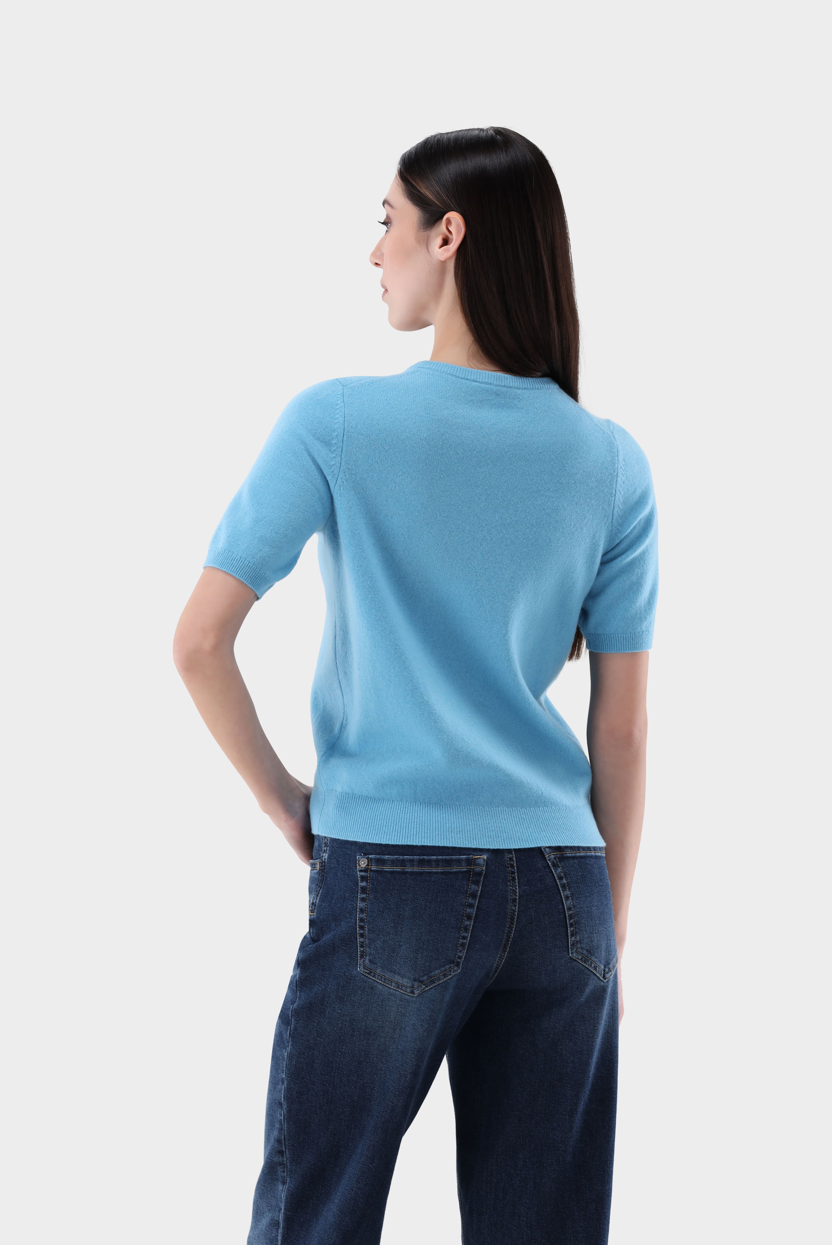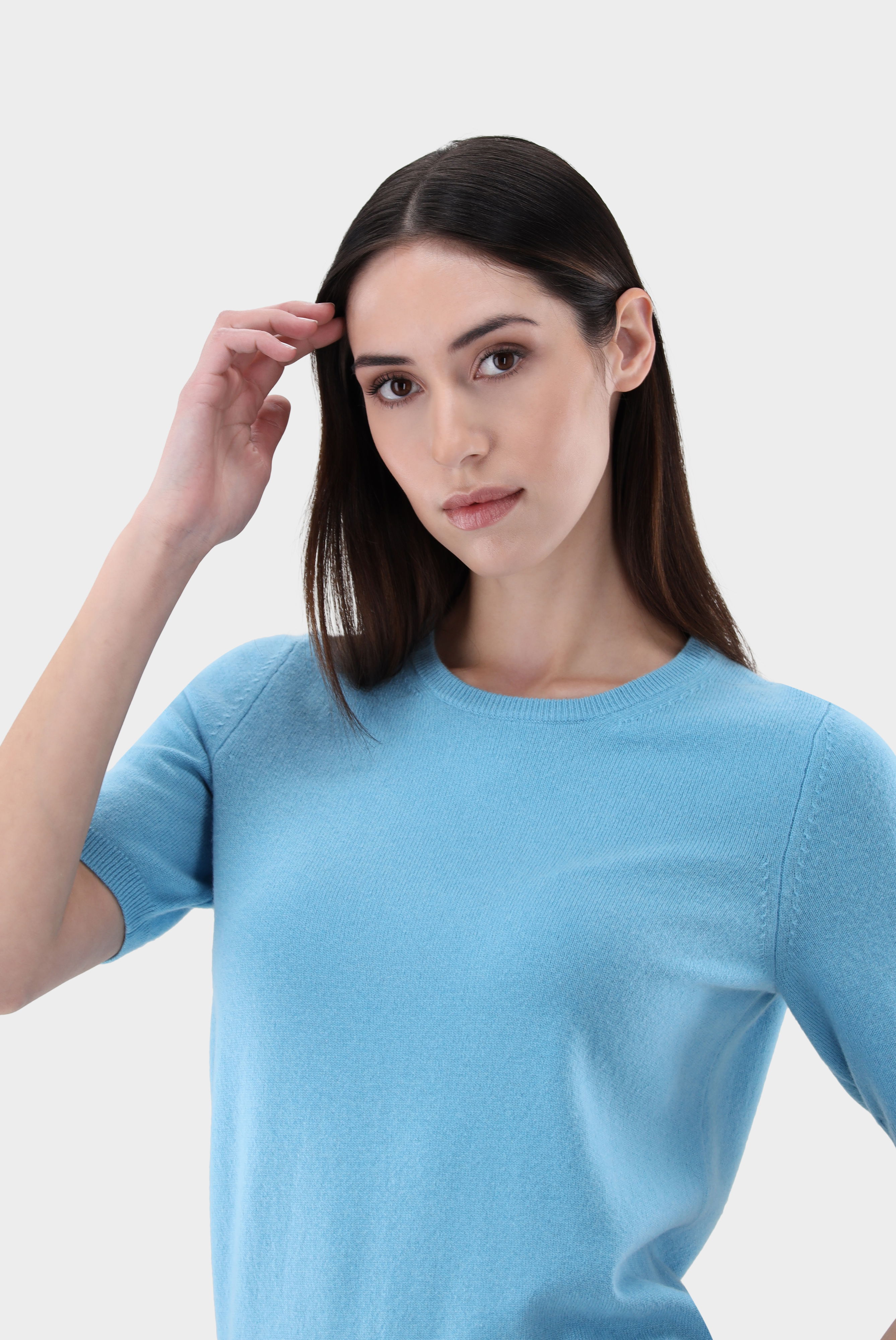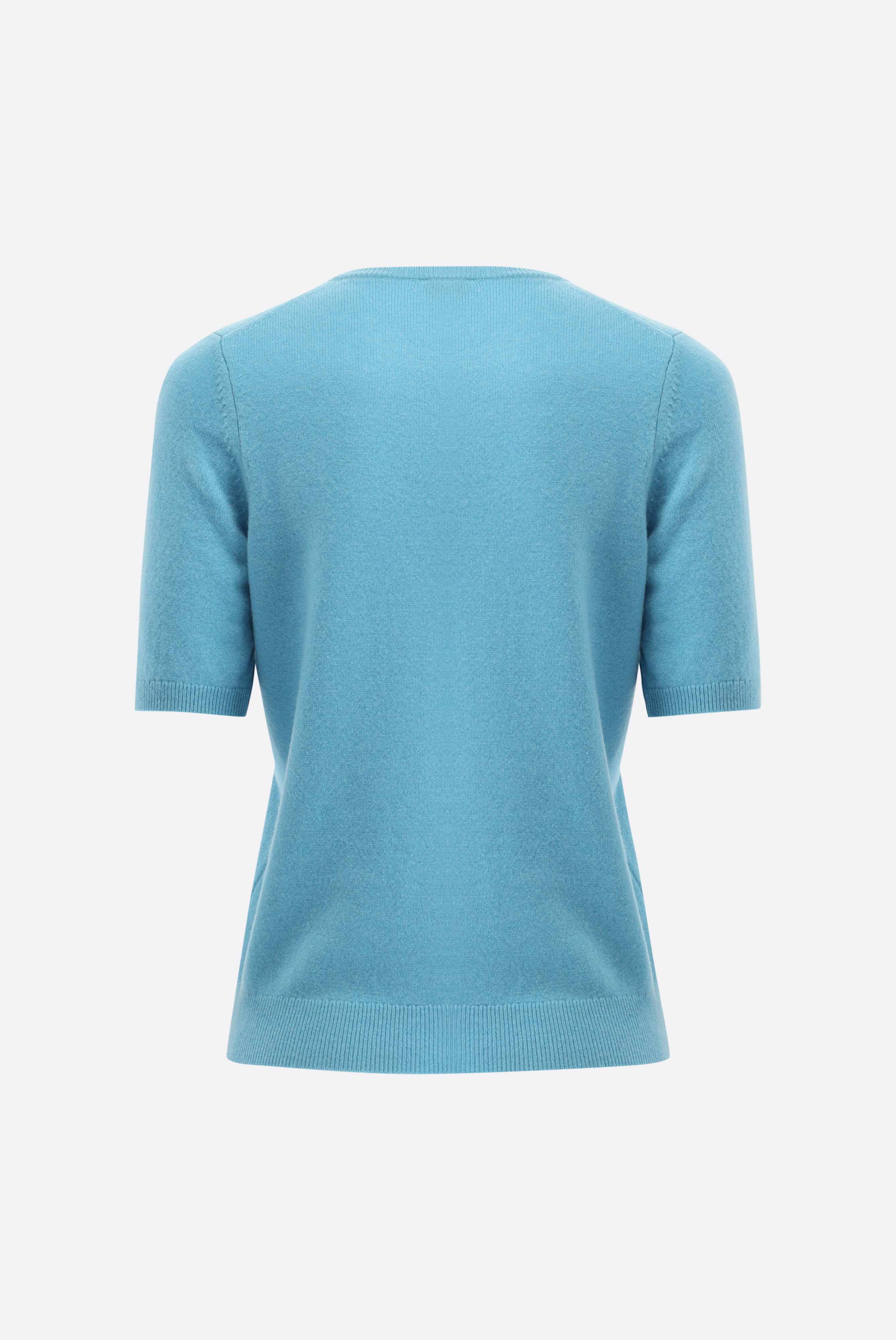 Das Strickshirt besteht aus hochwertigem Kaschmir und verfügt über einen klassischen Rundhalsausschnitt sowie kleine Bündchen an den Ärmeln und am Torso. Es ist kurzärmelig und bietet vielseitige Tragemöglichkeiten, besonders gut in Kombination mit dem Unser Modell Sayana als Twinset. Die Qualität des Kaschmirs verleiht dem Shirt ein angenehmes Tragegefühl und macht es zu einer stilvollen Option für verschiedene Anlässe.
