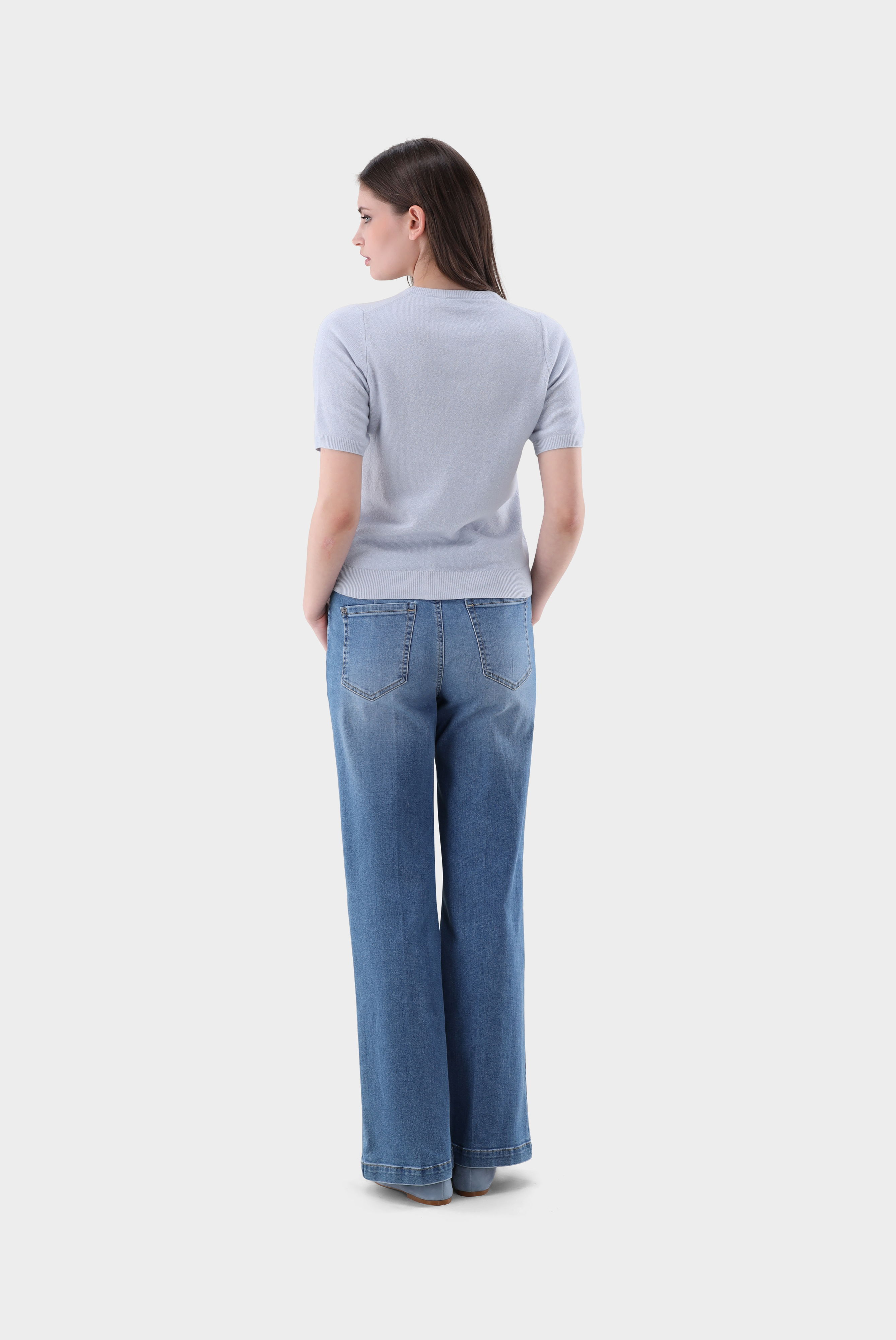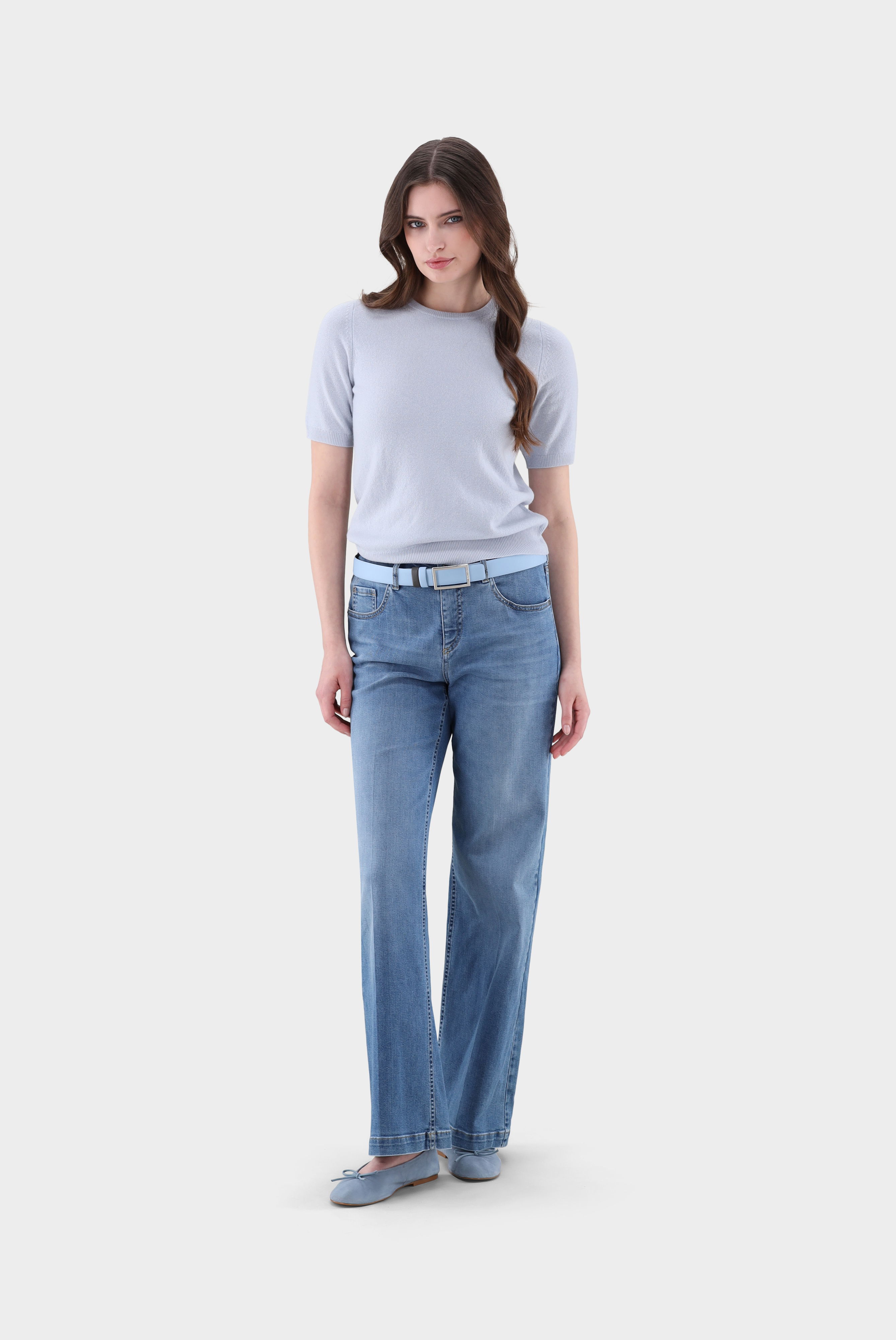 Das Strickshirt besteht aus hochwertigem Kaschmir und verfügt über einen klassischen Rundhalsausschnitt sowie kleine Bündchen an den Ärmeln und am Torso. Es ist kurzärmelig und bietet vielseitige Tragemöglichkeiten, besonders gut in Kombination mit dem Unser Modell Sayana als Twinset. Die Qualität des Kaschmirs verleiht dem Shirt ein angenehmes Tragegefühl und macht es zu einer stilvollen Option für verschiedene Anlässe.