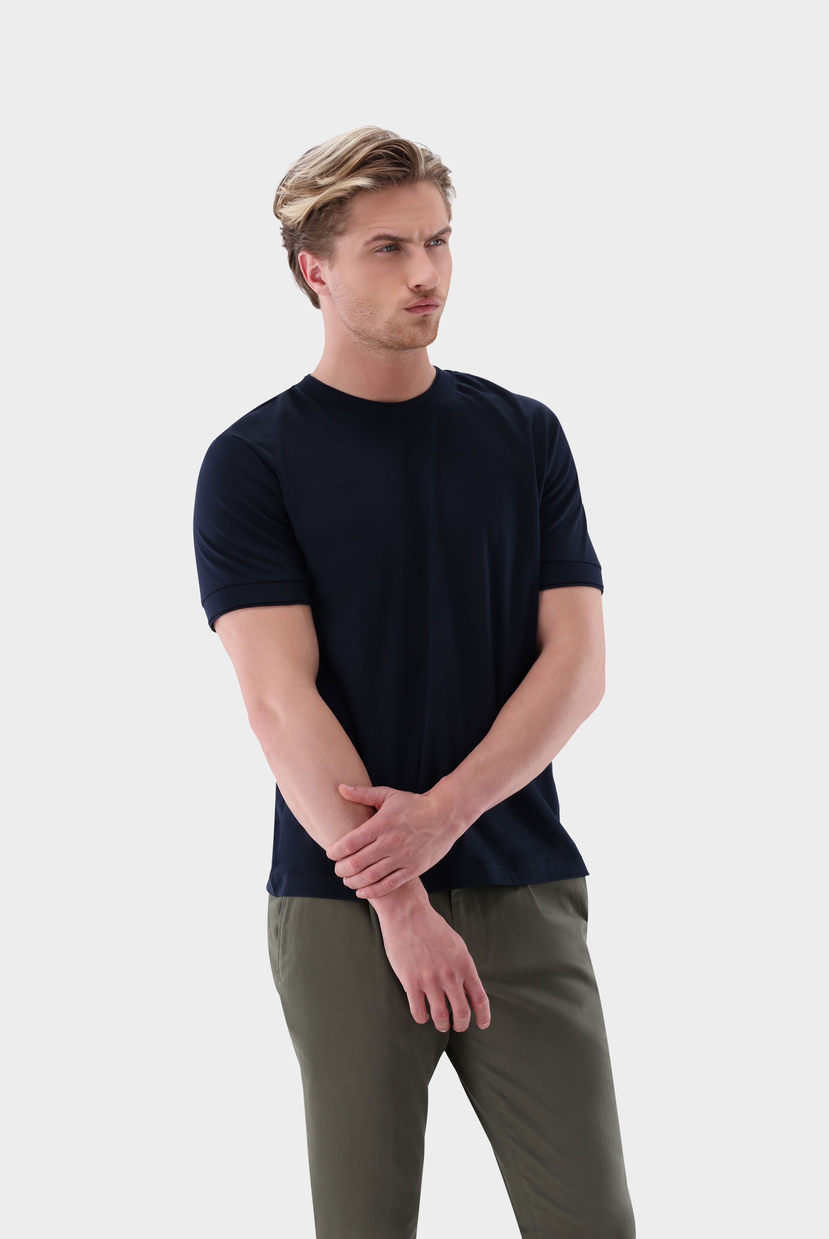 T-Shirt aus Swiss Cotton Jersey mit Rundhals und Paspel Detail. Die Swiss Cotton Jersey Qualität, gefertigt aus besonders hochwertigem und weichem Interlock-Jersey mit Natural-Stretch, sorgt für ein luxuriöses Tragegefühl. Die matte Optik vollendet den klassischen Look.