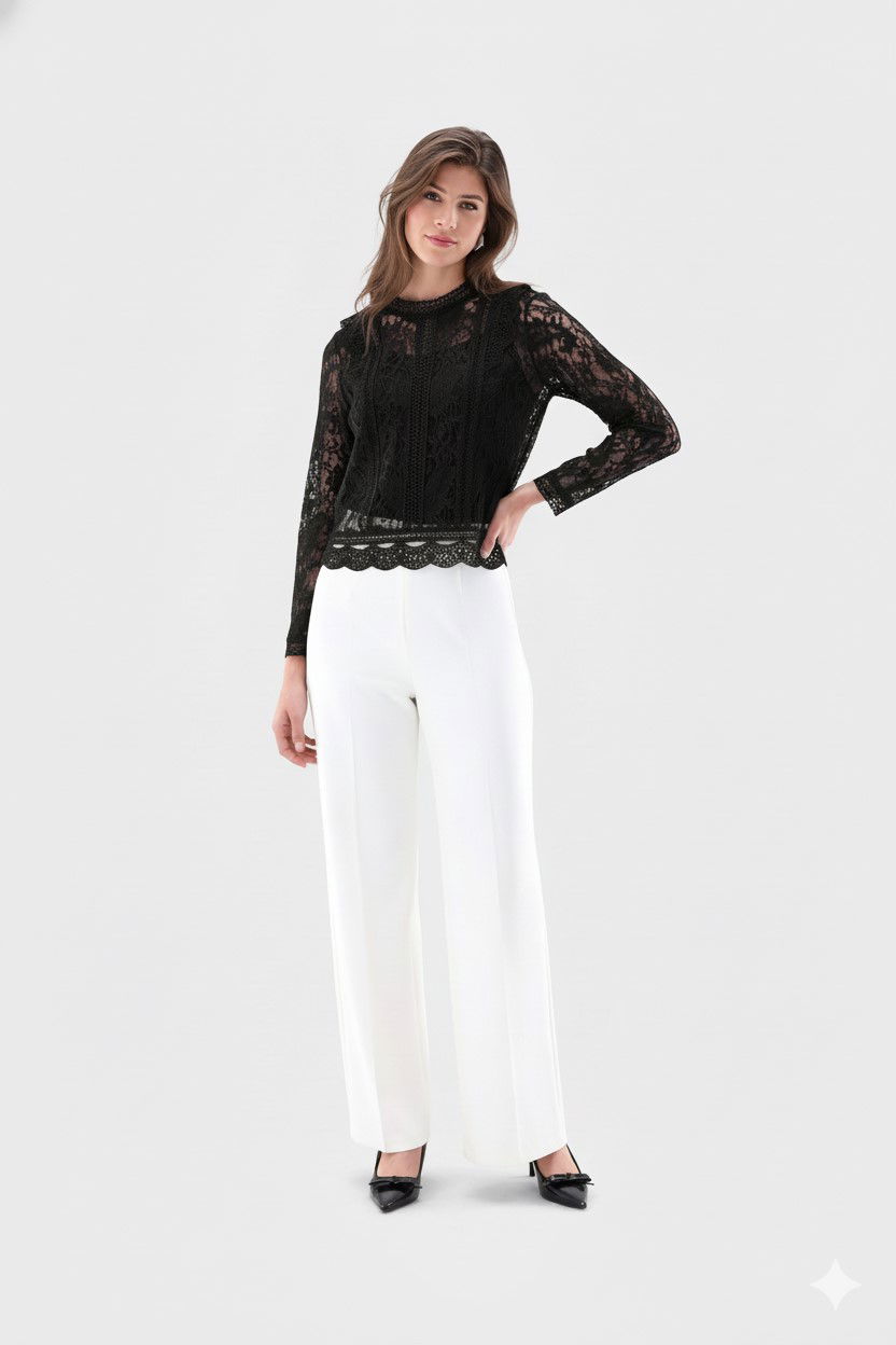 Dieses taillierte Spitzentop mit langen Ärmeln besticht durch seinen eleganten Stehkragen und einen femininen, gewellten Saum. Hinten sorgt ein feiner Knopfverschluss für einen stilvollen Akzent und eine optimale Passform. Die hochwertige Spitze mit Baumwolle, Nylon und Viskose verleiht dem Top eine edle Optik und angenehmen Tragekomfort. Ideal für besondere Anlässe oder stilvolle Abend-Looks ist dieses Spitzenoberteil ein echtes Highlight in jeder Garderobe.