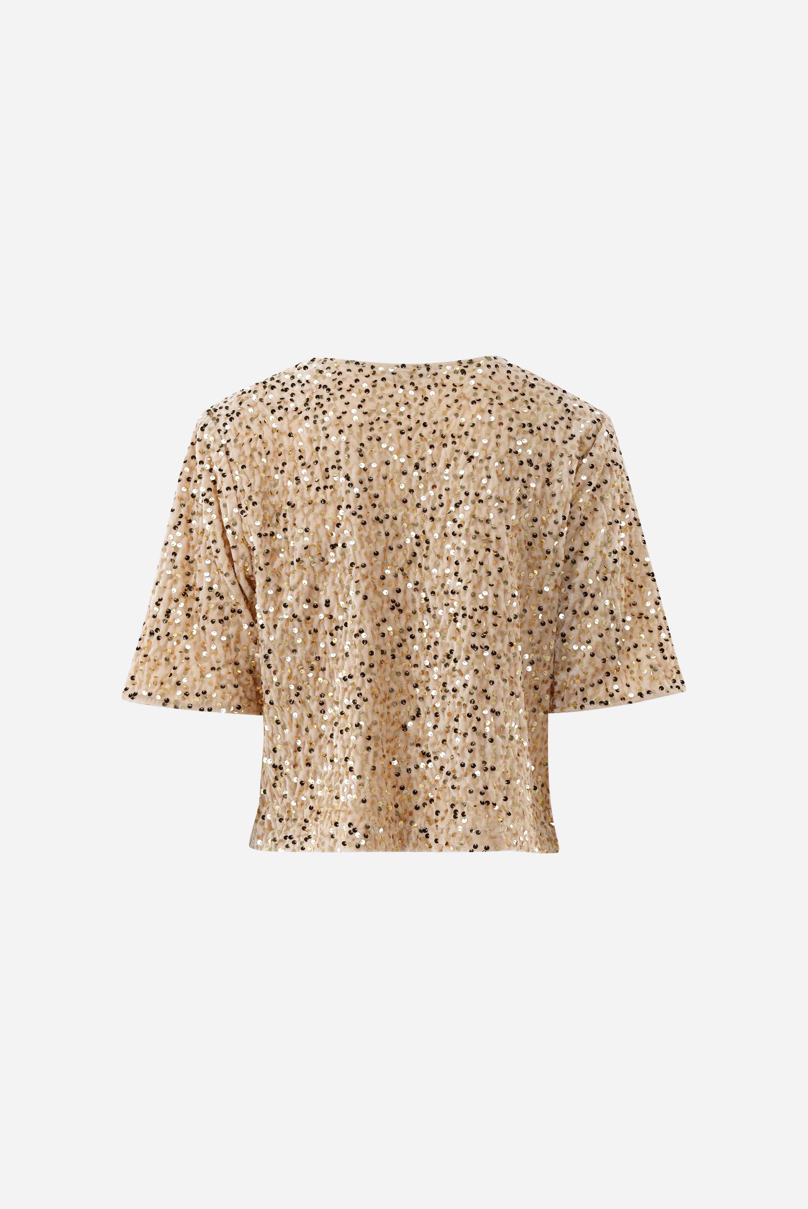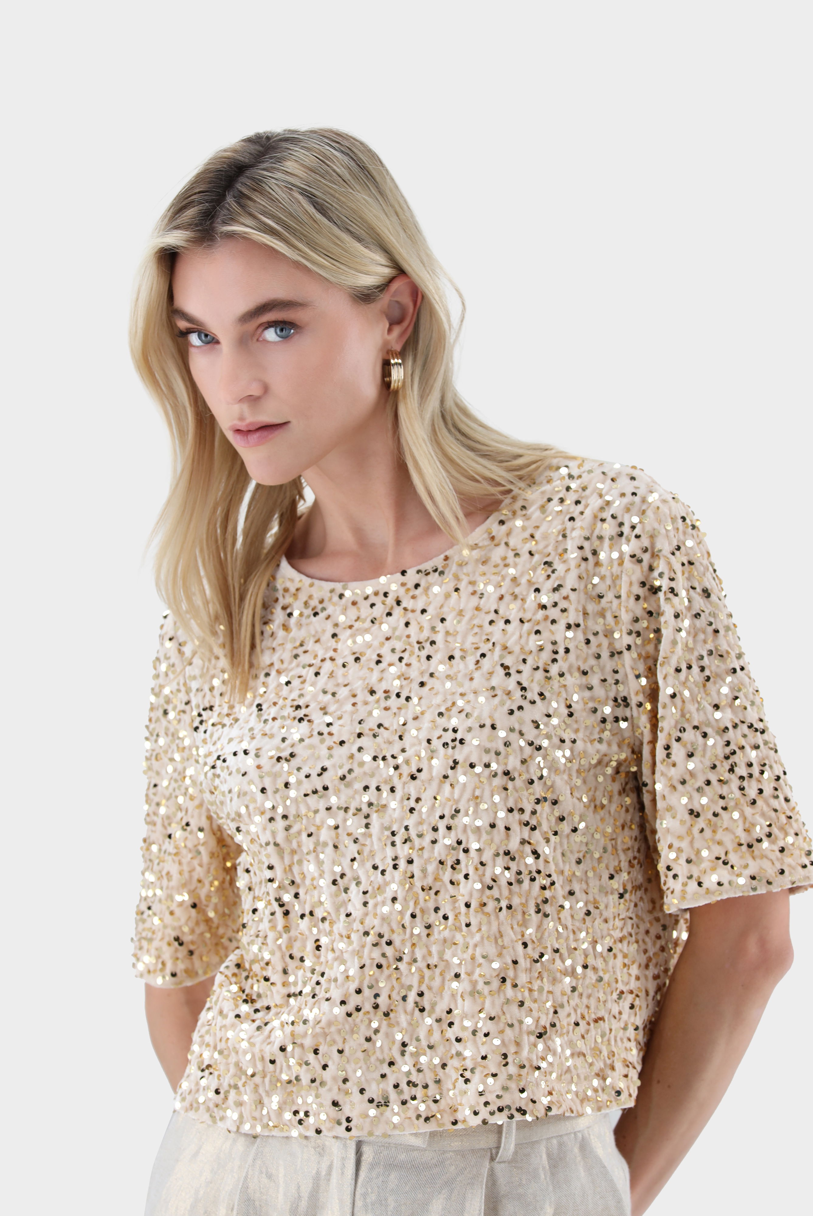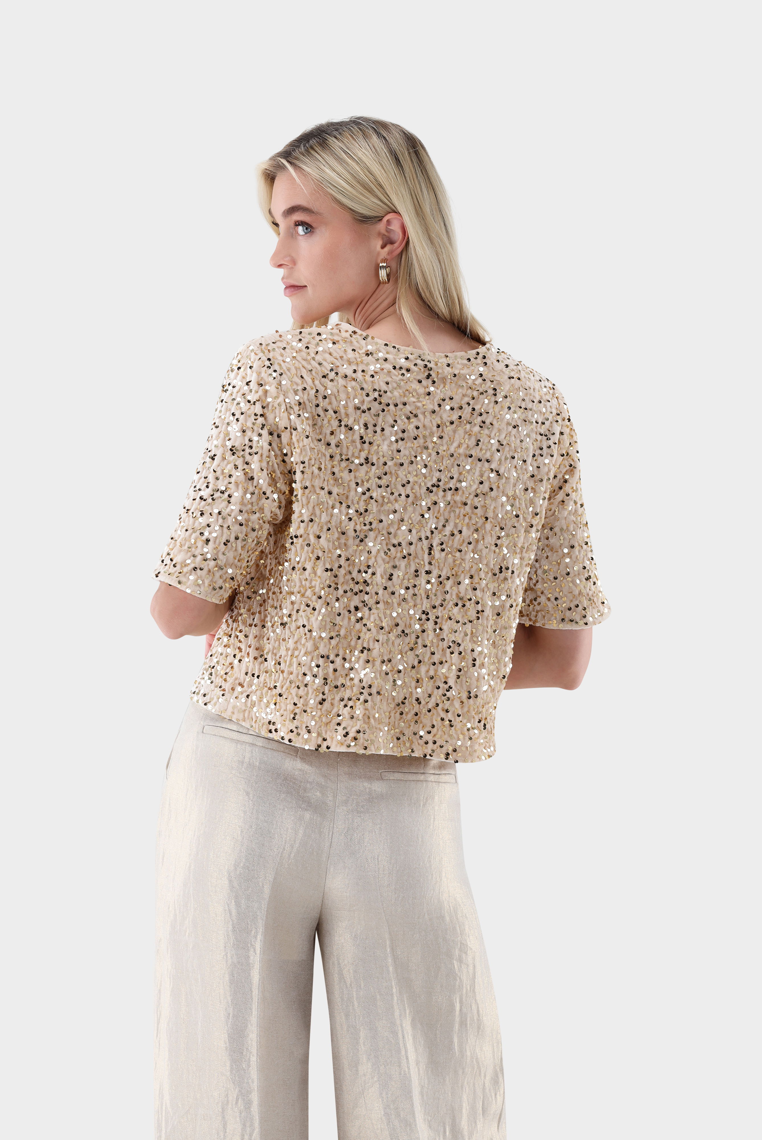 Das kurzarm Pailletten Top verfügt über einen Boxy Fit und eignet sich ideal für festive Anlässe. Die lockere geschittene Passform, und eine leichte Fütterung sorgen für einen angenehmen Tragekomfort.
