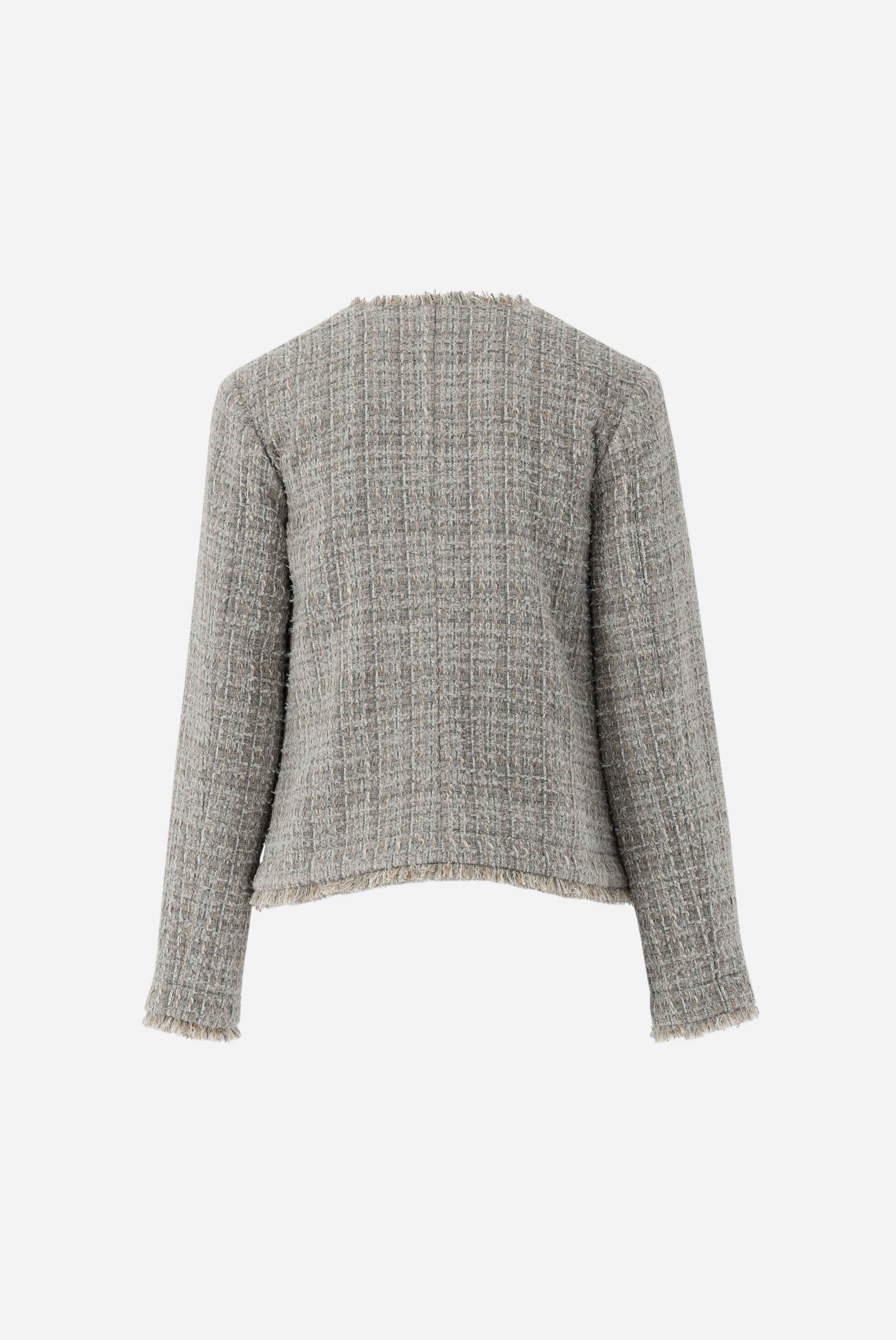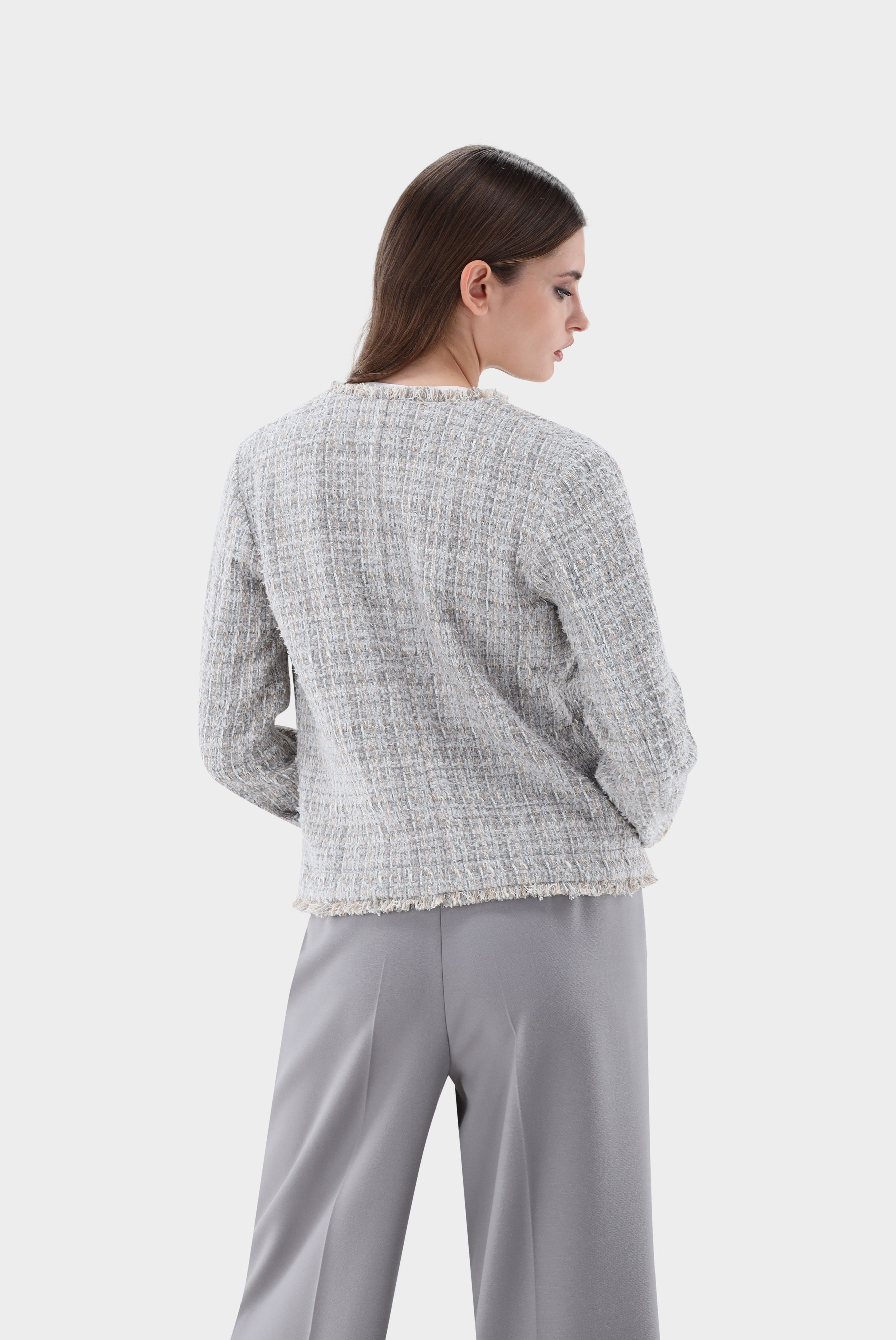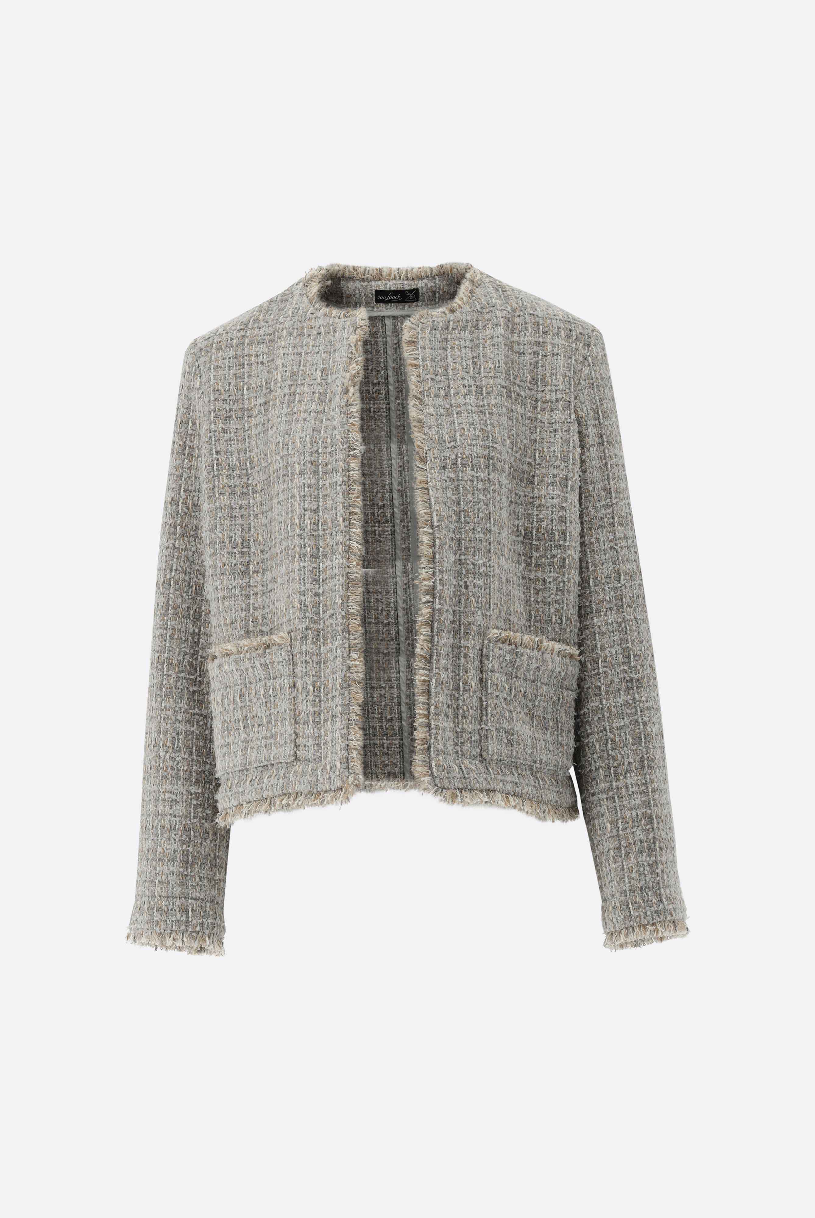 Tweedjacke mit halb tailliertem Schnitt, langen Ärmeln, kragenlos, offener Front, gefransten Kanten und zwei aufgesetzten Taschen. Diese Jacke ist ungefüttert und eignet sich perfekt für geschäftliche und festliche Anlässe.