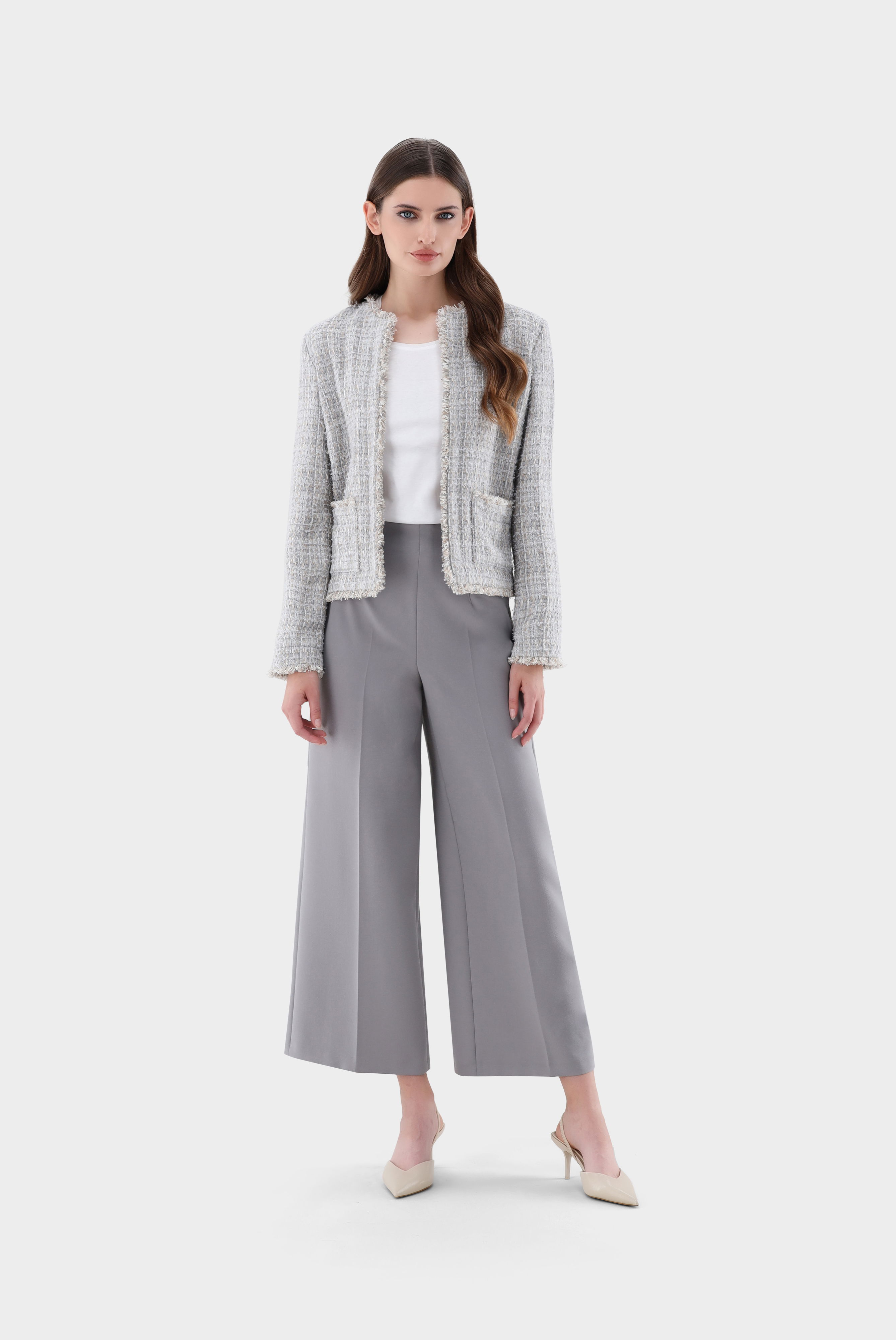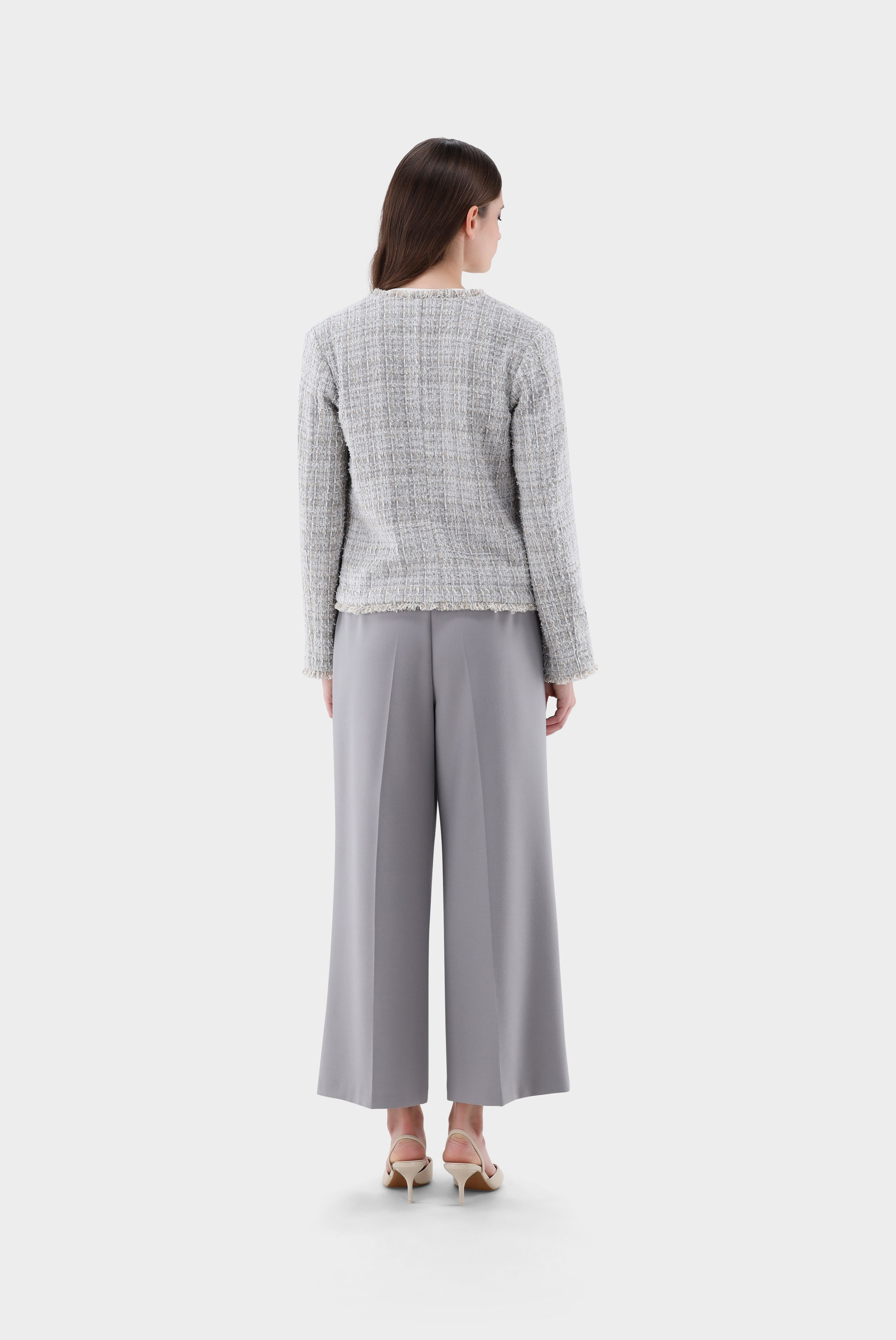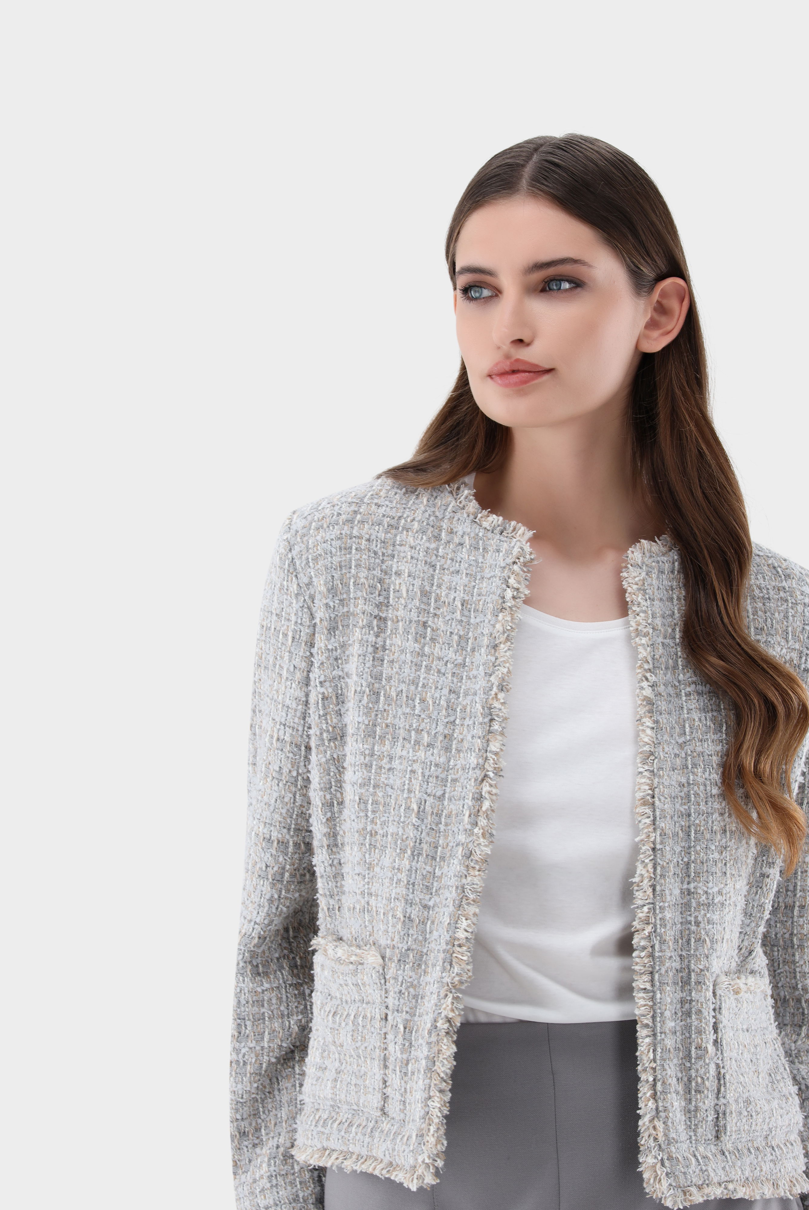 Tweedjacke mit halb tailliertem Schnitt, langen Ärmeln, kragenlos, offener Front, gefransten Kanten und zwei aufgesetzten Taschen. Diese Jacke ist ungefüttert und eignet sich perfekt für geschäftliche und festliche Anlässe.