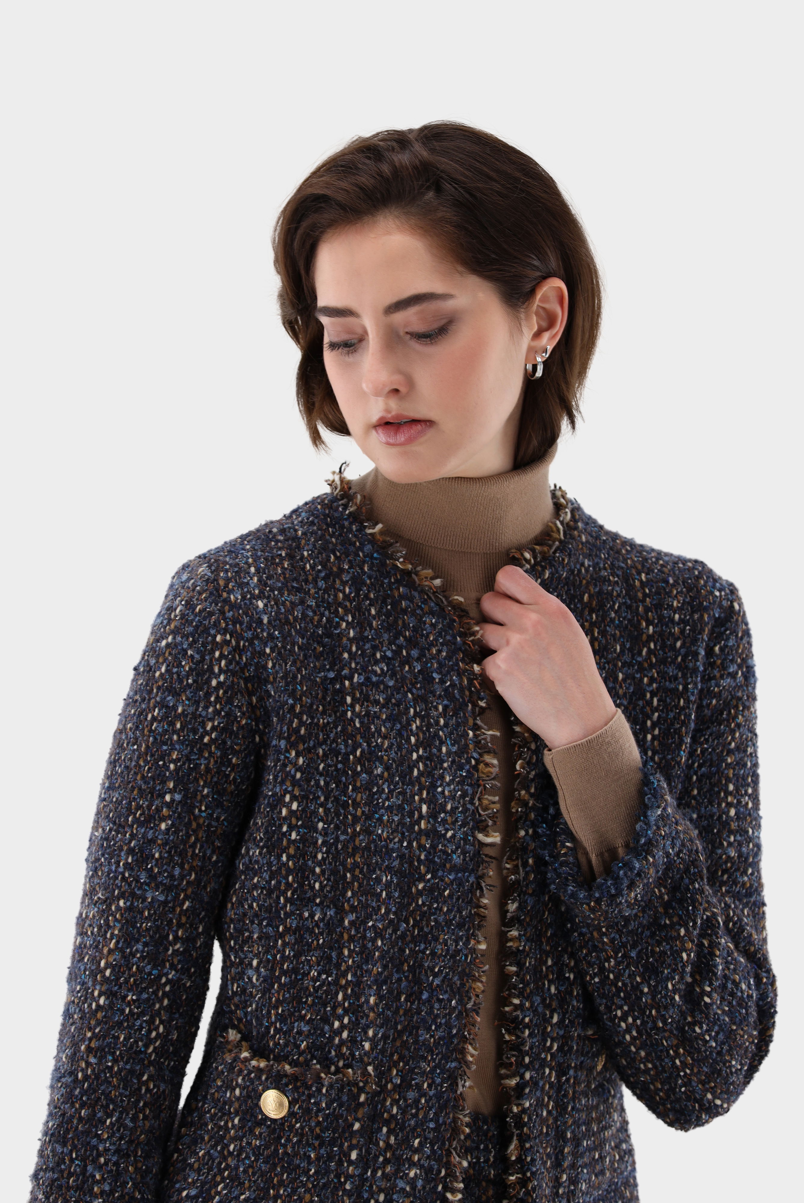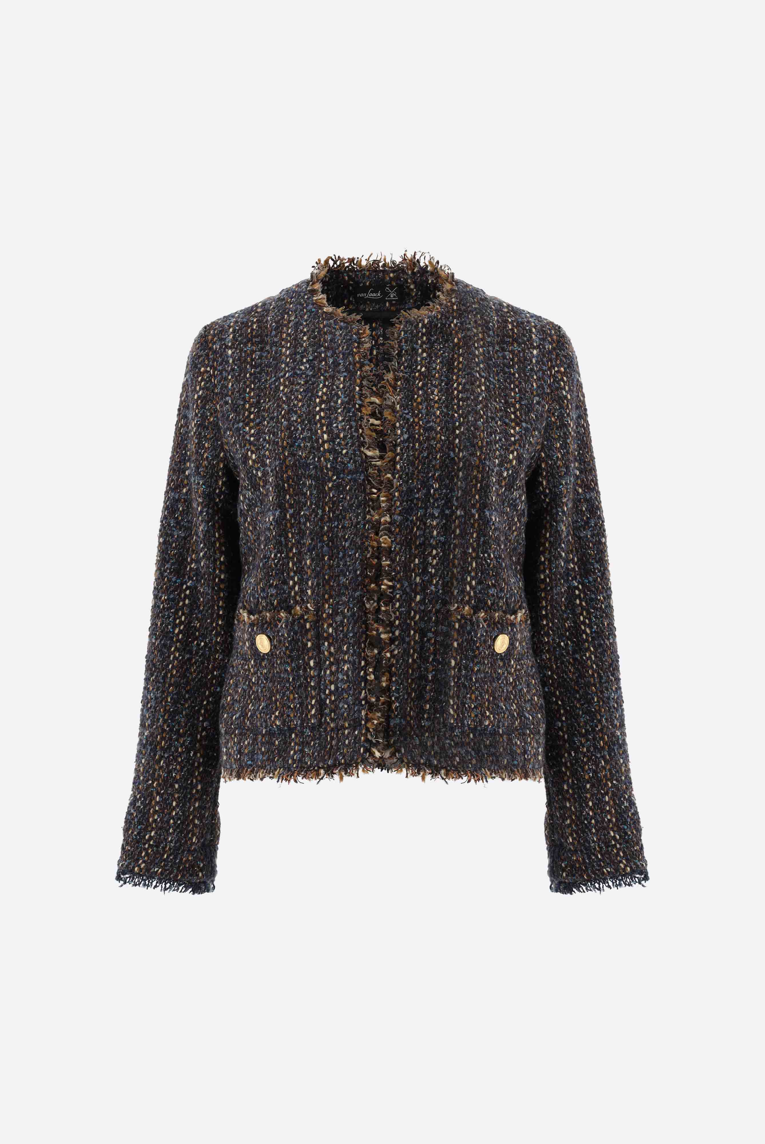 Tweedjacke mit halb tailliertem Schnitt, langen Ärmeln, kragenlos, offener Front, gefransten Kanten und zwei aufgesetzten Taschen. Diese Jacke ist ungefüttert und eignet sich perfekt für geschäftliche und festliche Anlässe.