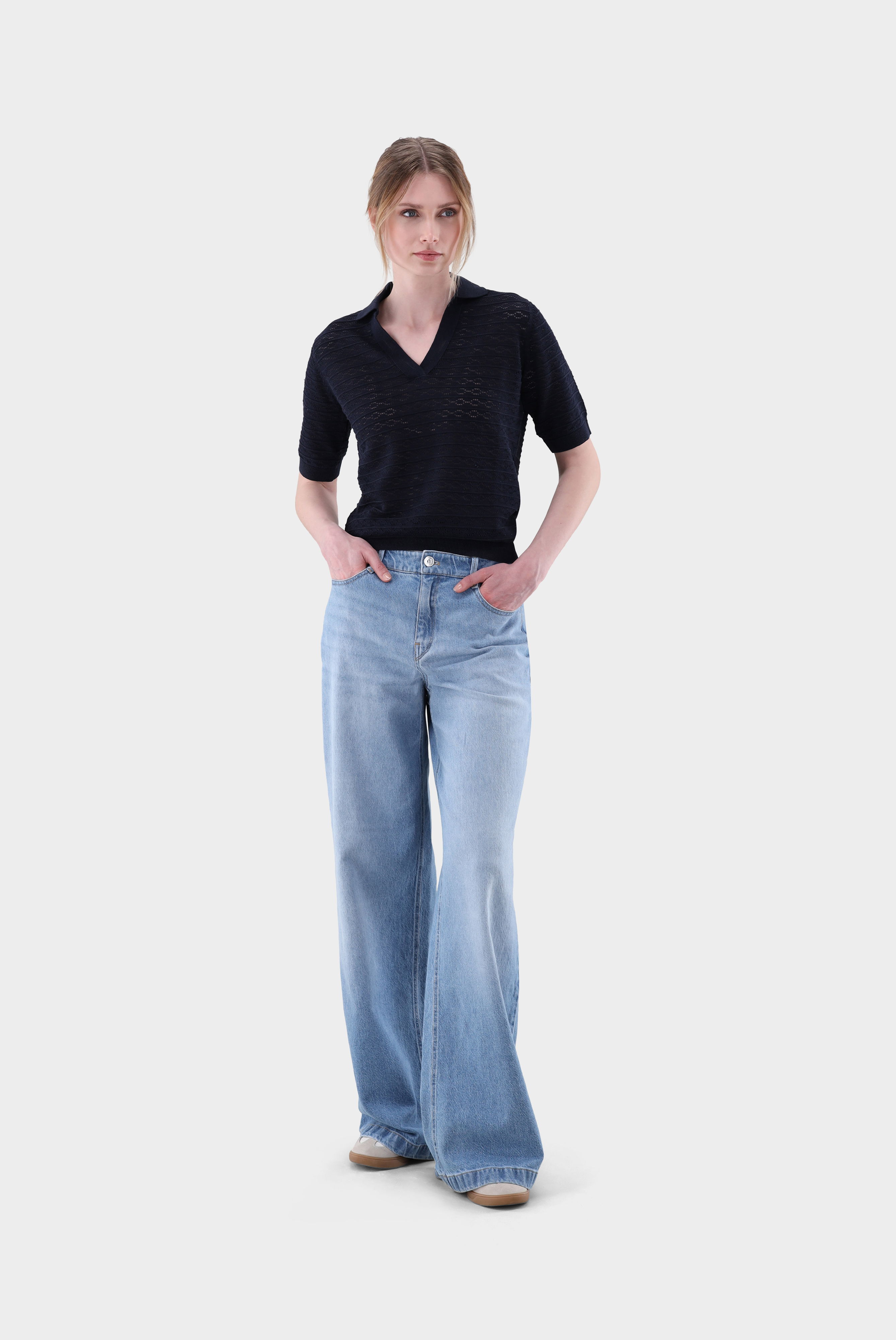 V-Polo mit Ajourmuster, aus Air Cotton. Dieses Produkt überzeugt durch den Tragekomfort und die hochwertige Verarbeitung. Der Einsatz gezwirnter feinster Baumwollgarne in einem gestrickten Spitzenmuster sorgt für besondere Luftdurchlässigkeit und kreiert einen modern romantischen Look.