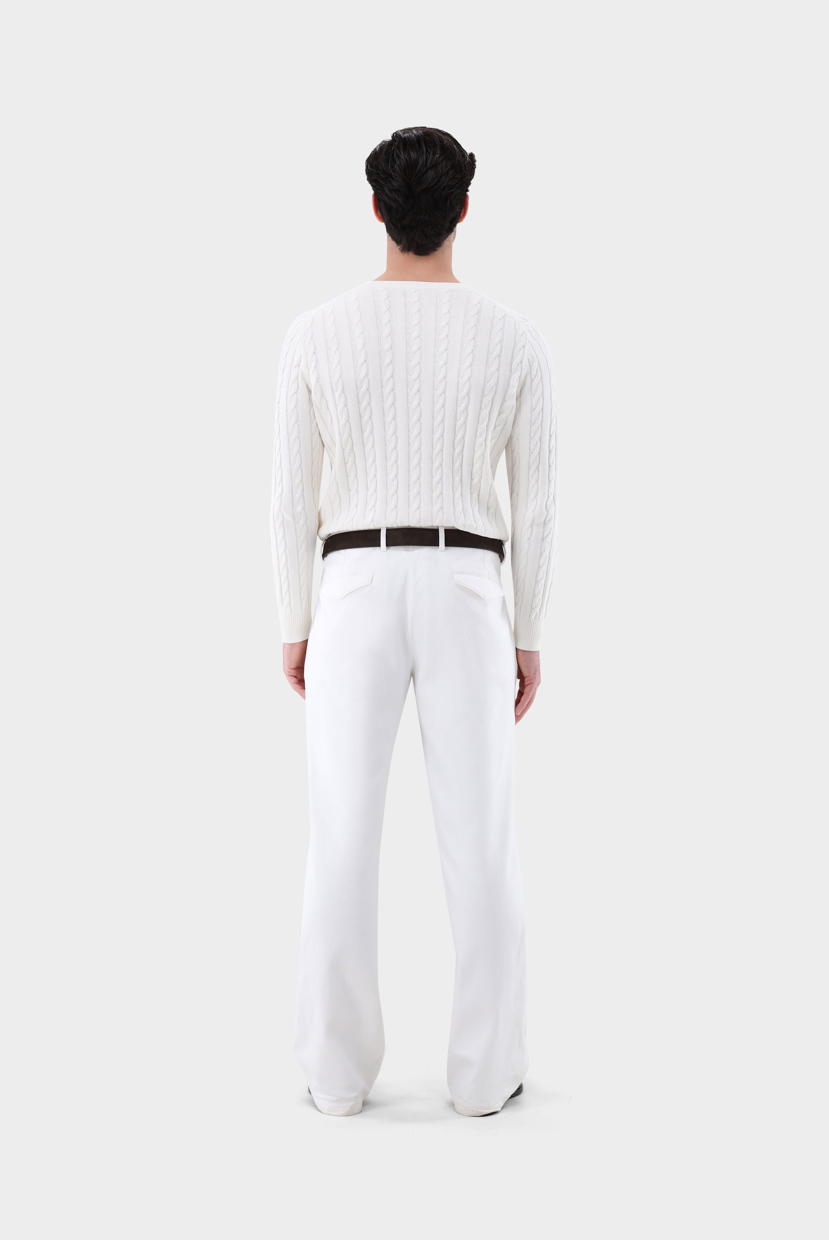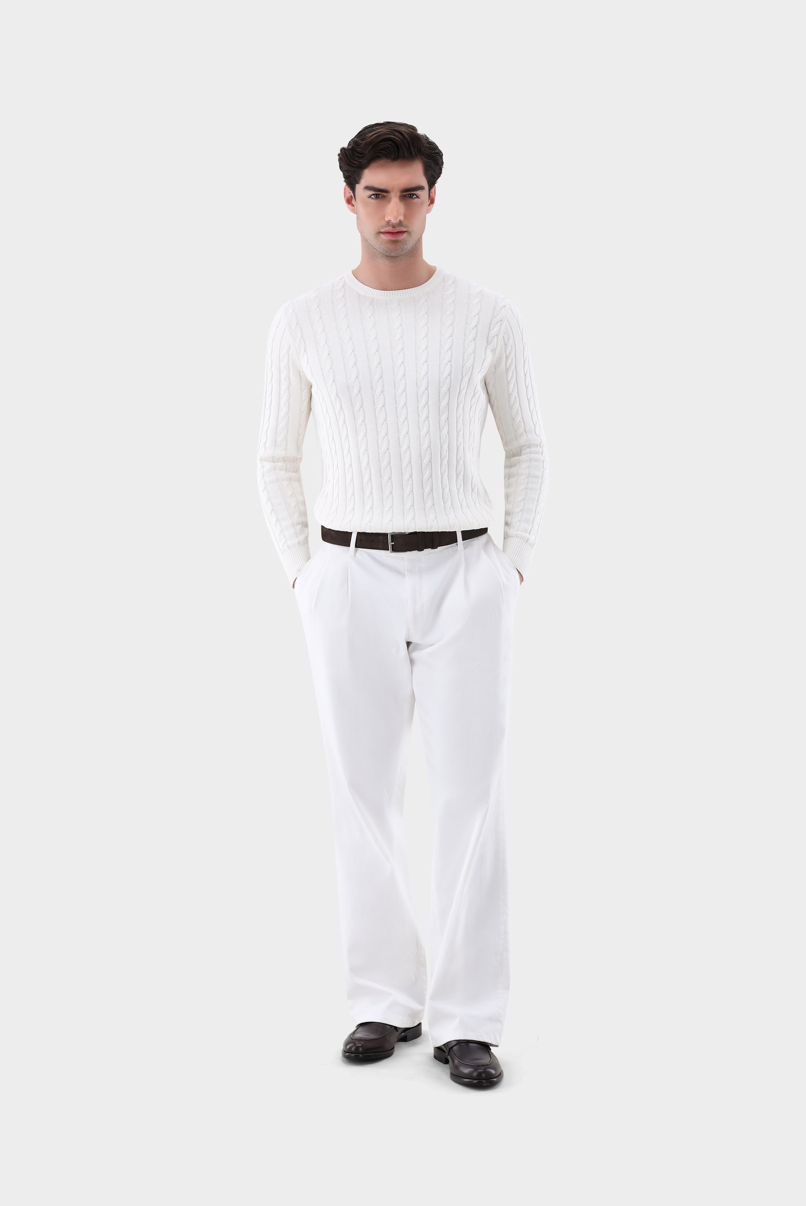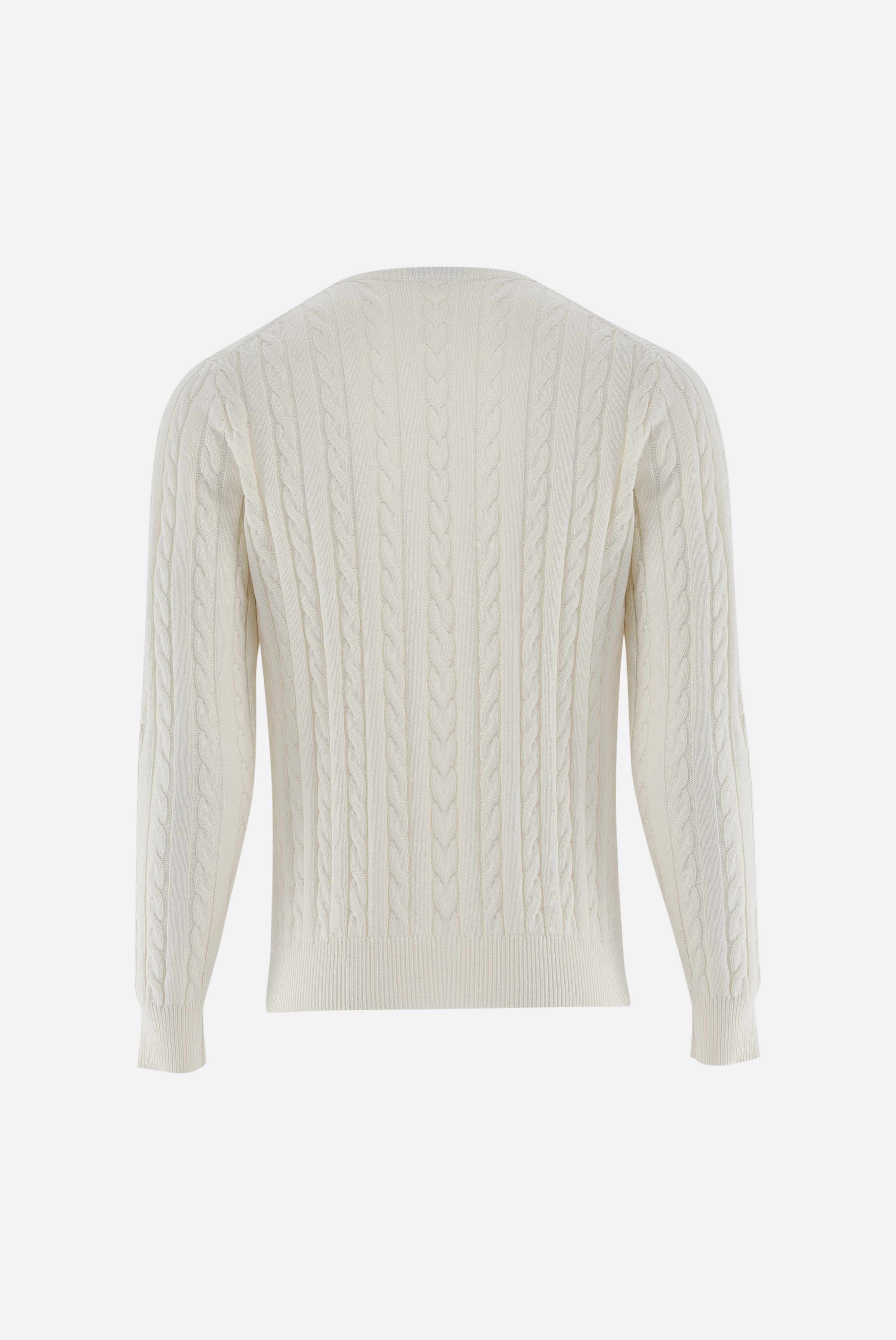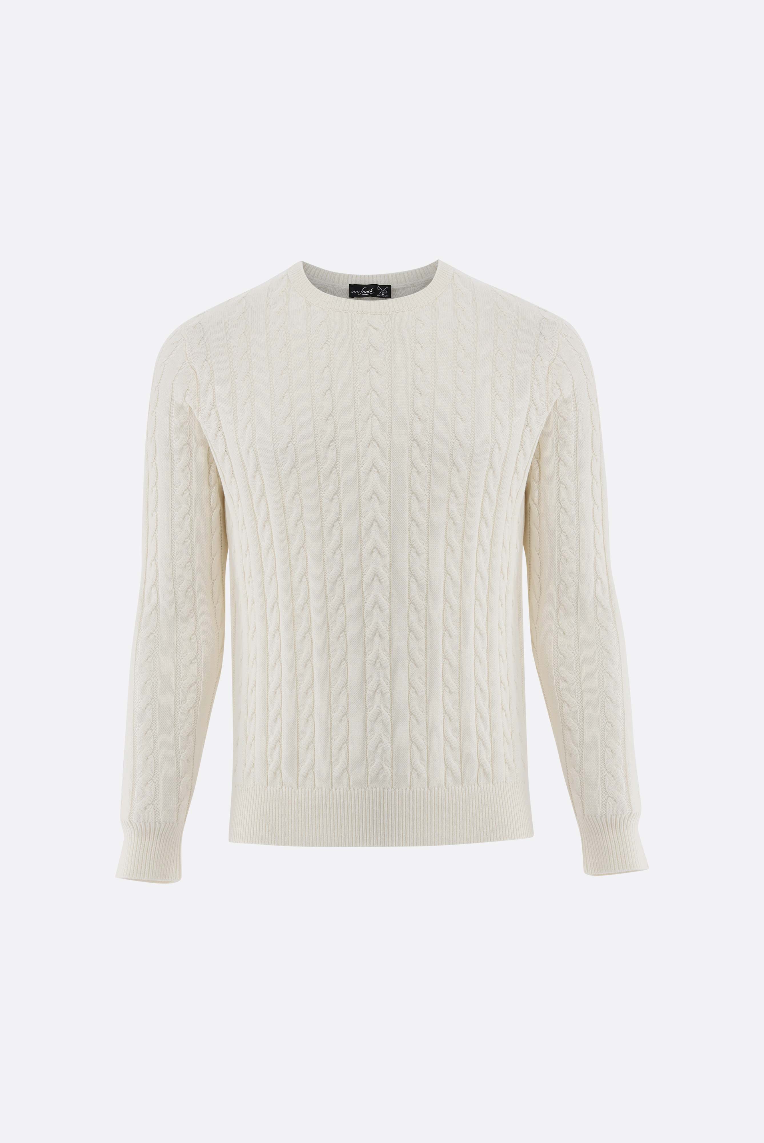 Der Rundhalspullover mit Zopfmuster wird mit Baumwolle und Seide gefertigt und bietet luxuriöse Weichheit. Das klassische Zopfmuster verleiht ihm einen eleganten Look, während der Rundhalsausschnitt für eine klassische Silhouette sorgt.