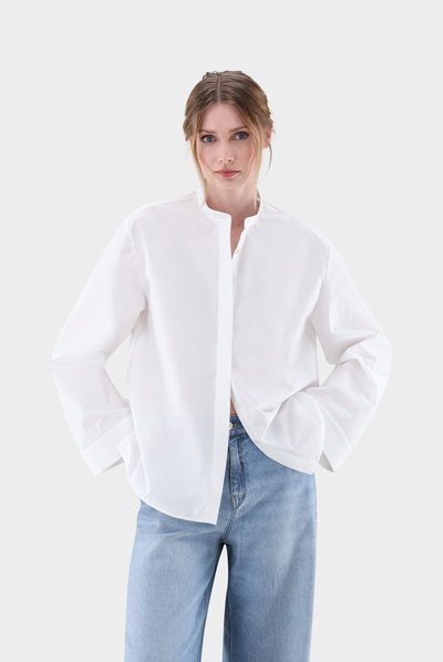 This wide blouse impresses with long, wide sleeves and a small stand-up collar. The front hem is straight, while the back hem is longer. Made of cotton fil-à-fil, the blouse is suitable for both business and casual looks. The single-breasted, large cuff is another special detail.
