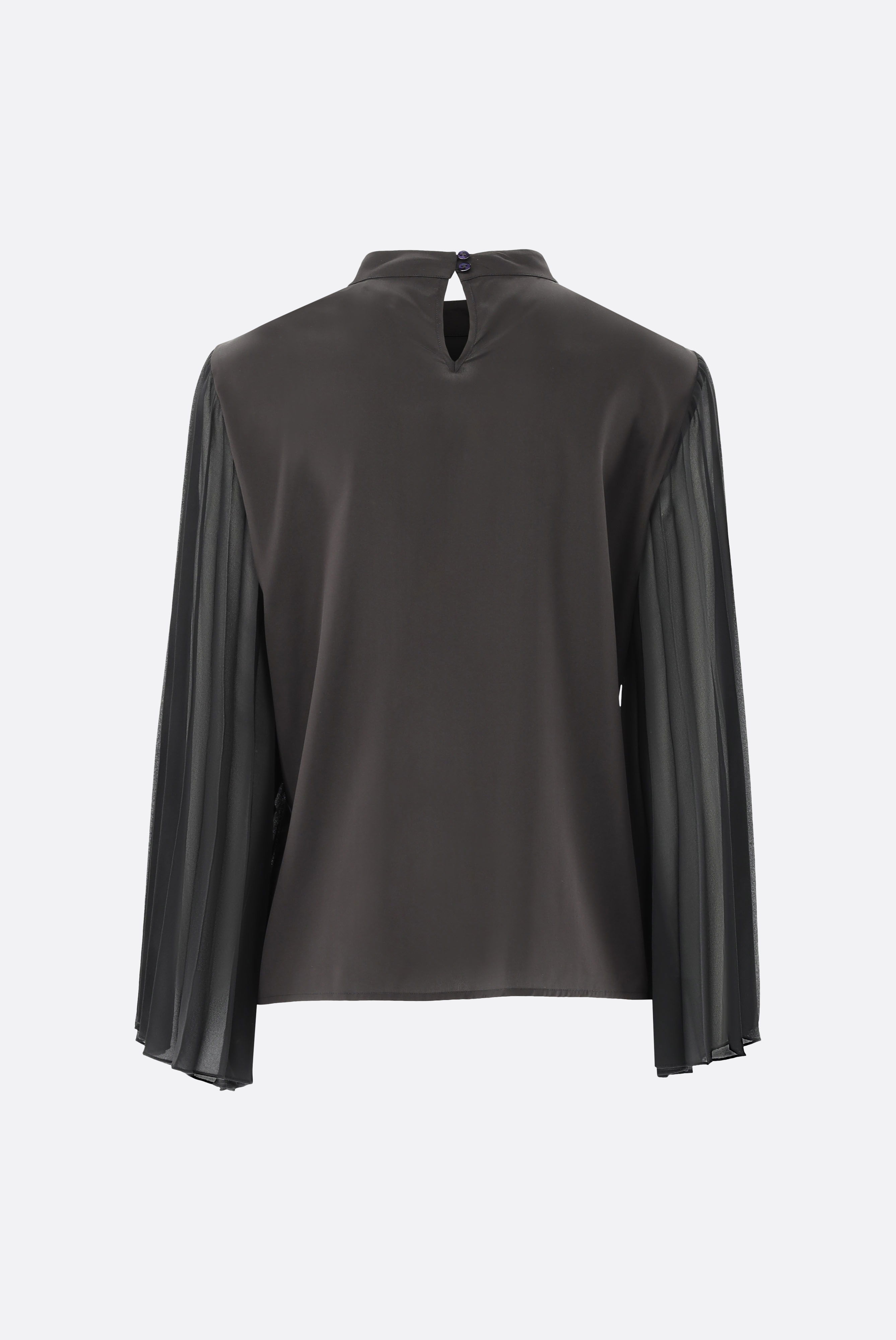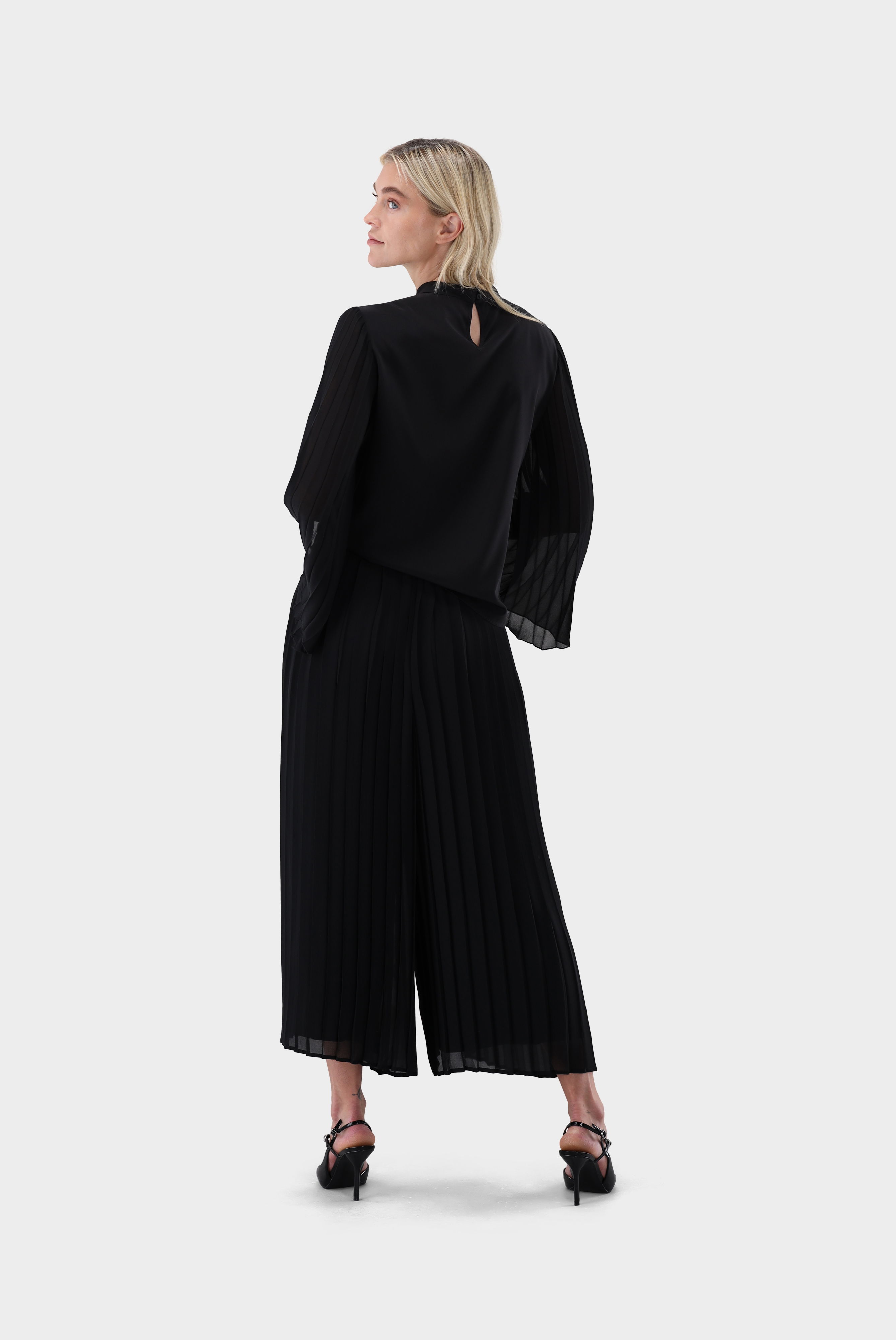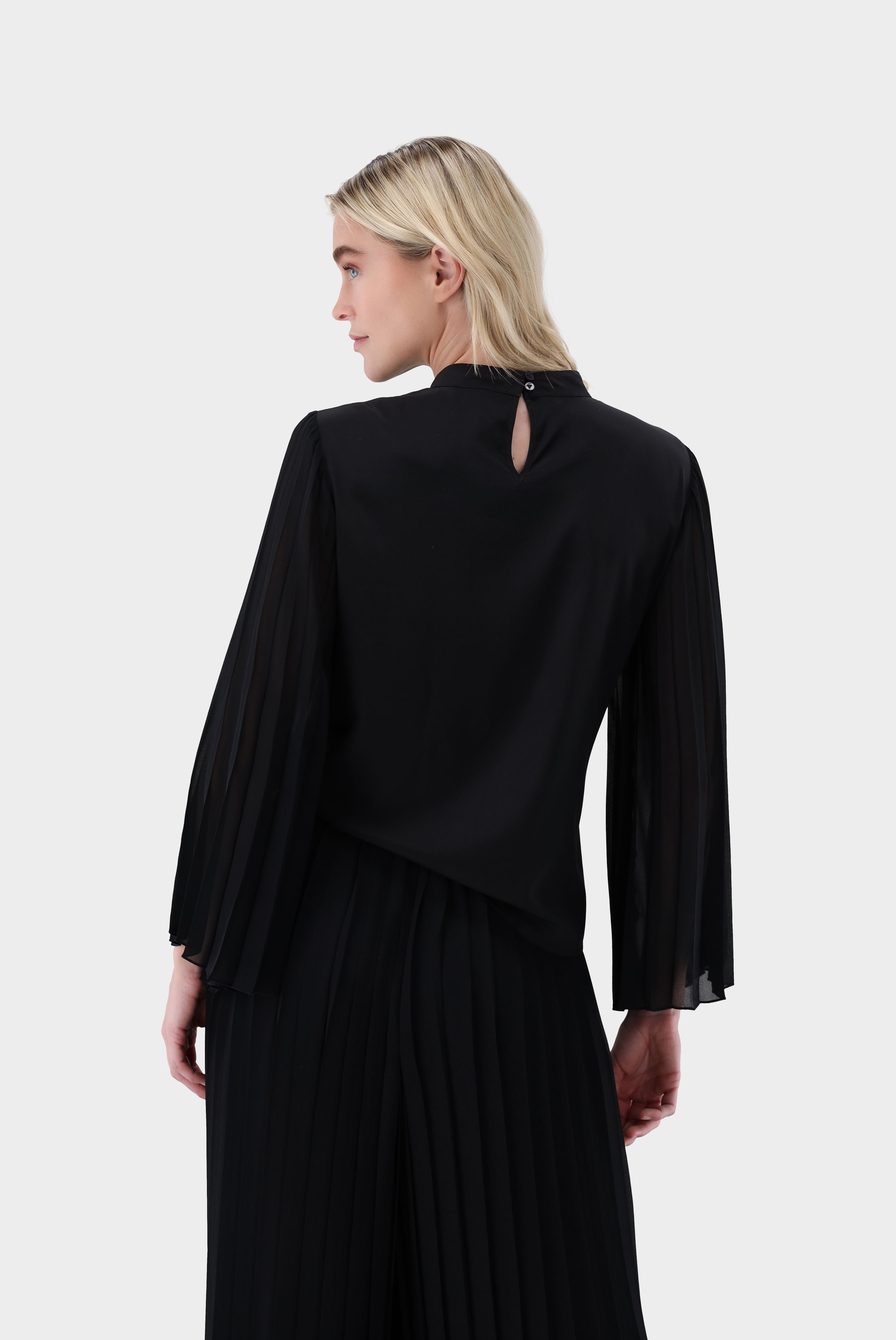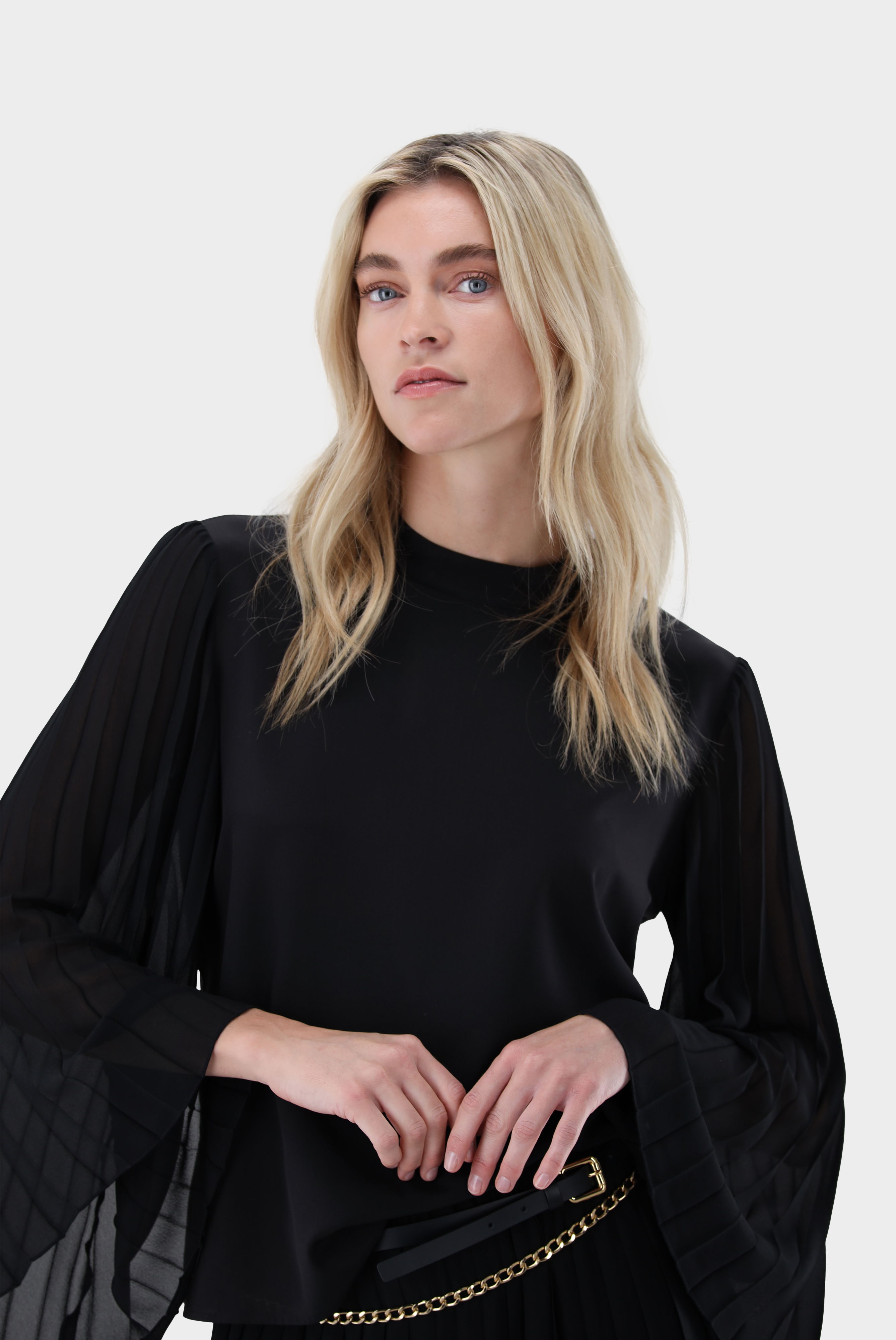 This elegant blouse features a sophisticated stand-up collar. The pleated, wide sleeves are particularly refined, lending the design an airy and festive feel. The high-quality material combination ensures a luxurious feel and a flowing drape. Combined with the matching Recha skirt, it creates a stylish total look, ideal for special occasions and sophisticated appearances.