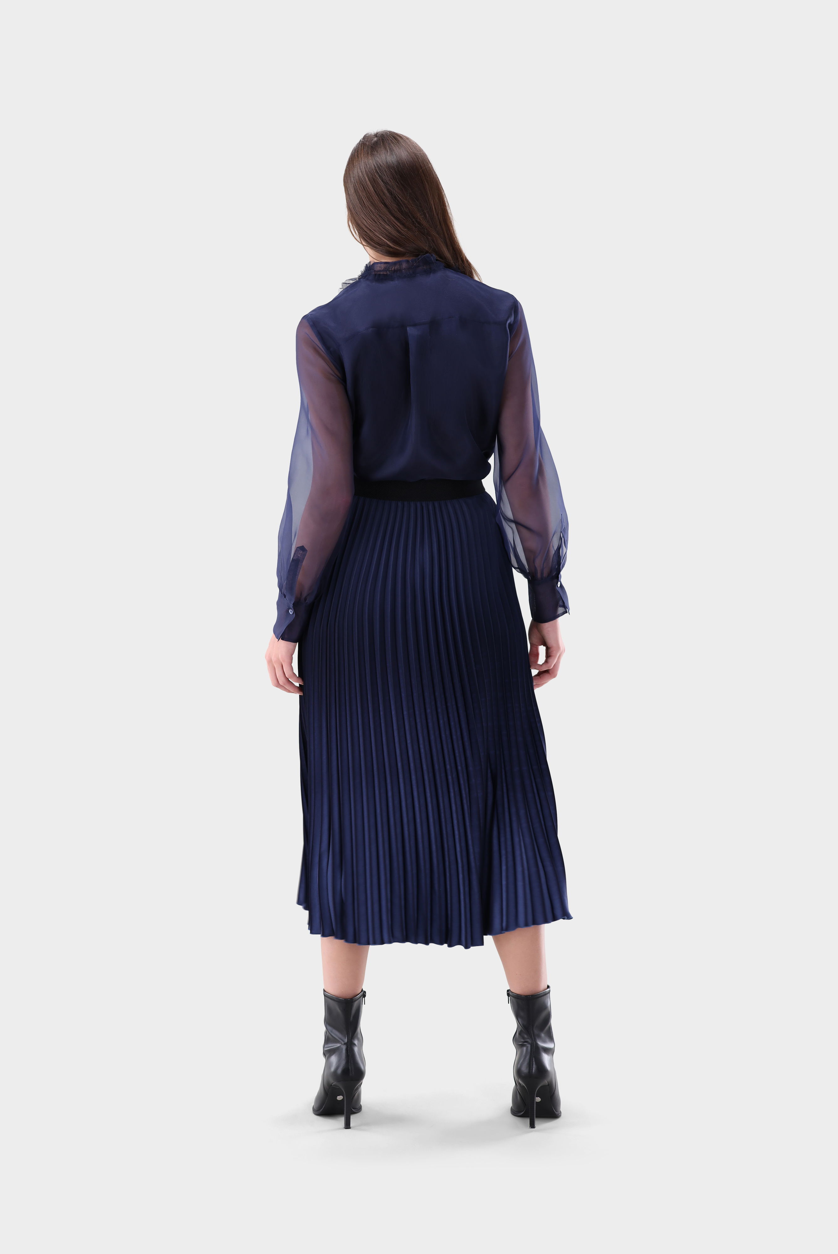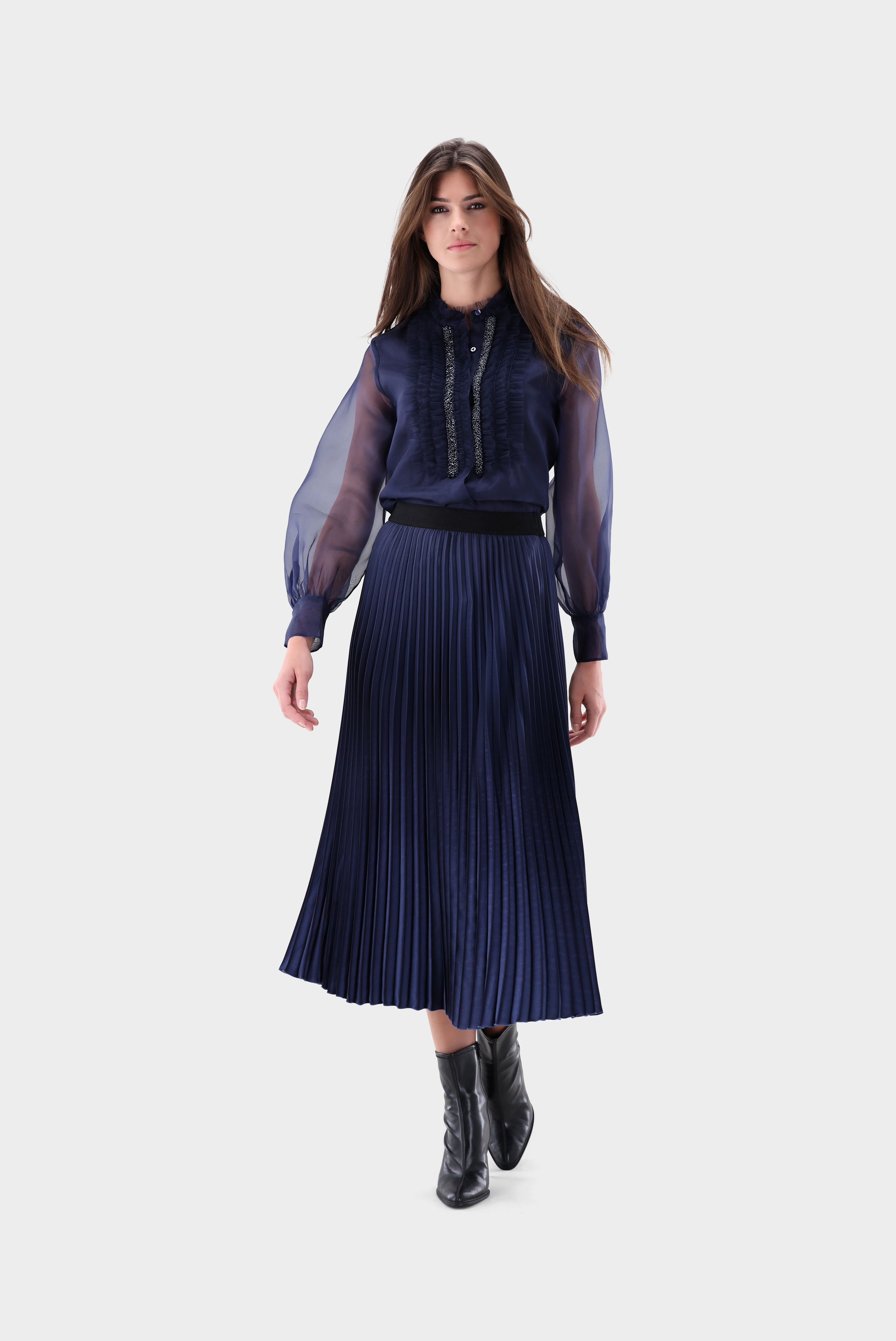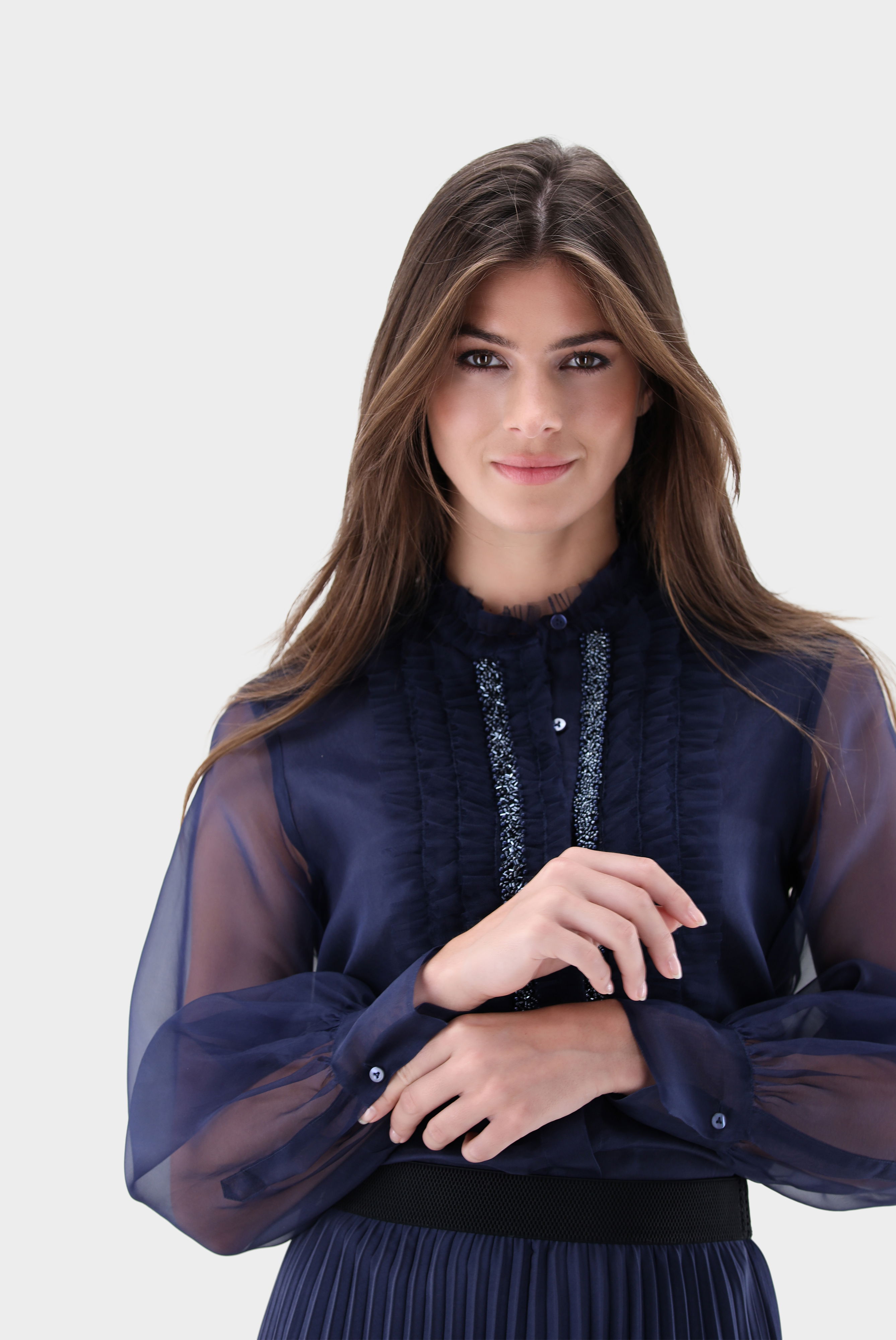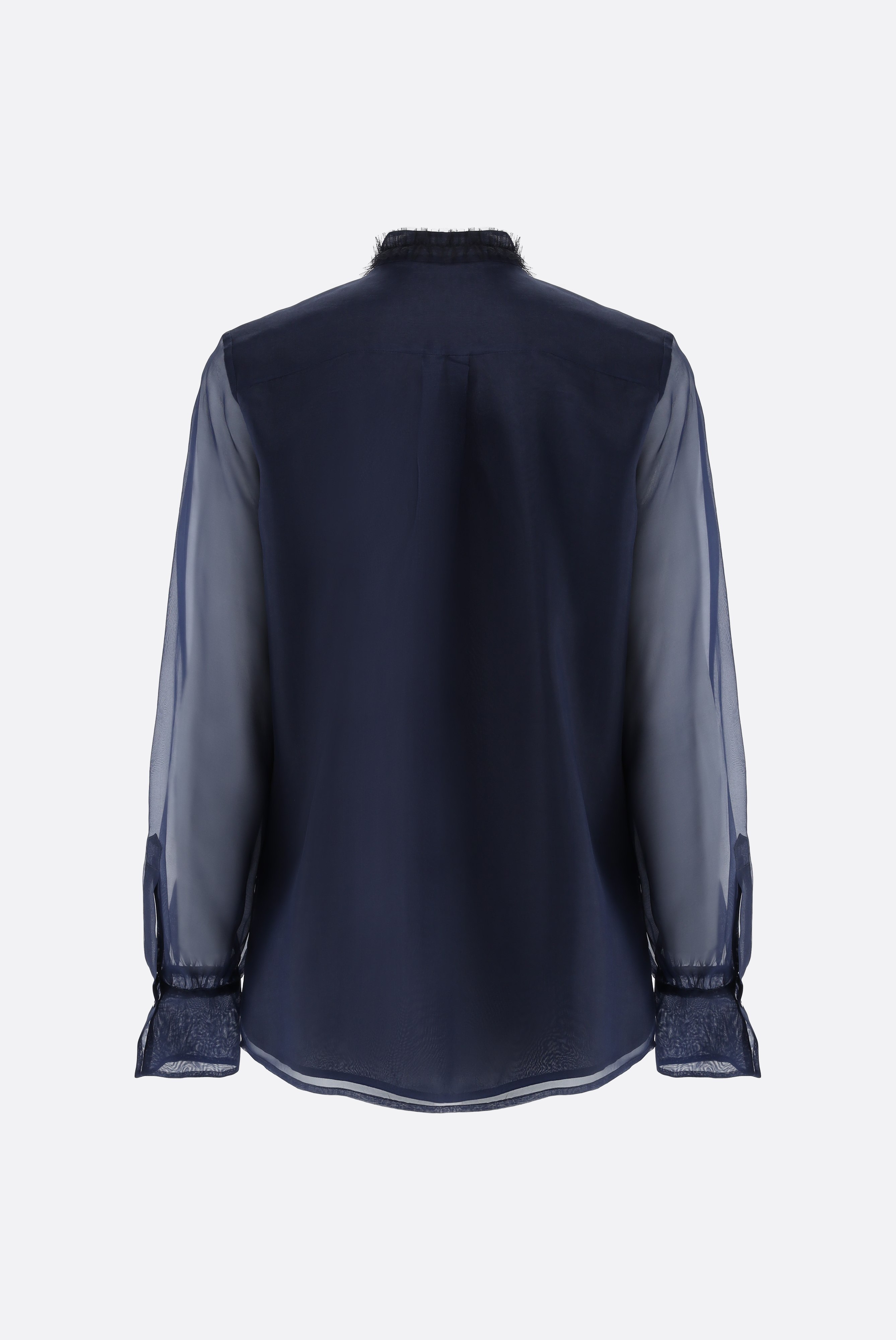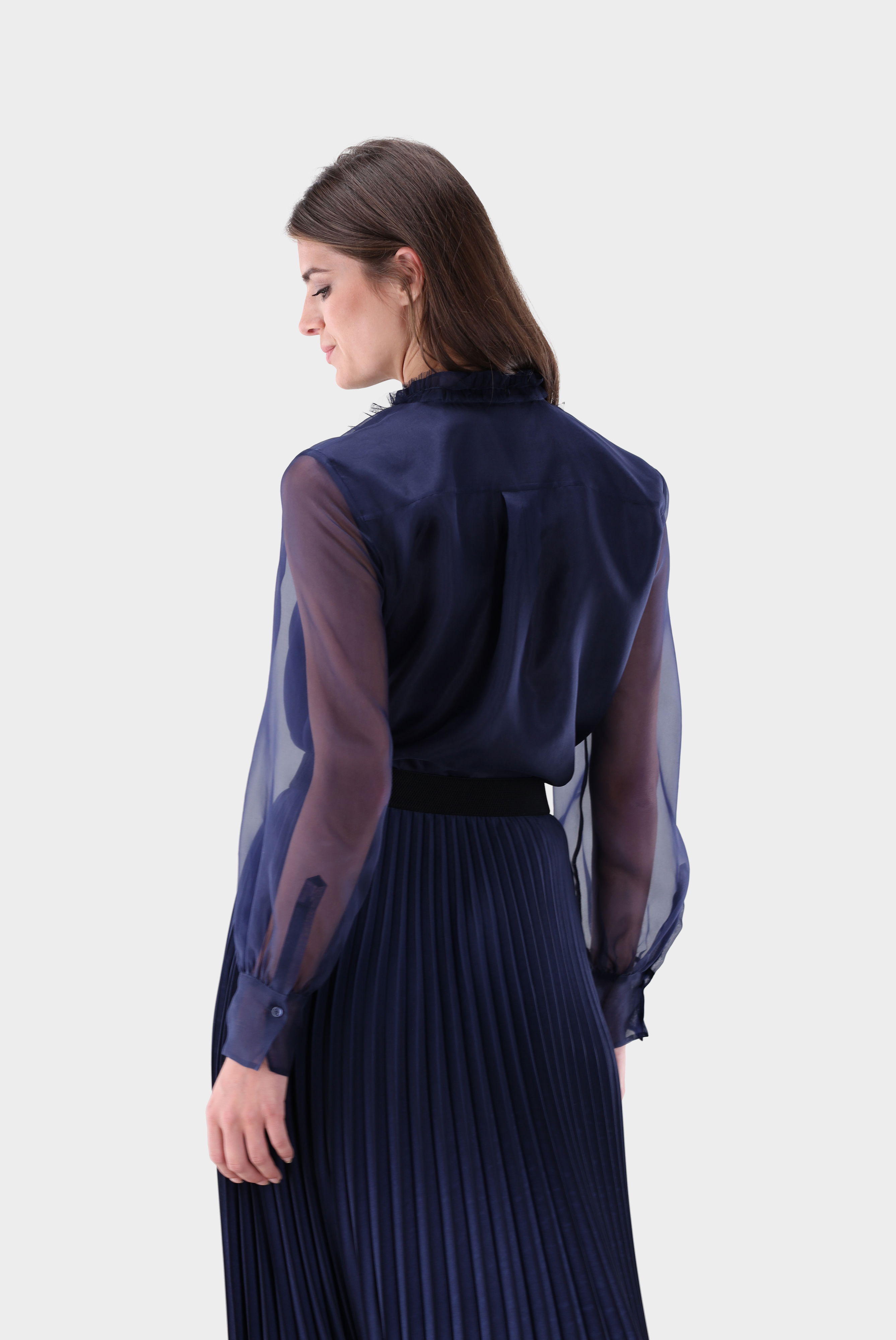Loose-fitting blouse made of fine silk organza with a Habotai silk lining for a lightweight feel. It features long sleeves gathered at the cuffs and a slightly flared hem for a modern silhouette. The back yoke with box pleat provides additional comfort and freedom of movement. A concealed button placket, stand-up collar, and subtle ruffles on the collar, button placket, and front add subtle accents, complemented by an elegant pearl ribbon next to the button placket. A high-quality blouse ideal for sophisticated and stylish outfits.