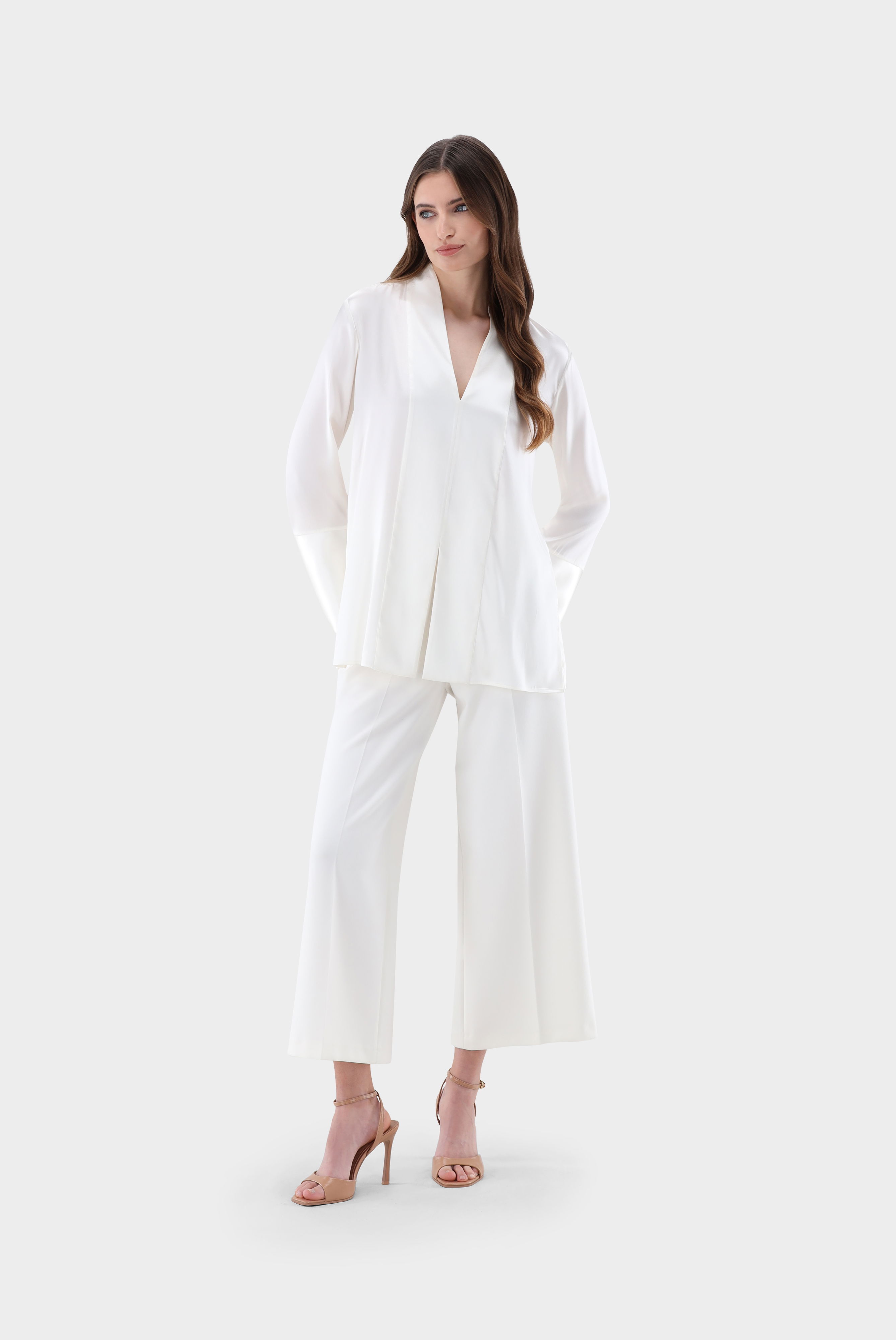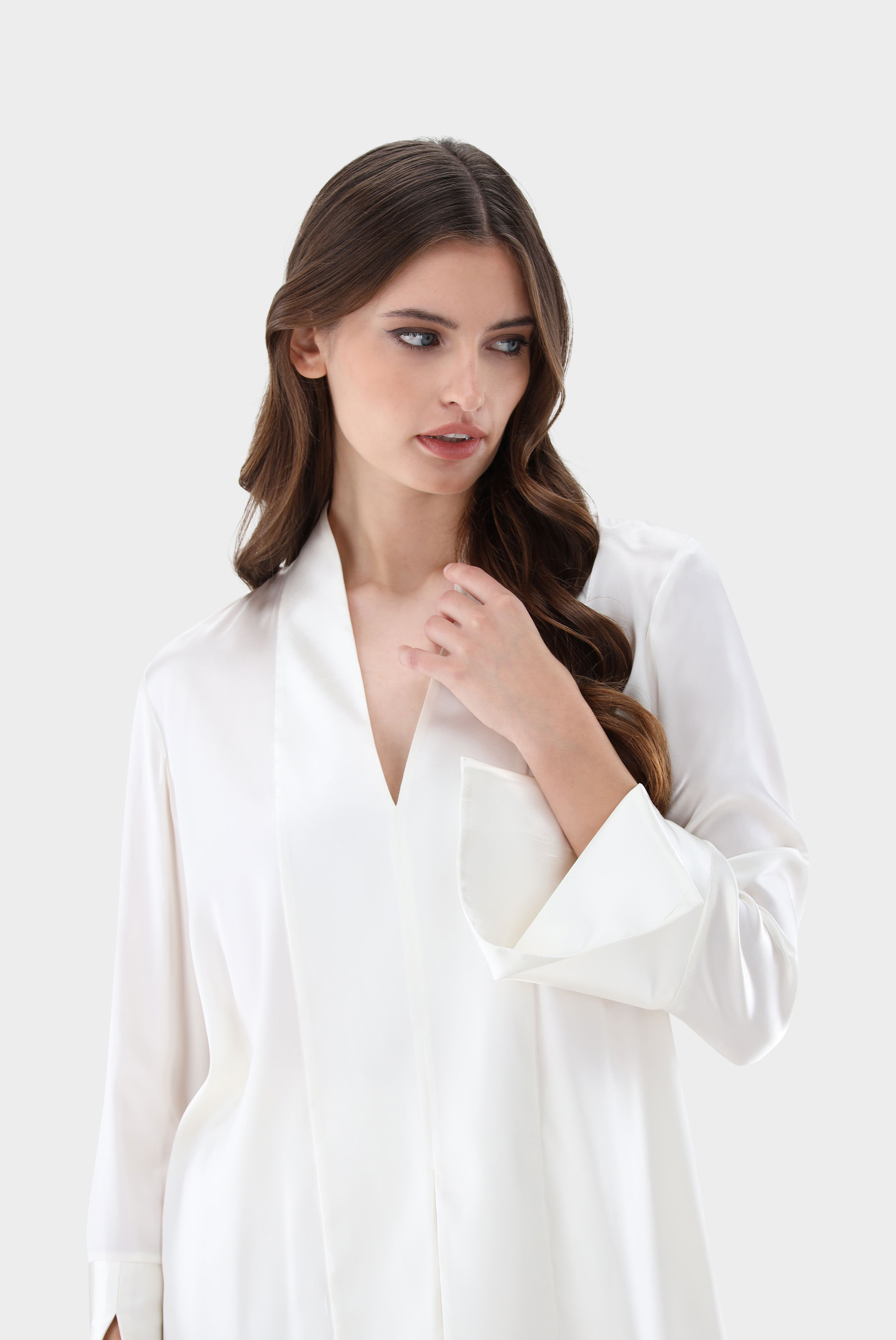 This elegant tunic made from high-quality satin silk impresses with its smooth, shiny fabric and flowing drape. The long slits at the cuffs and sides add a modern, refined touch to the design. The V-neckline provides a feminine look, making it suitable for both casual and business outfits. The stretchy material ensures a comfortable fit and high wearing comfort.