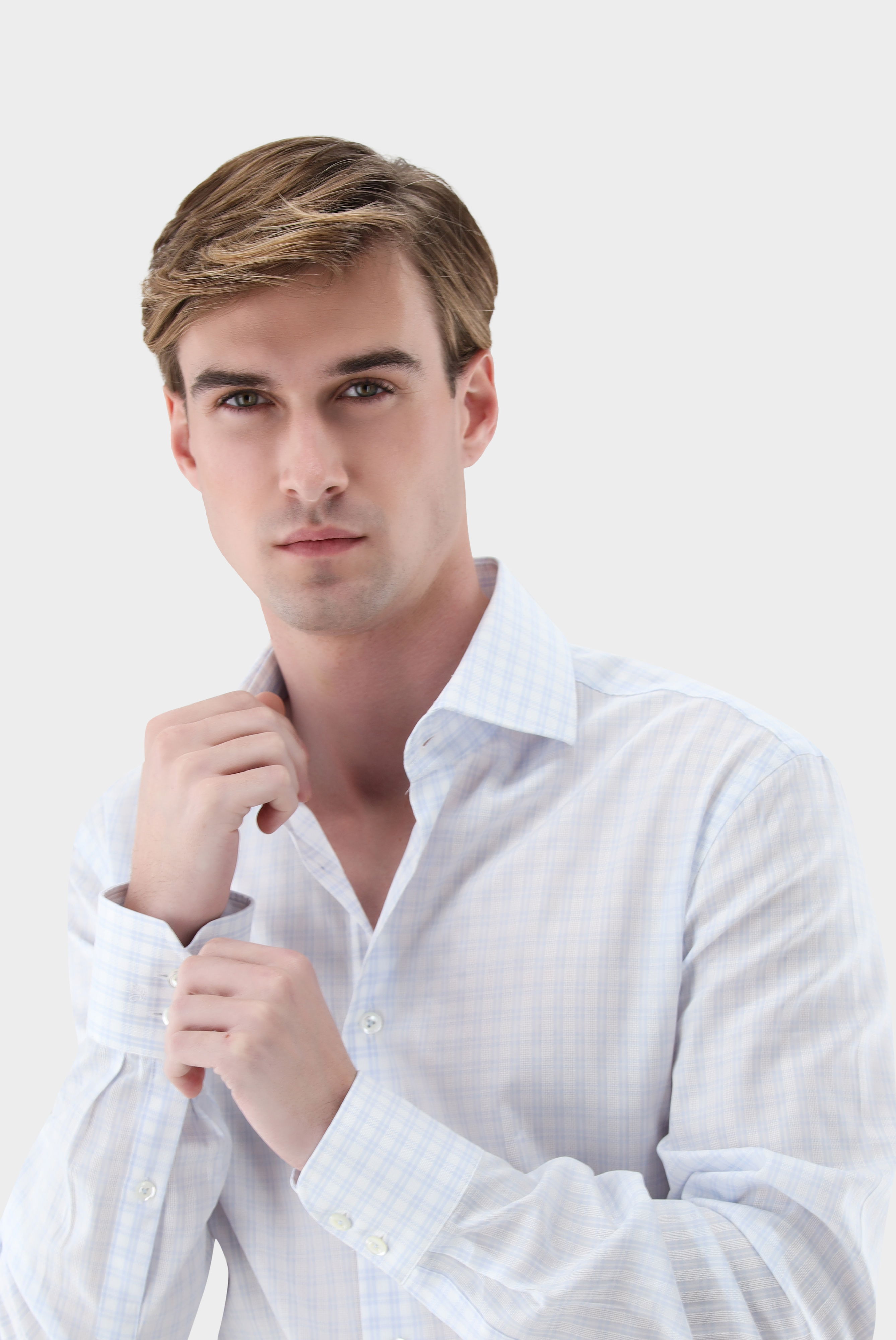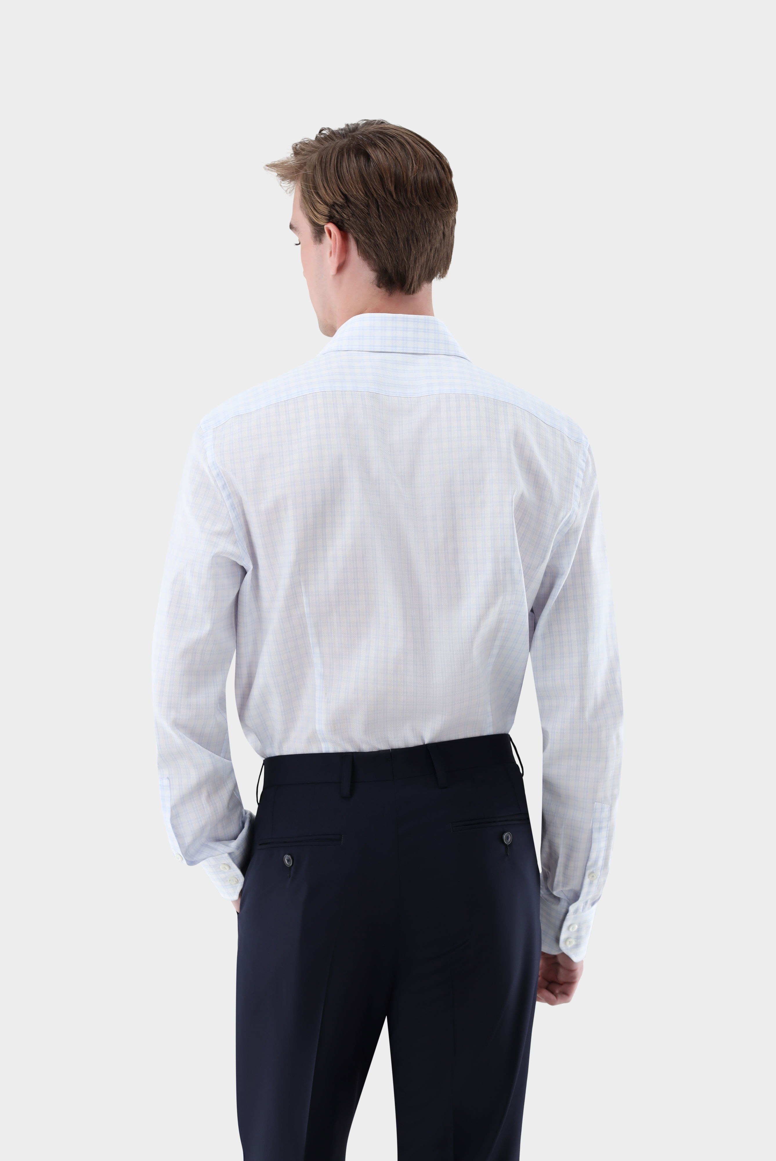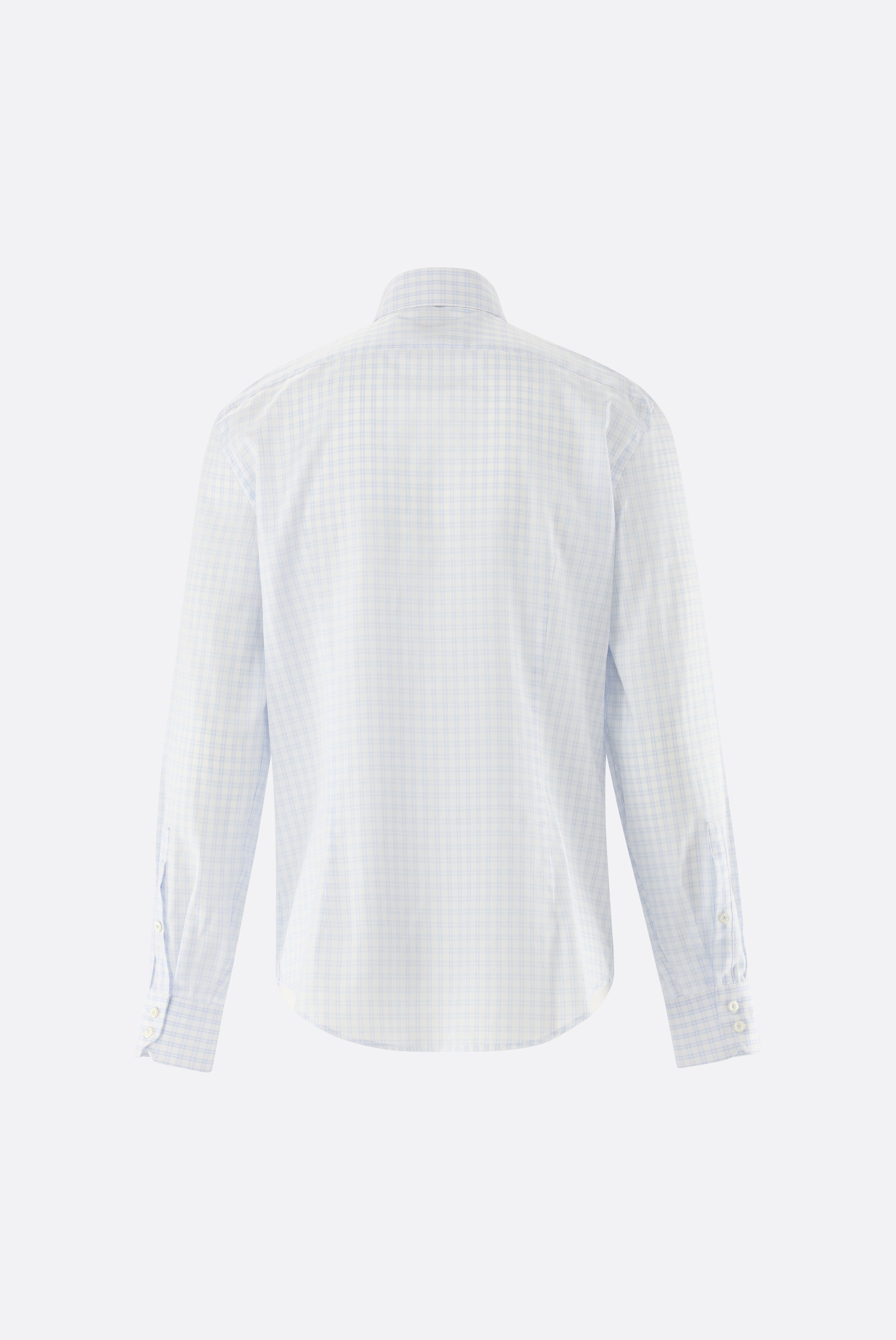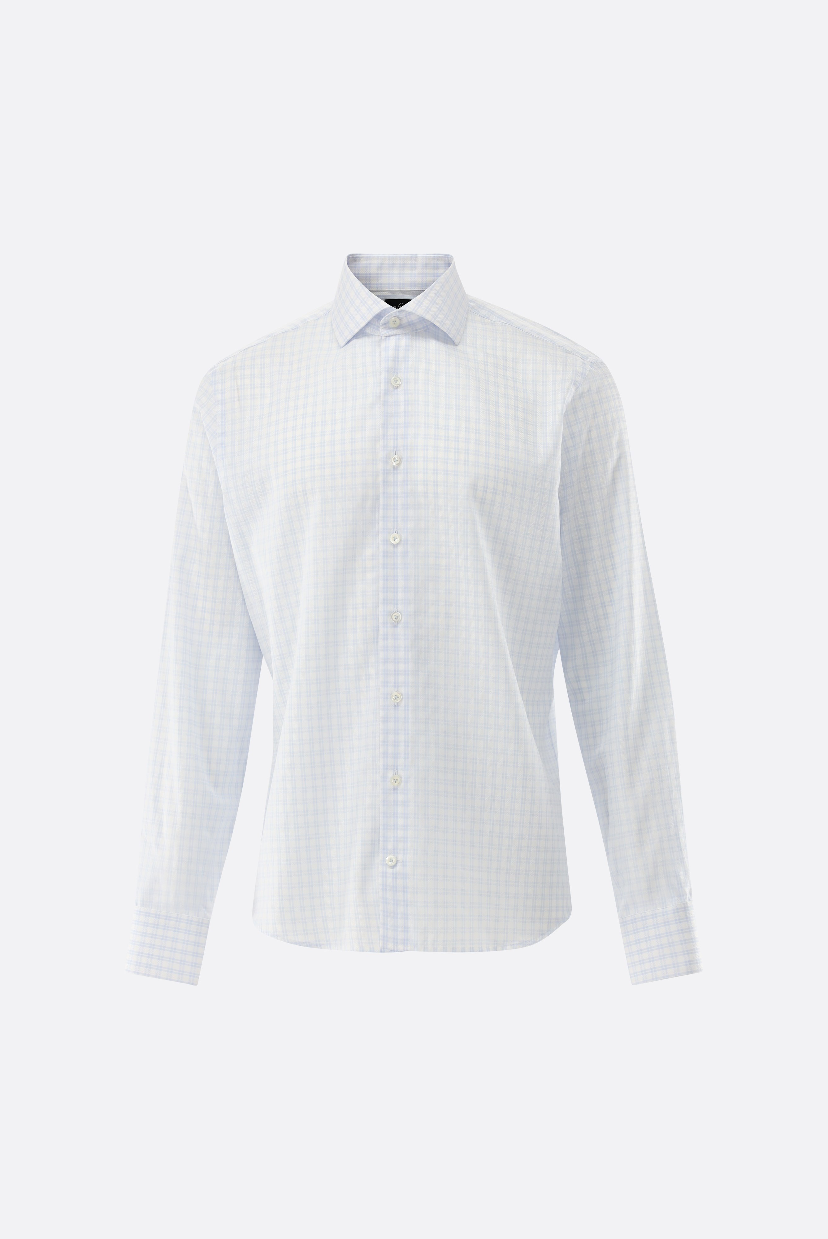 This slim-fit shirt, crafted from fine, textured dobby weave with a basket-weave pattern, impresses with its elegant, close-fitting silhouette. The subtle check pattern with understated contrasting details gives the shirt a modern, stylish look. The shark collar accentuates the contemporary lines, while elegant mother-of-pearl buttons add a touch of sophistication. The fine, pleasantly lightweight material ensures exceptional comfort and makes the shirt ideal for demanding business and smart-casual looks.