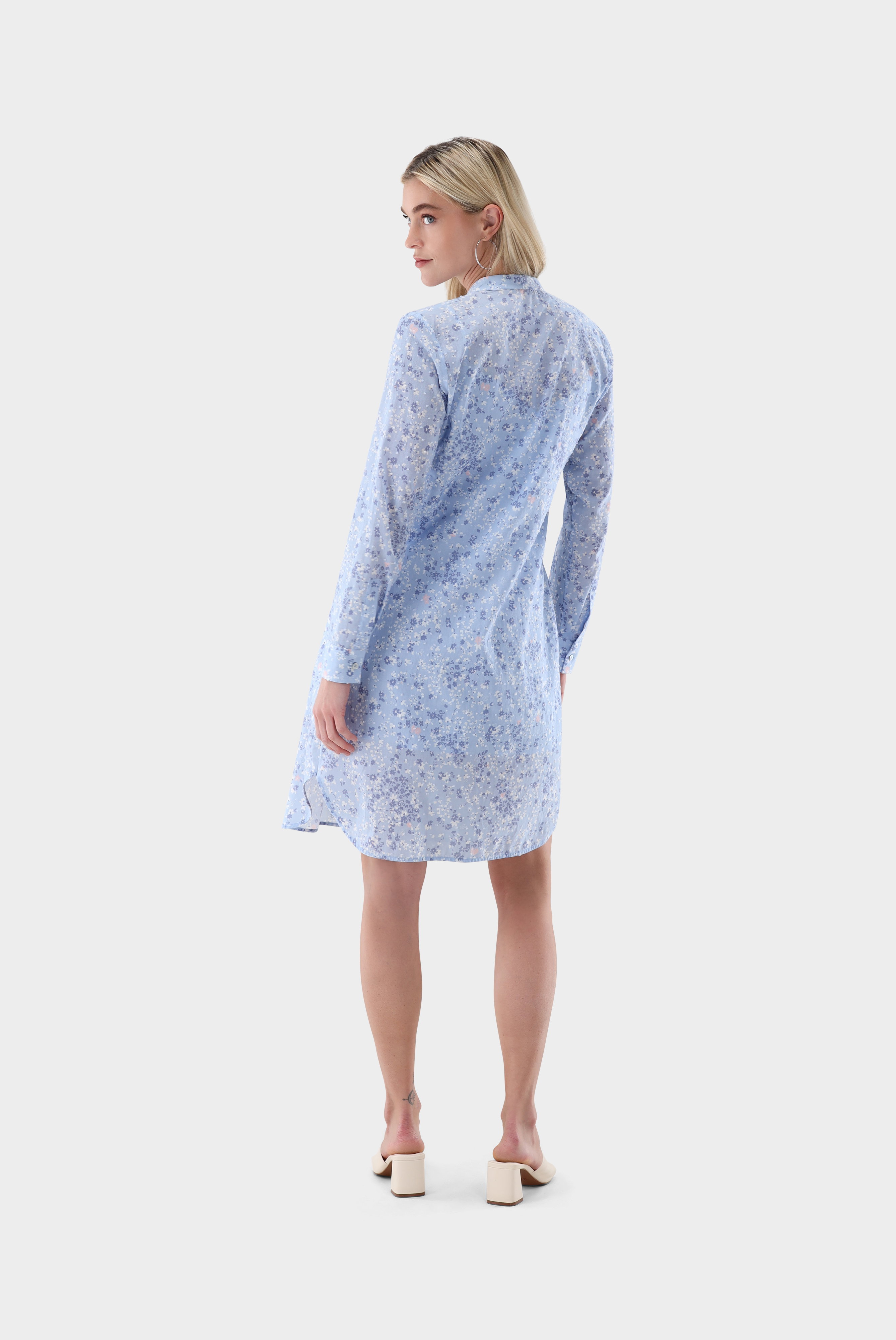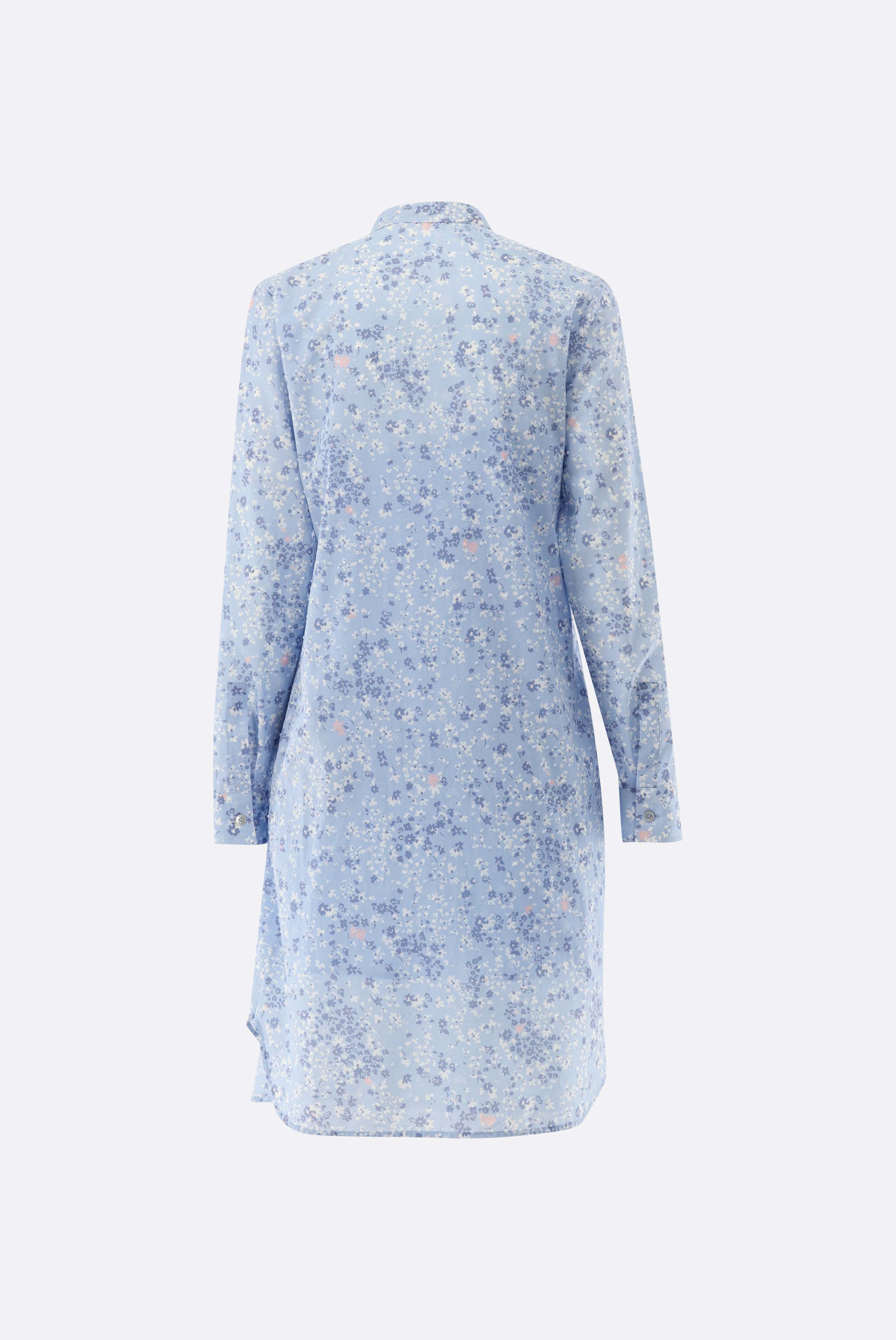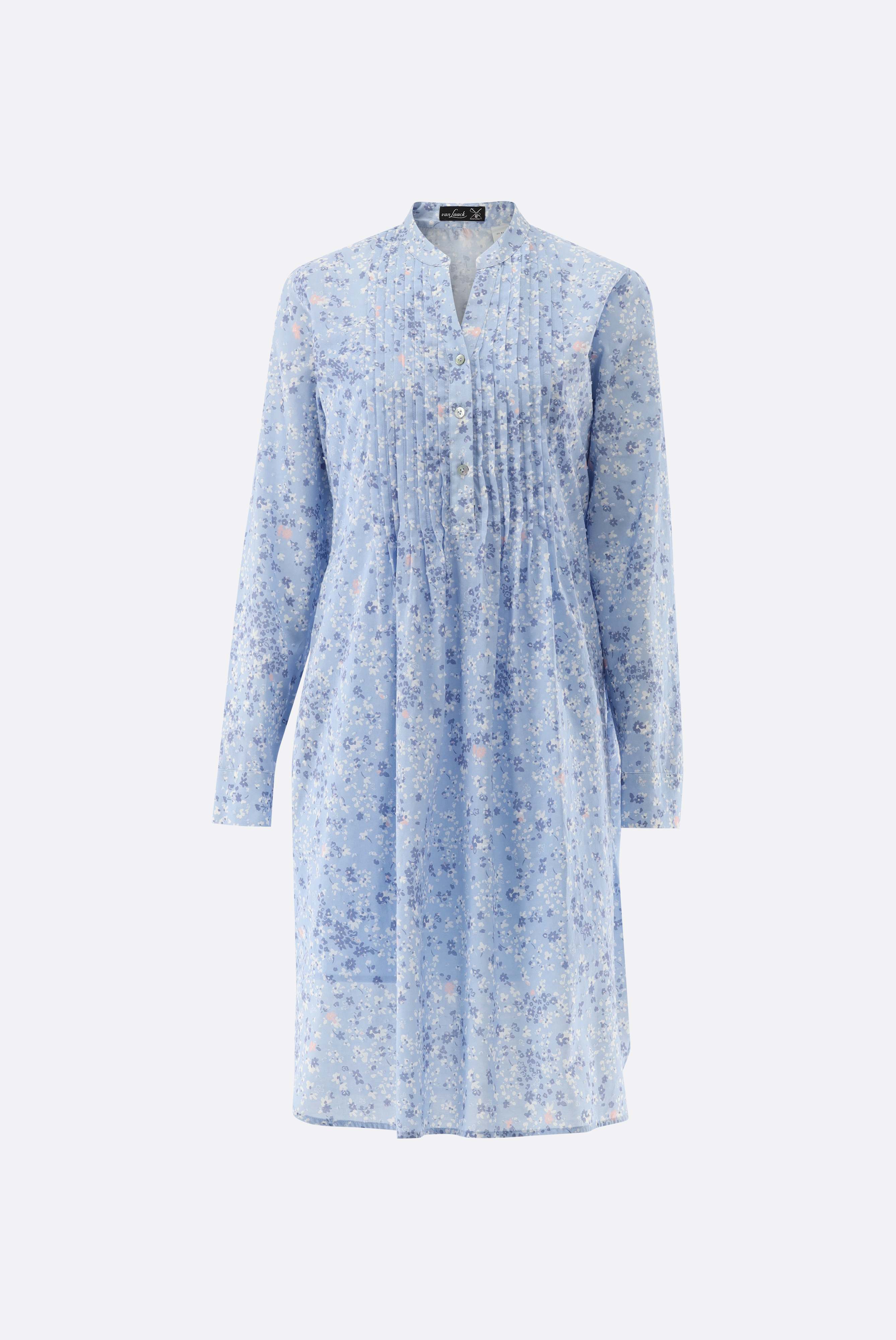 This stylish dress in cotton plumetis captivates with its airy, lightweight fabric featuring small, raised dots reminiscent of feathers or clouds. The modern stand-up collar and long sleeves ensure timeless elegance, while the pleats on the bib and the floral design add a feminine touch. Mother-of-pearl buttons lend the dress a sophisticated feel, making it the ideal choice for casual occasions.