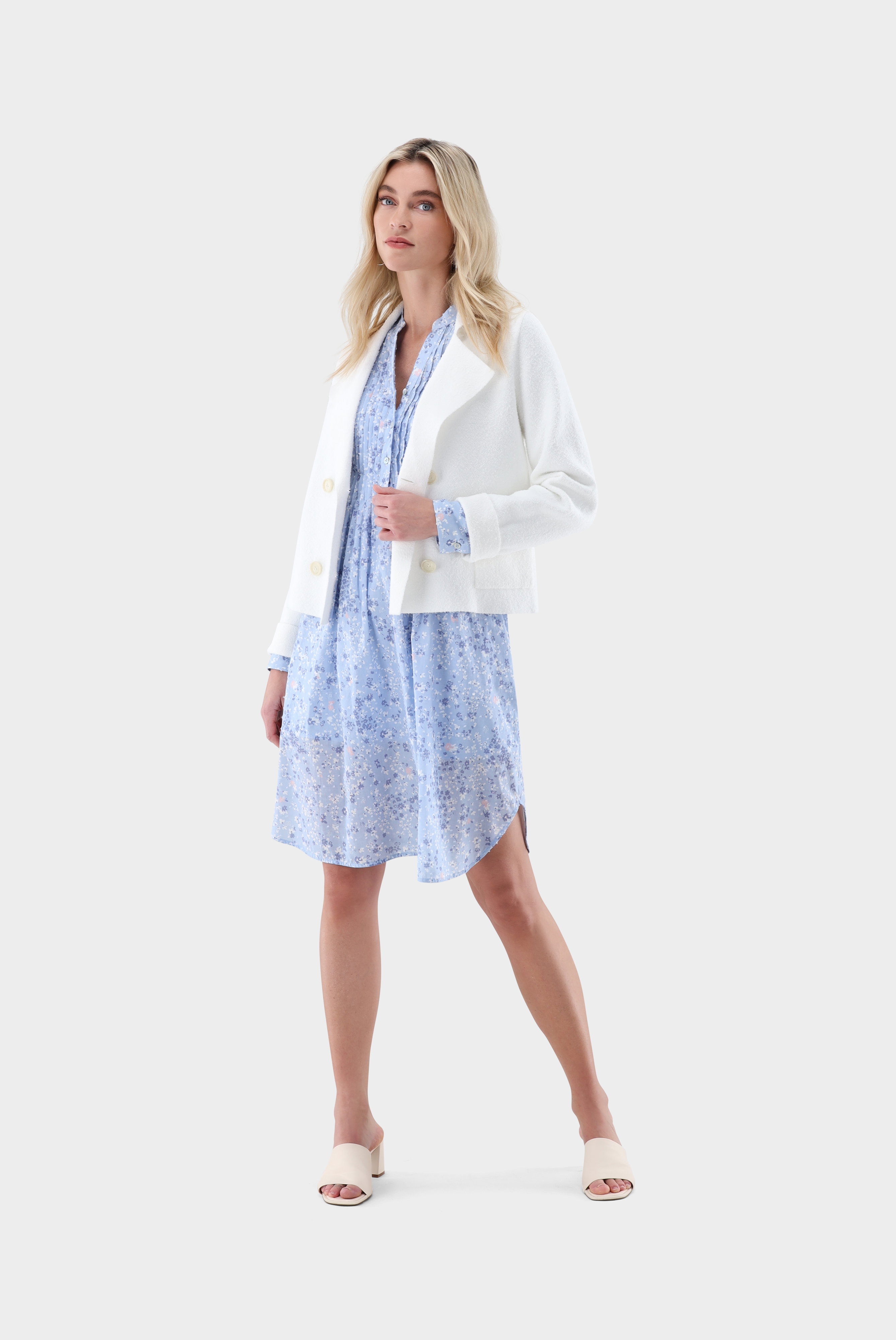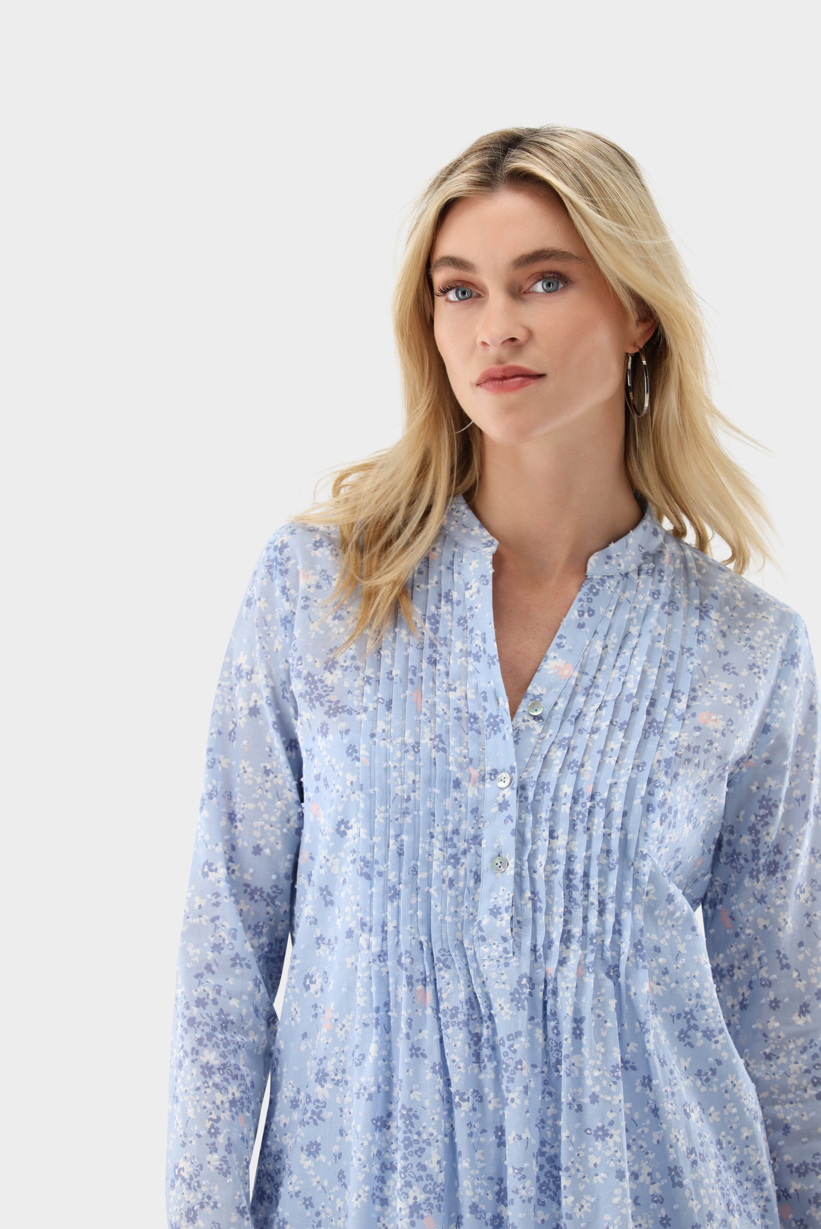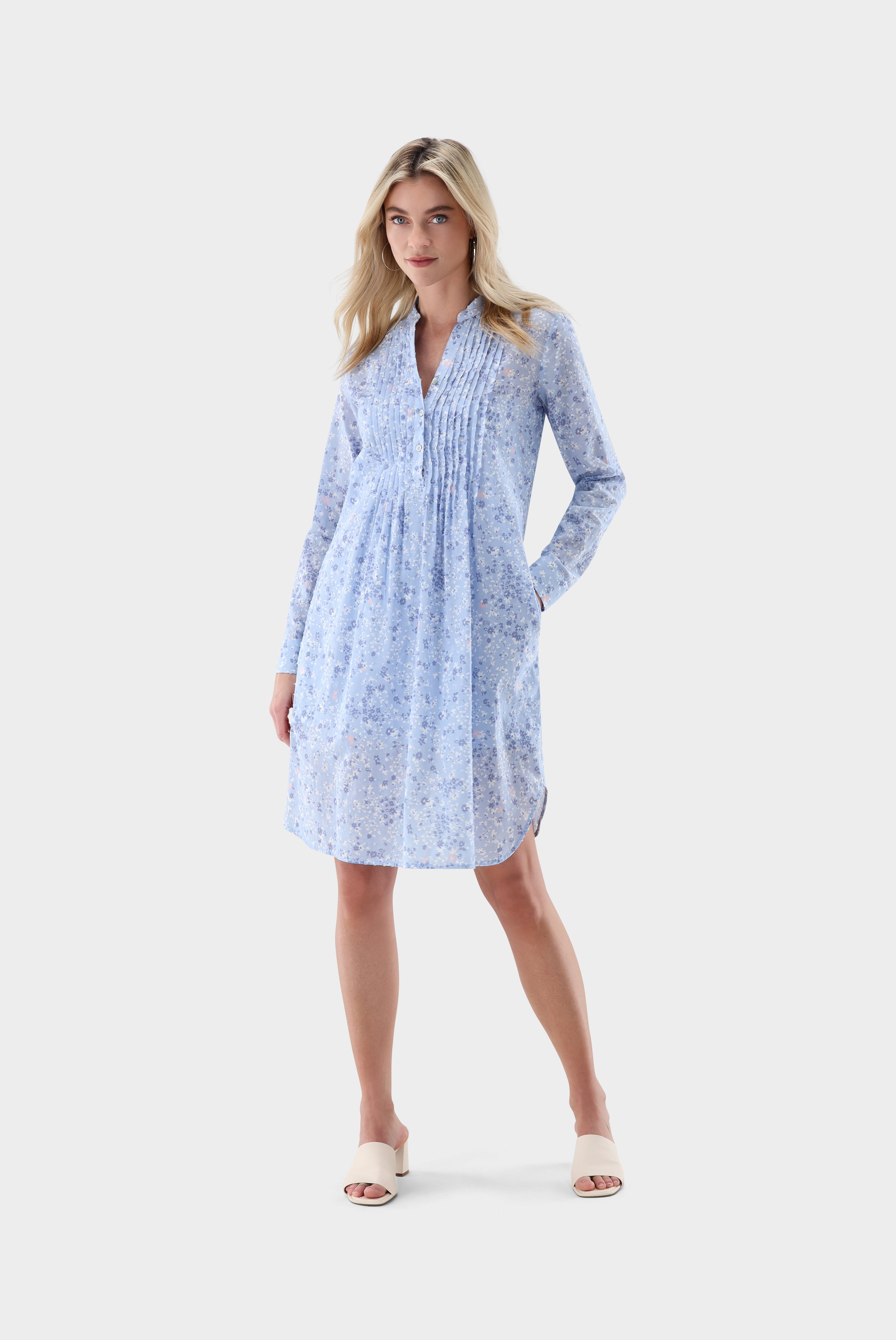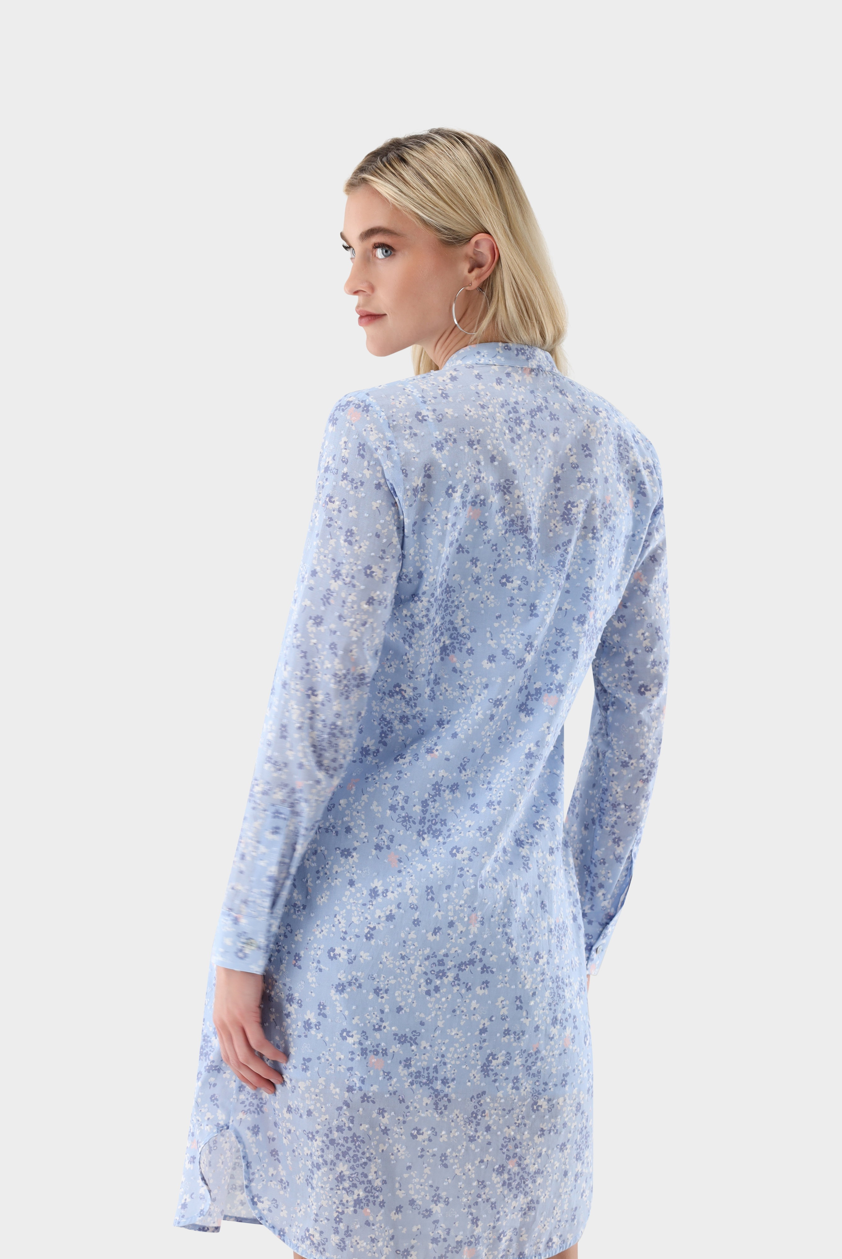 This stylish dress in cotton plumetis captivates with its airy, lightweight fabric featuring small, raised dots reminiscent of feathers or clouds. The modern stand-up collar and long sleeves ensure timeless elegance, while the pleats on the bib and the floral design add a feminine touch. Mother-of-pearl buttons lend the dress a sophisticated feel, making it the ideal choice for casual occasions.