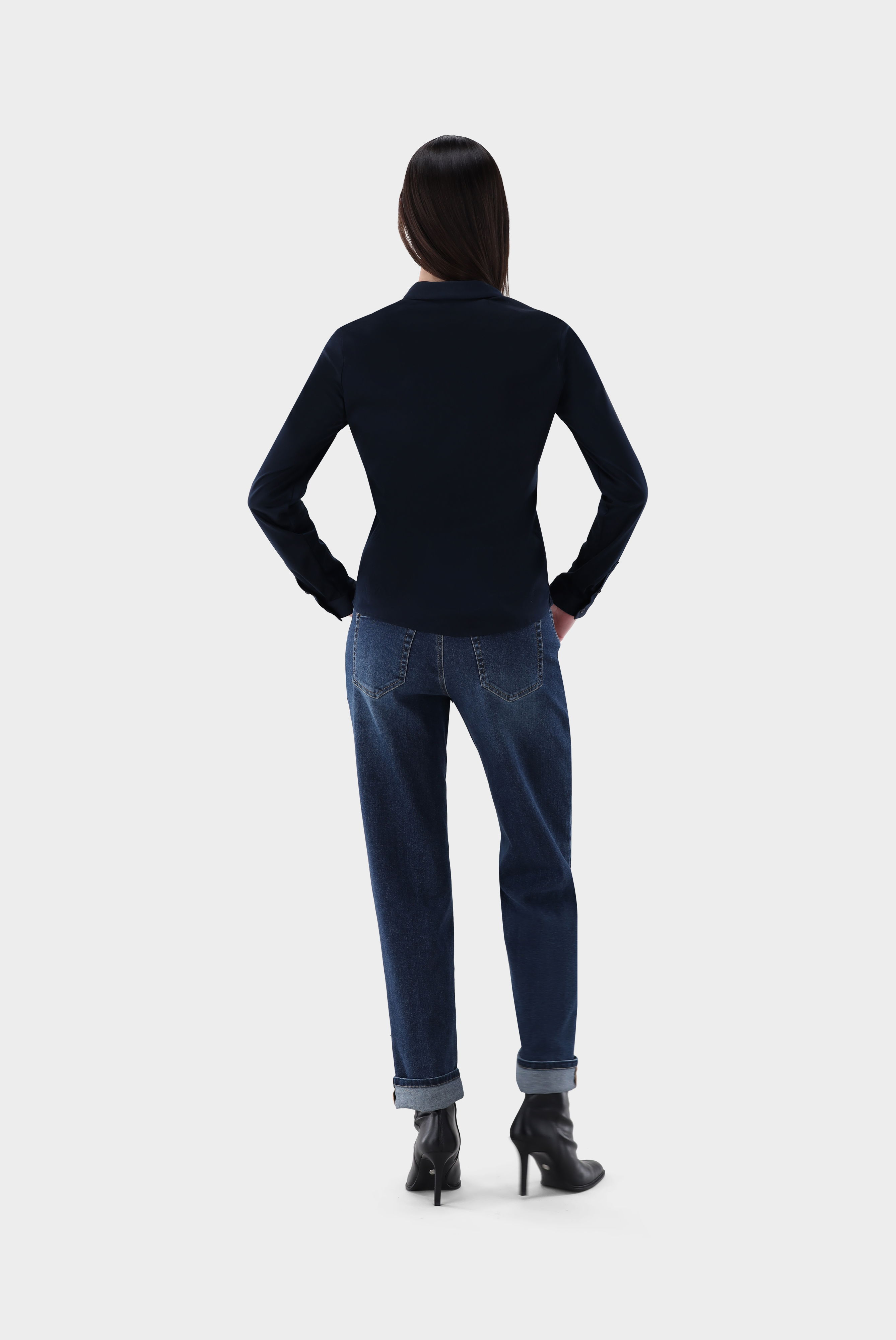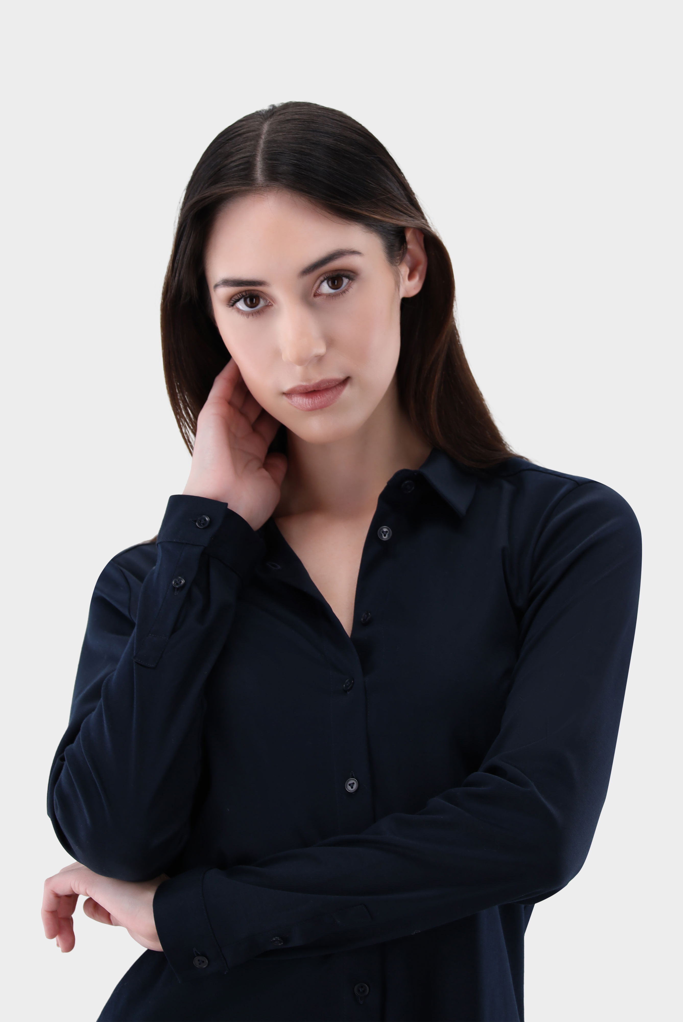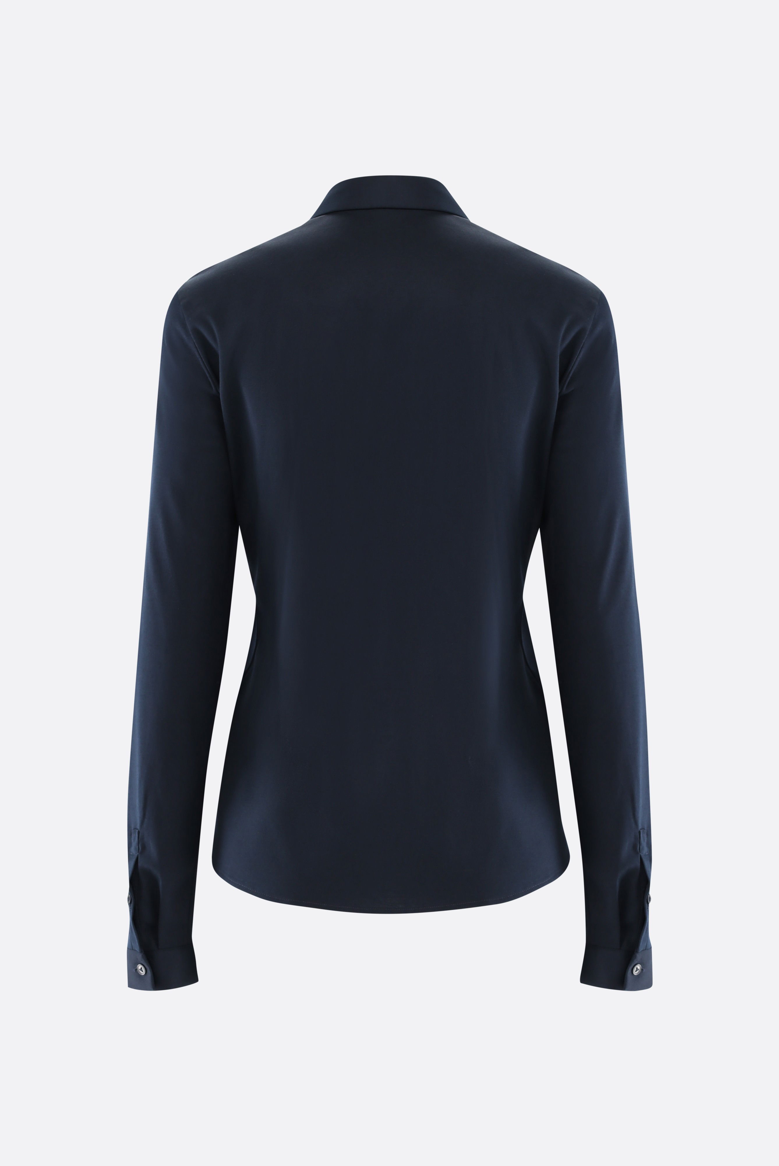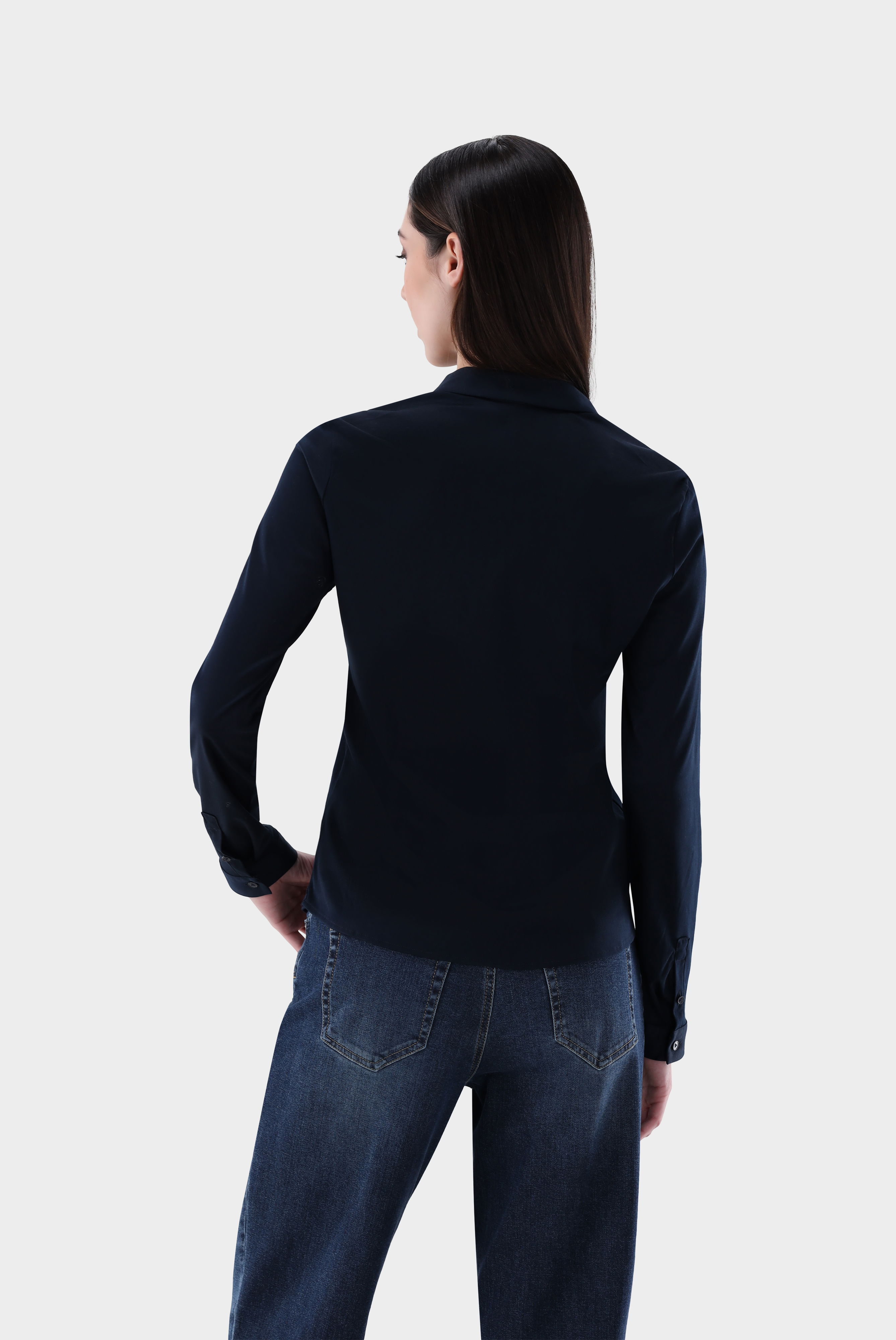 Our fitted shirt blouse with long sleeves is made of smooth jersey made from Swiss cotton. This classic shirt blouse offers a figure-hugging cut and long sleeves. Made from high-quality and soft interlock jersey with natural stretch, the Swiss cotton jersey quality ensures a comfortable fit Wearing comfort. The shiny look, the French button placket and the mother-of-pearl buttons give the blouse an elegant touch.