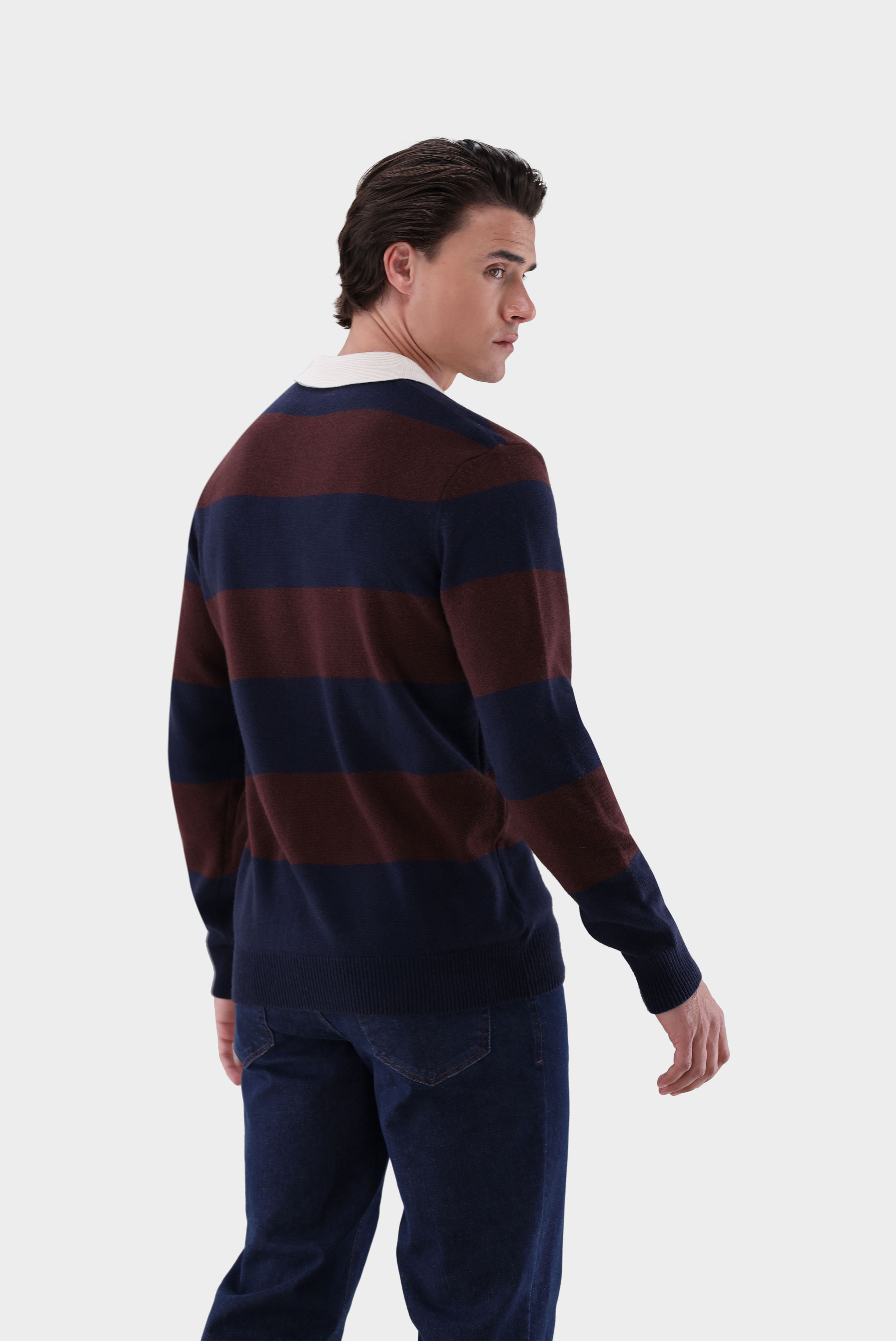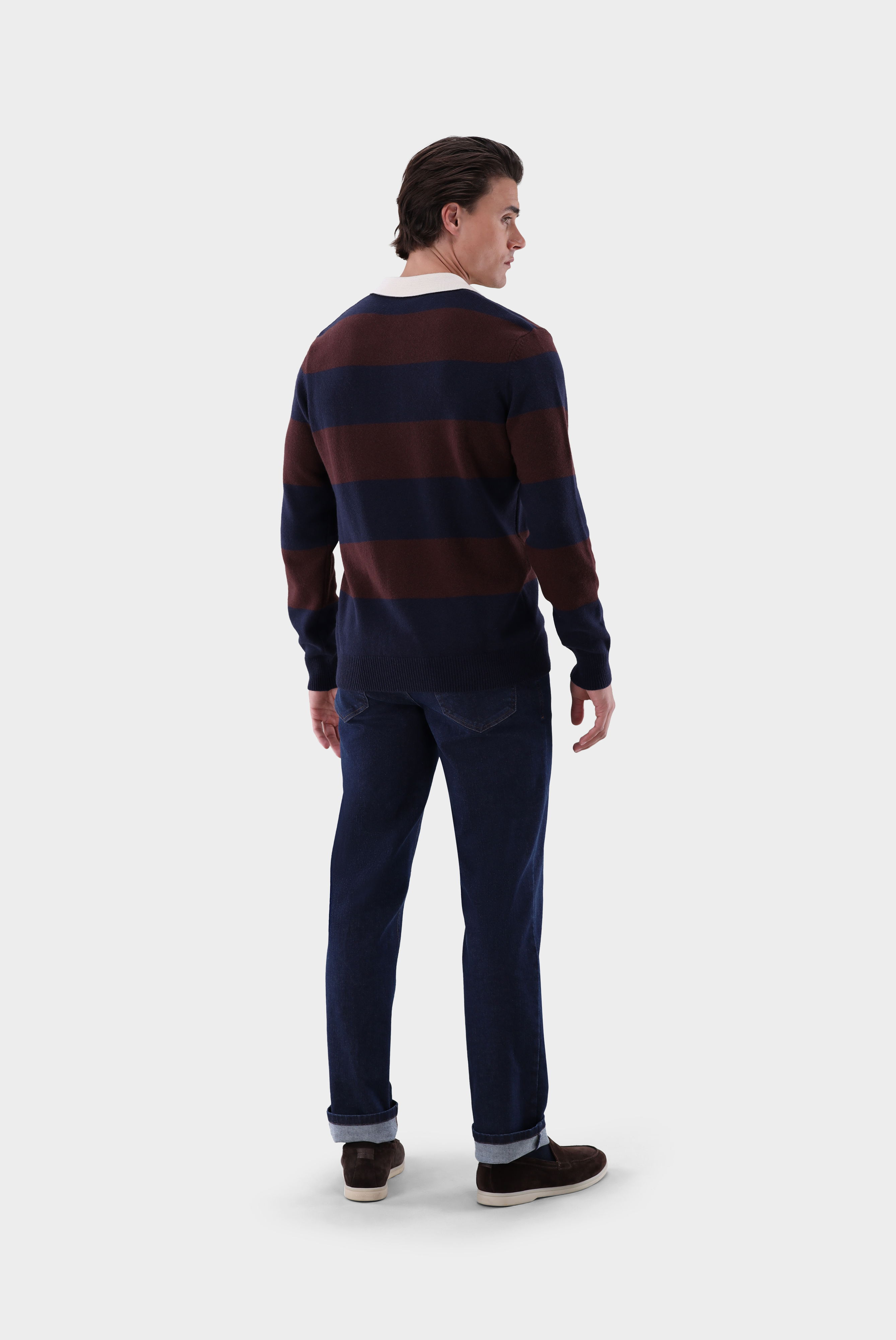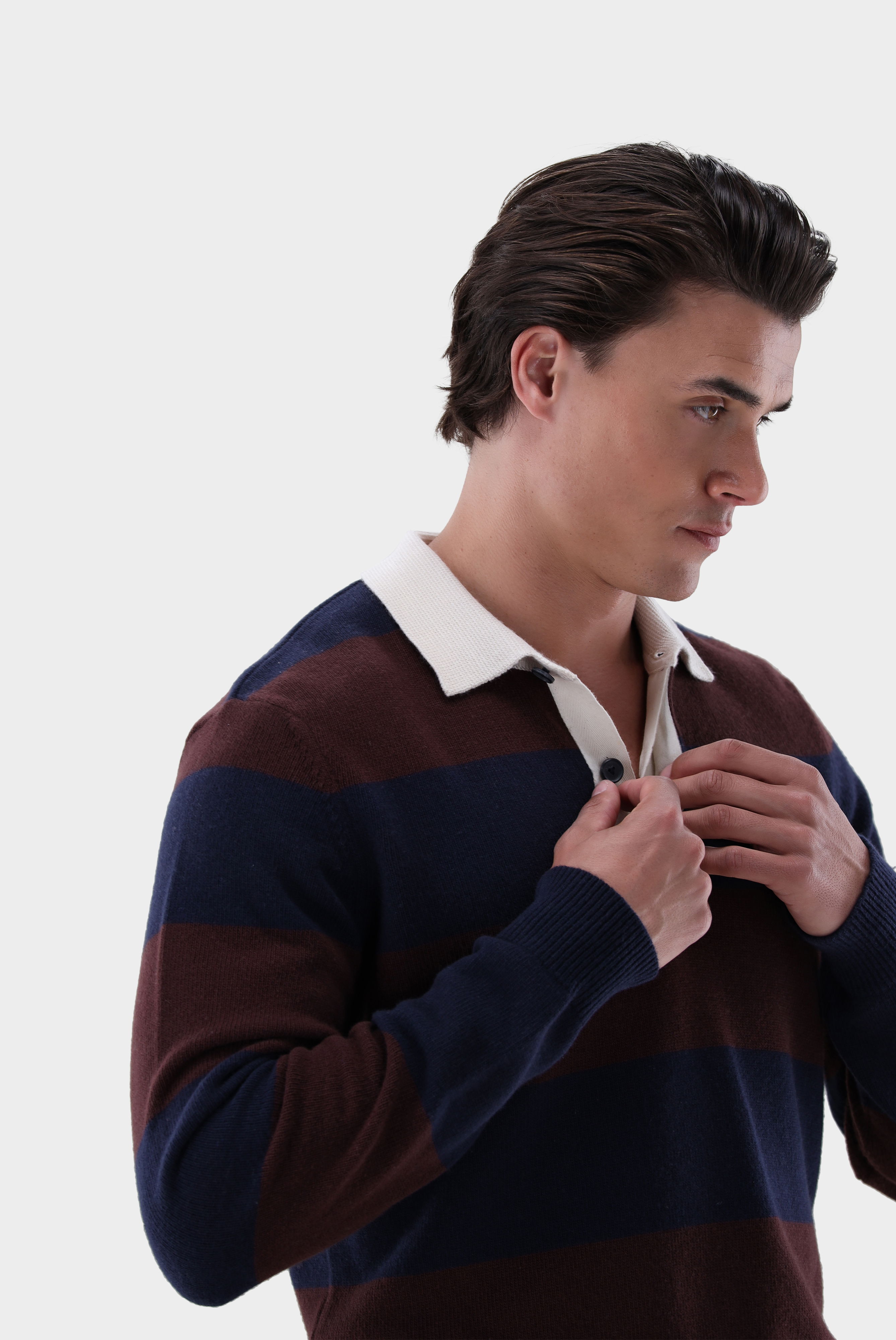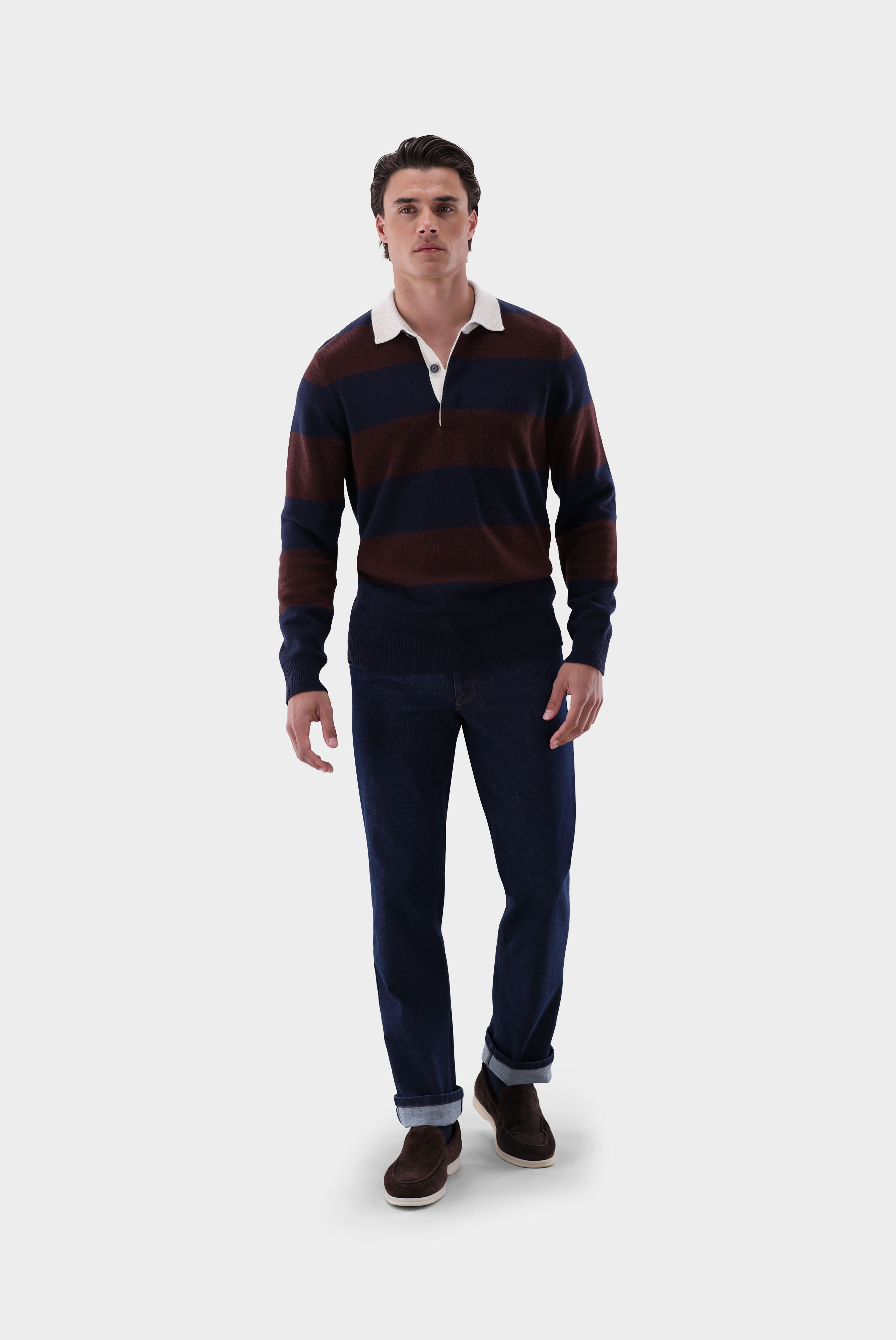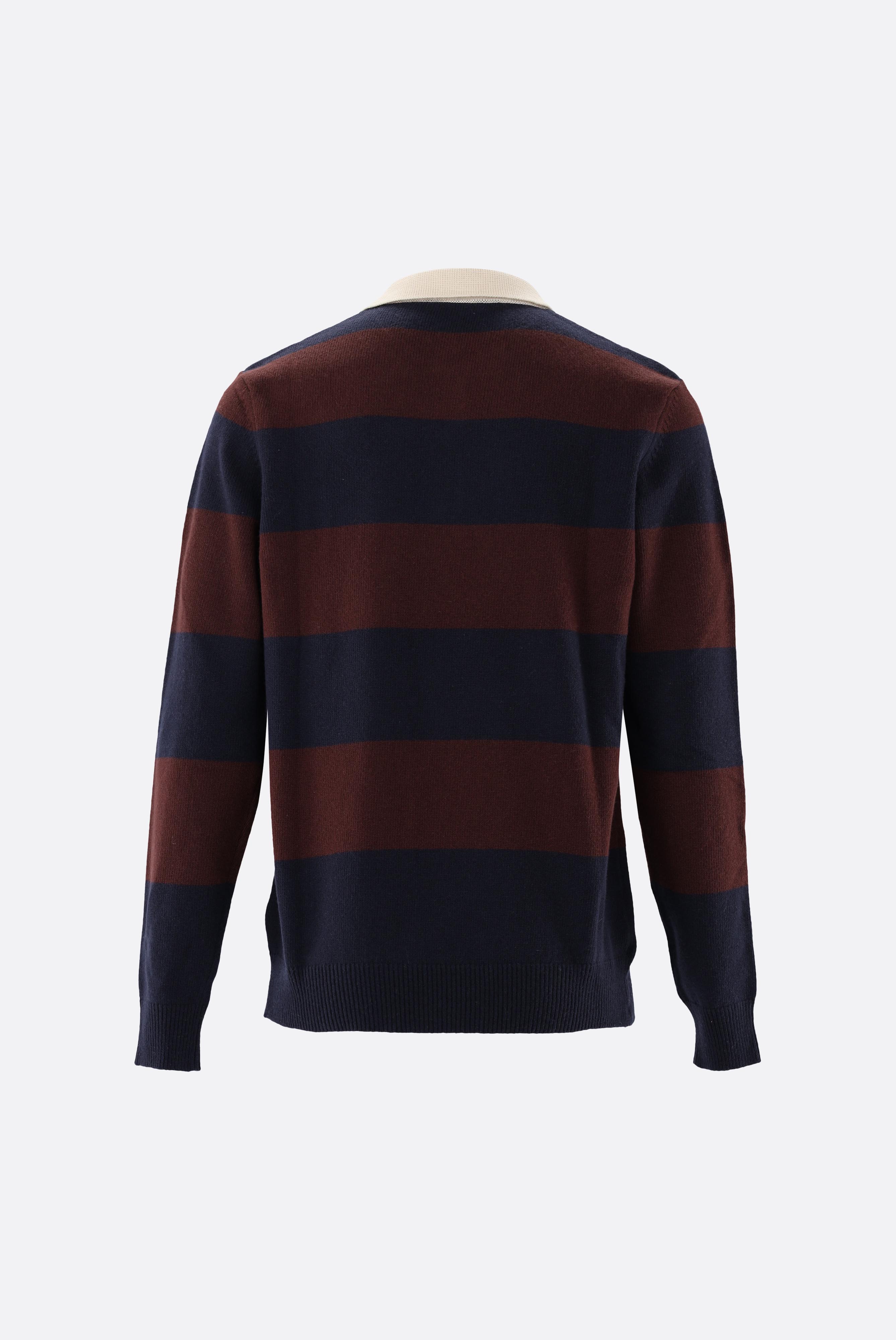This knitted rugby shirt combines a sporty look with luxurious material quality. Crafted from a fine blend of wool and cashmere, it offers a particularly soft feel and high wearing comfort. The striped design gives the shirt a dynamic look, while the contrasting white collar adds a classic touch. Versatile, the rugby shirt is suitable for both relaxed leisure looks and stylish casual outfits.