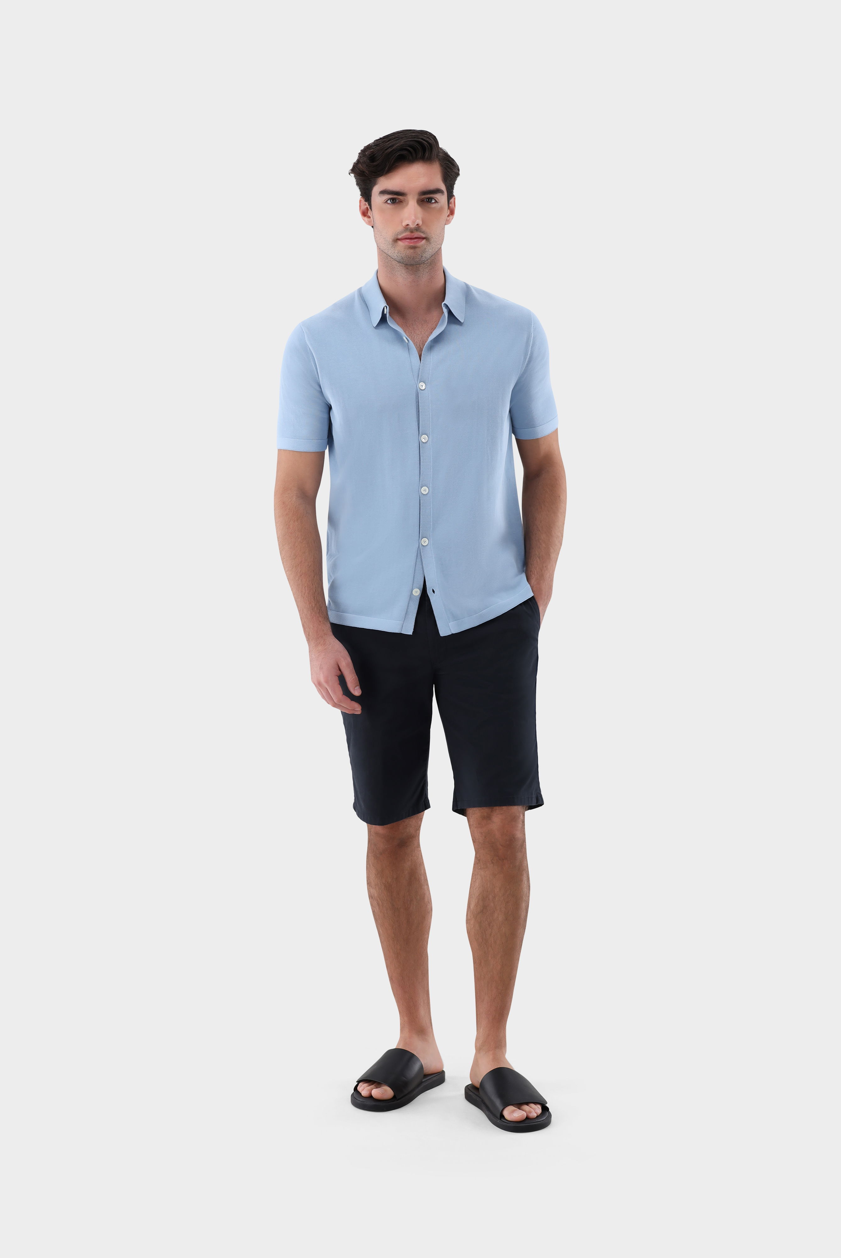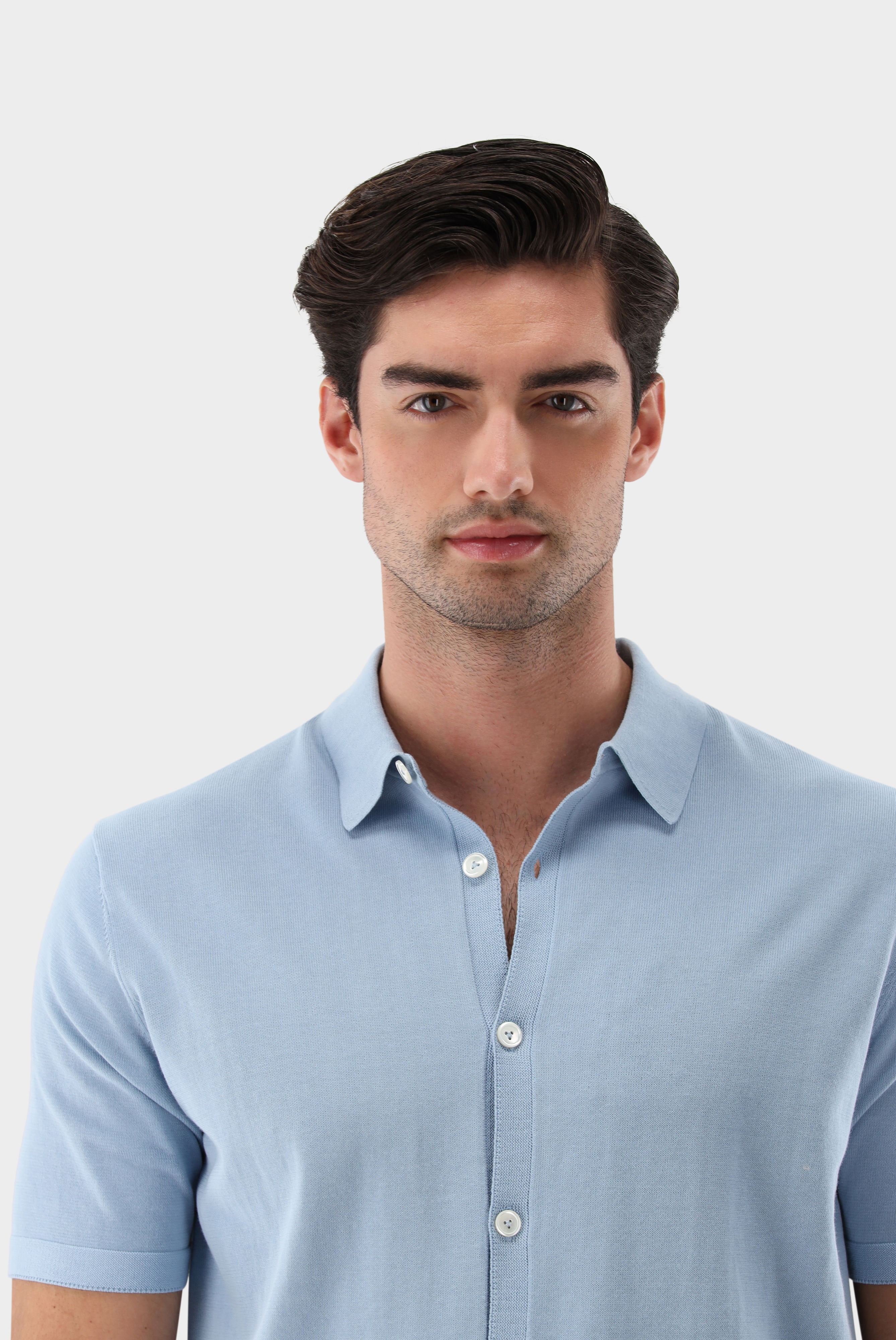 Discover the short-sleeved knitted shirt. Made from Air Cotton, it offers a particularly soft and breathable feel. The button placket and the collar give this shirt a modern look. It can be ideally combined with a casual summer outfit. Whether on a beach holiday or on a warm day in the city.
