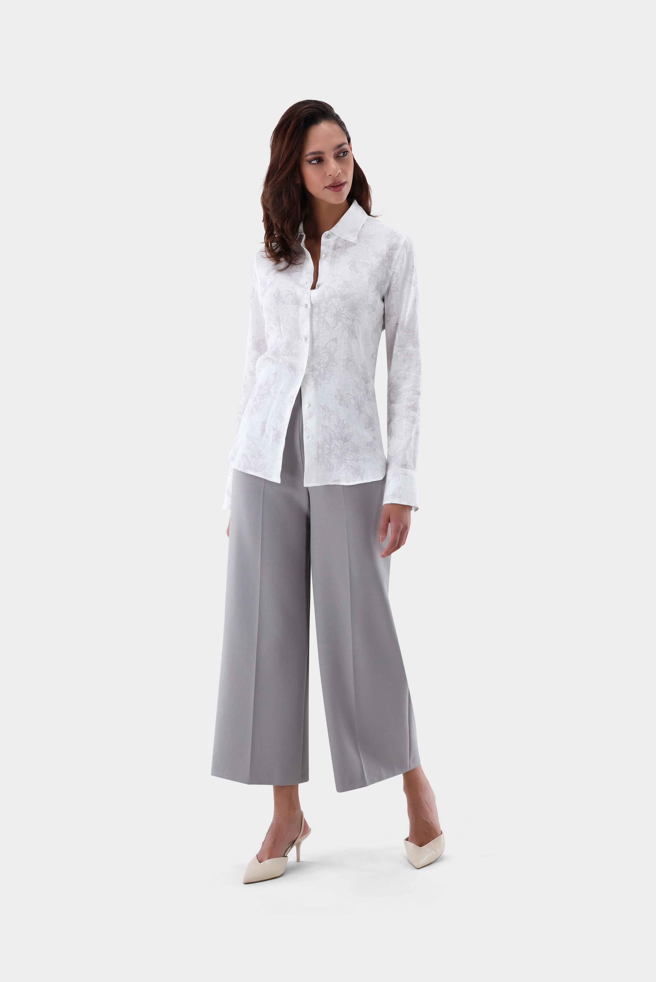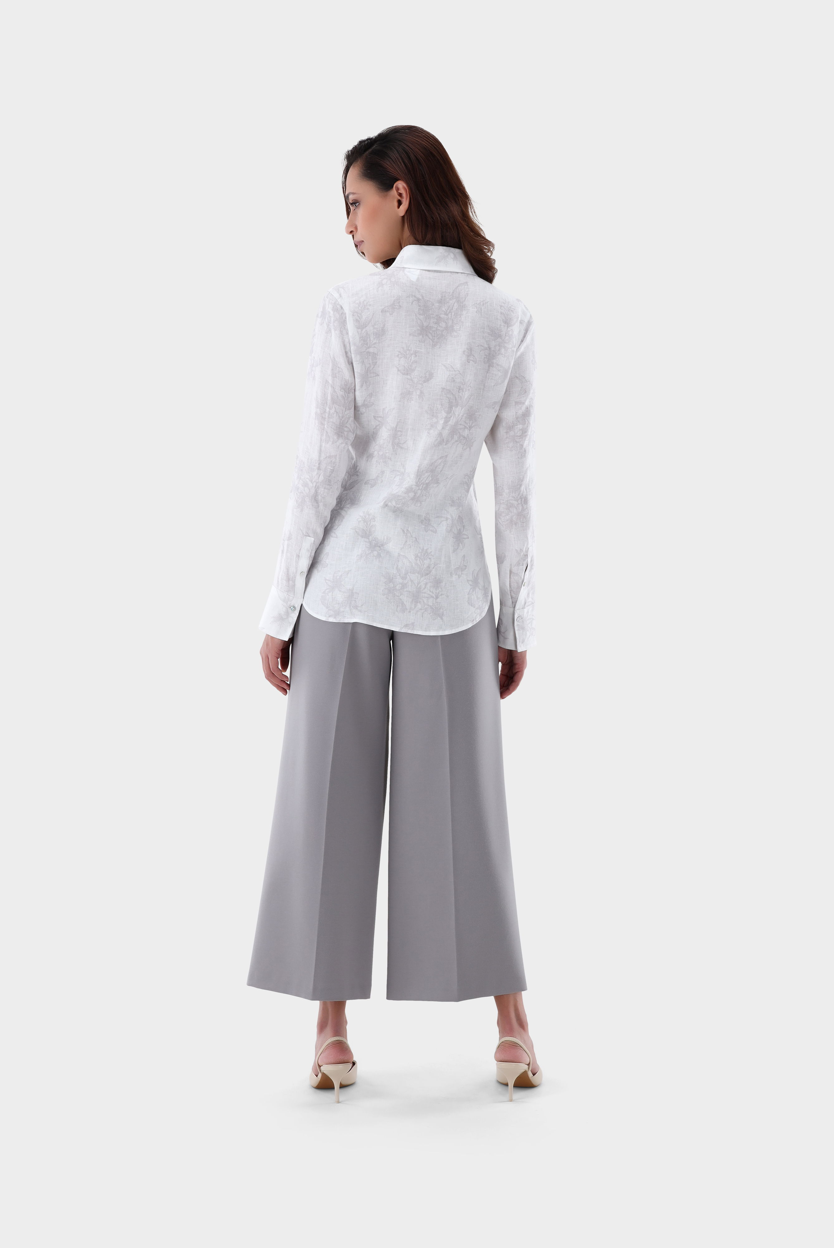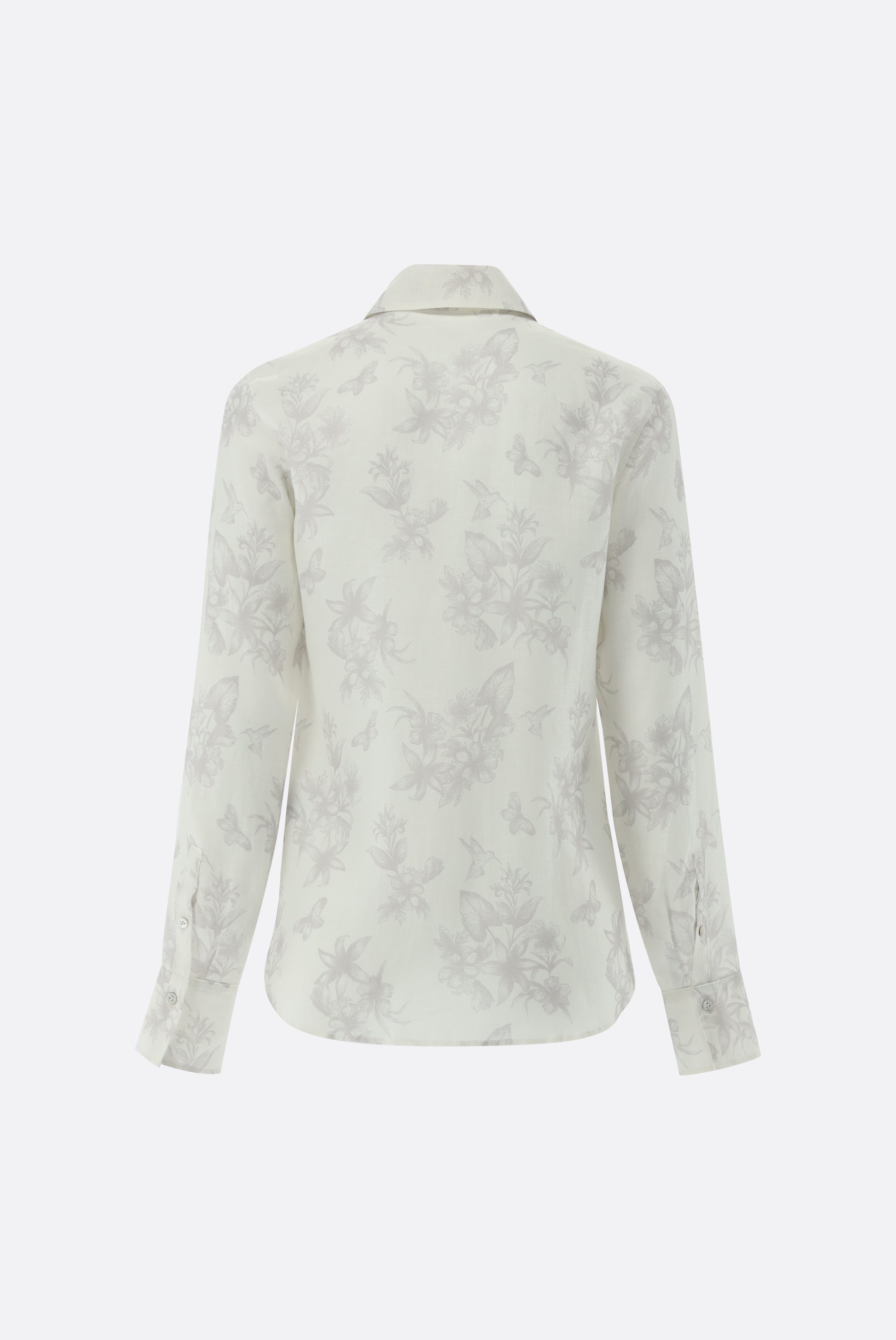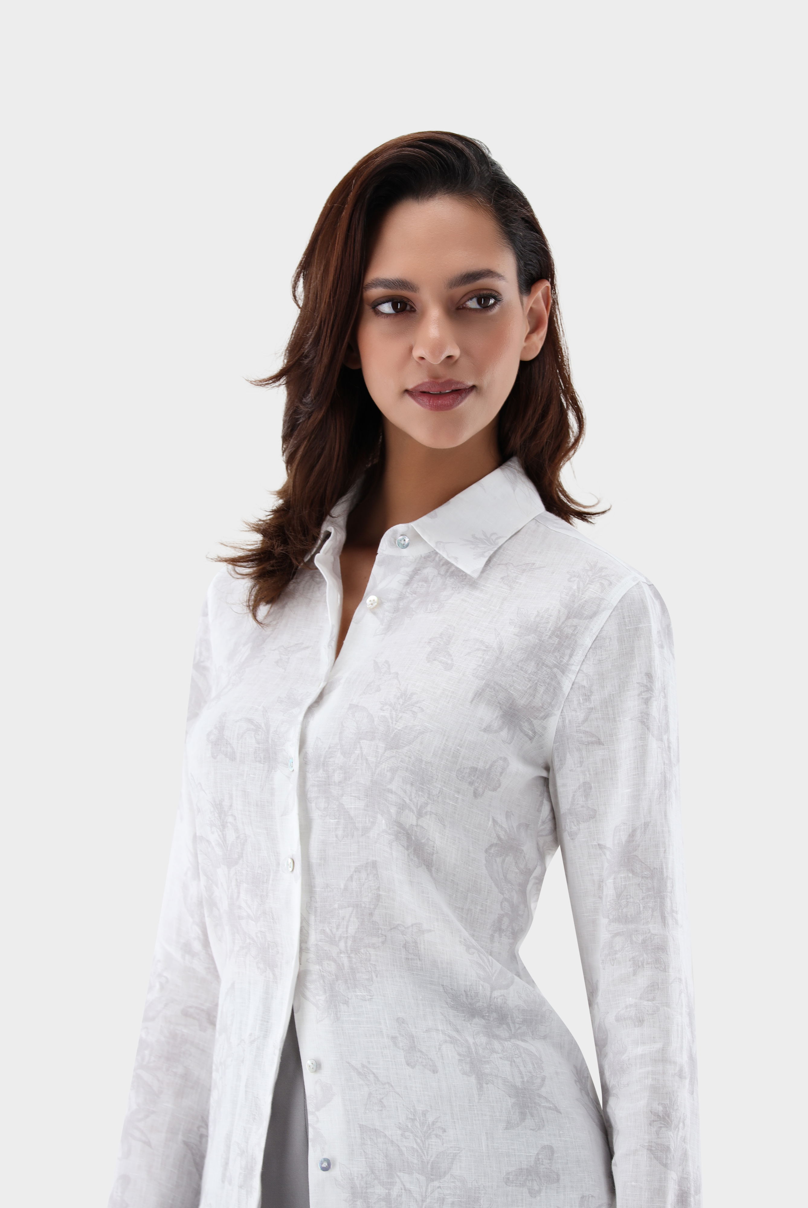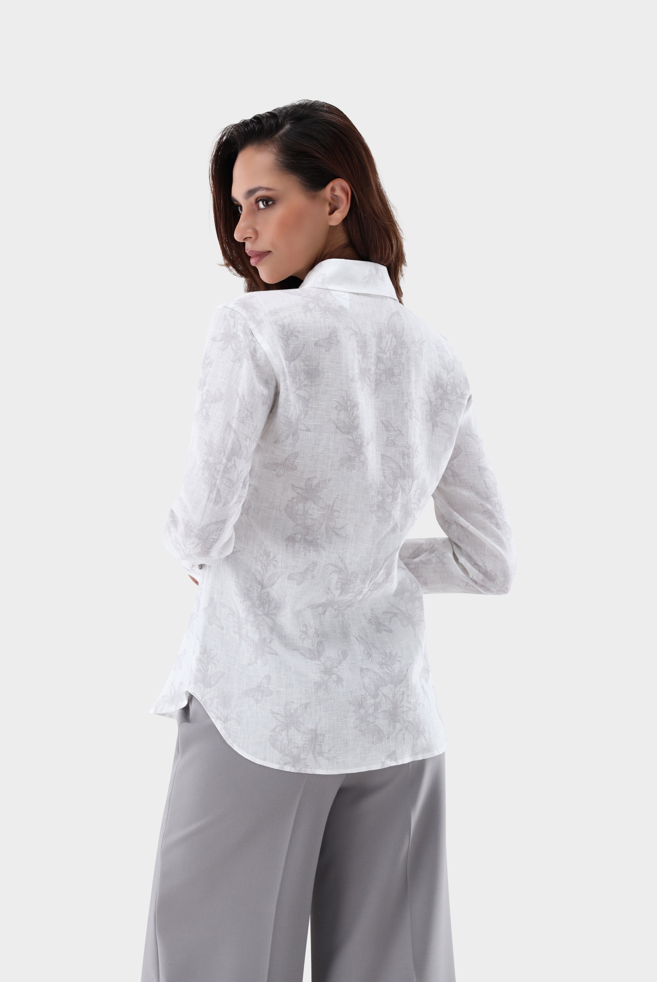 This blouse made from super-soft linen offers excellent comfort due to its breathable properties and keeps you cool on warm summer days. Linen is a natural, eco-friendly, and sustainable fiber that is also easy to care for. The blouse features a stylish butterfly print, making it perfect for both business and casual looks. The mother-of-pearl buttons and long sleeves add an elegant touch to the blouse.
