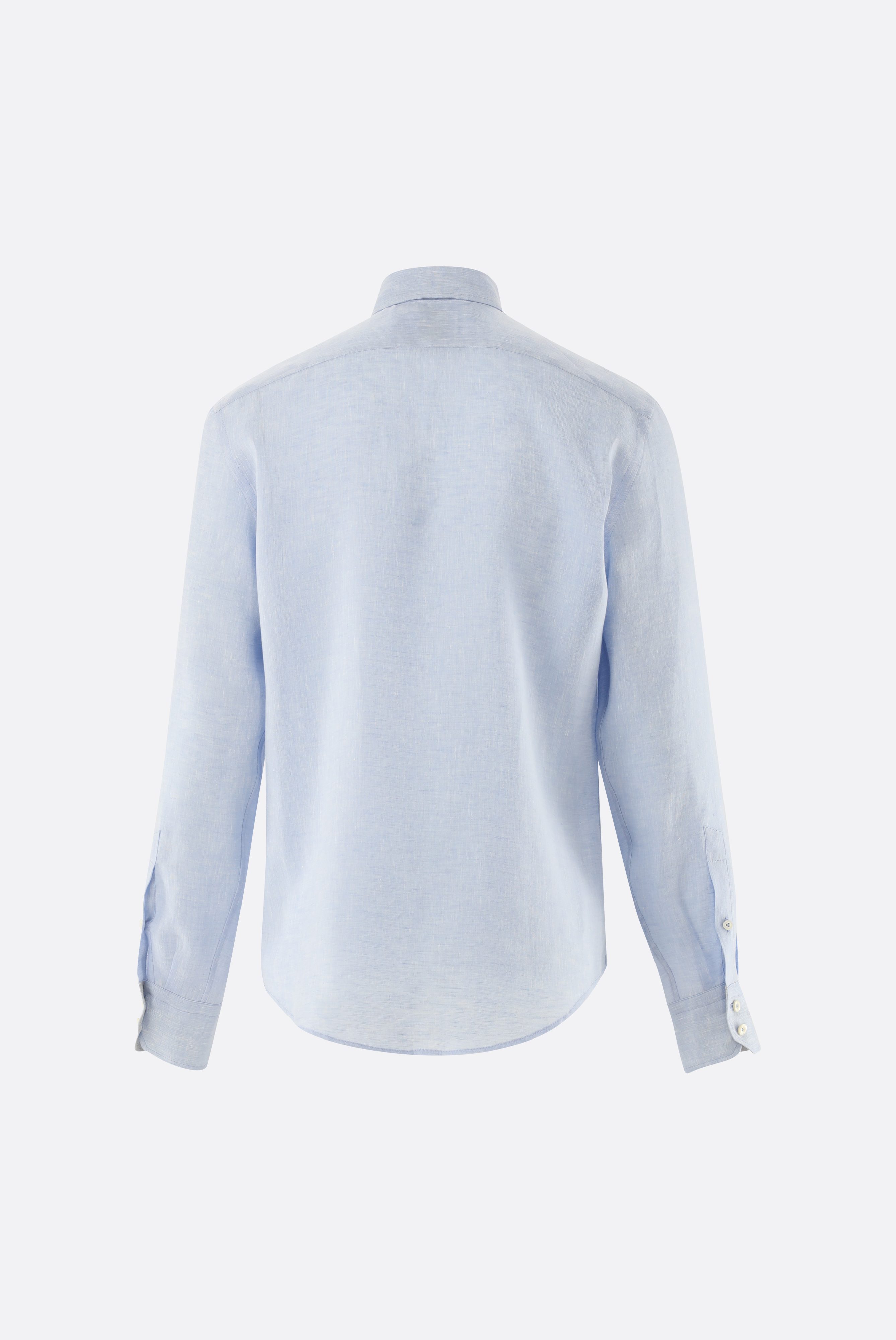 This tailor-fit shirt in super-soft linen impresses with its elegant, close-fitting cut and exceptional comfort. Made from yarn-dyed fabric, it offers a particularly high-quality look. Gray contrast details and sporty decorative seams add modern accents, while the dart-free design ensures clean lines. The shark collar and elegant mother-of-pearl buttons underscore its stylish character. Ideal for summer business and smart-casual looks.