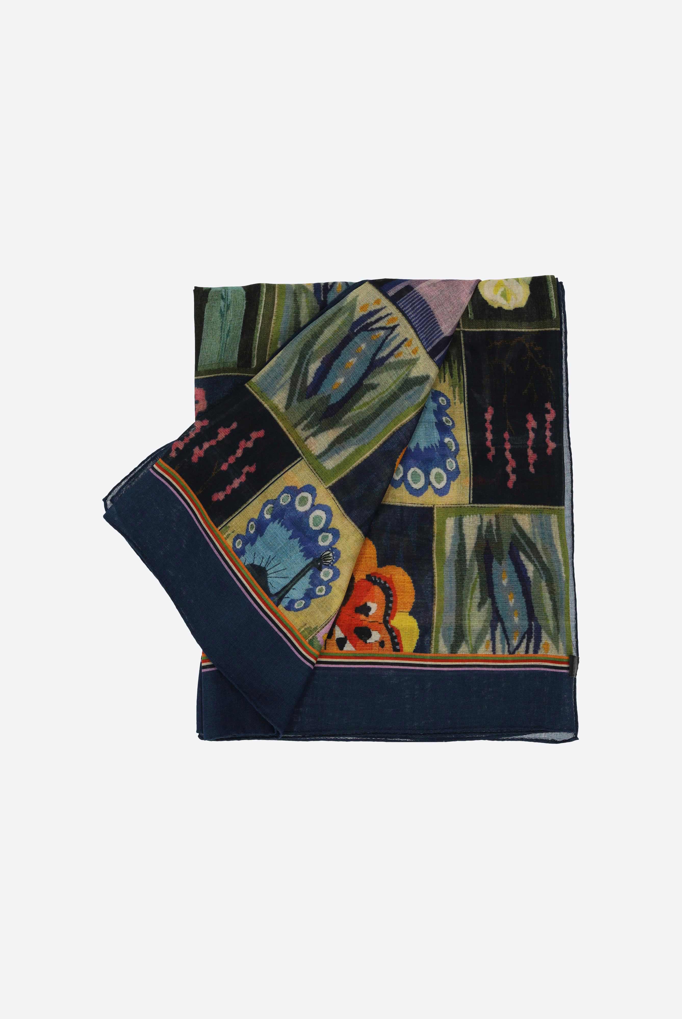 The square maxi scarf is crafted from a viscose wool blend featuring the ''Secret Garden'' print framed by a solid-colored border. It measures 140 cm x 140 cm and includes a narrow hem. Ideal for both casual and business attire.