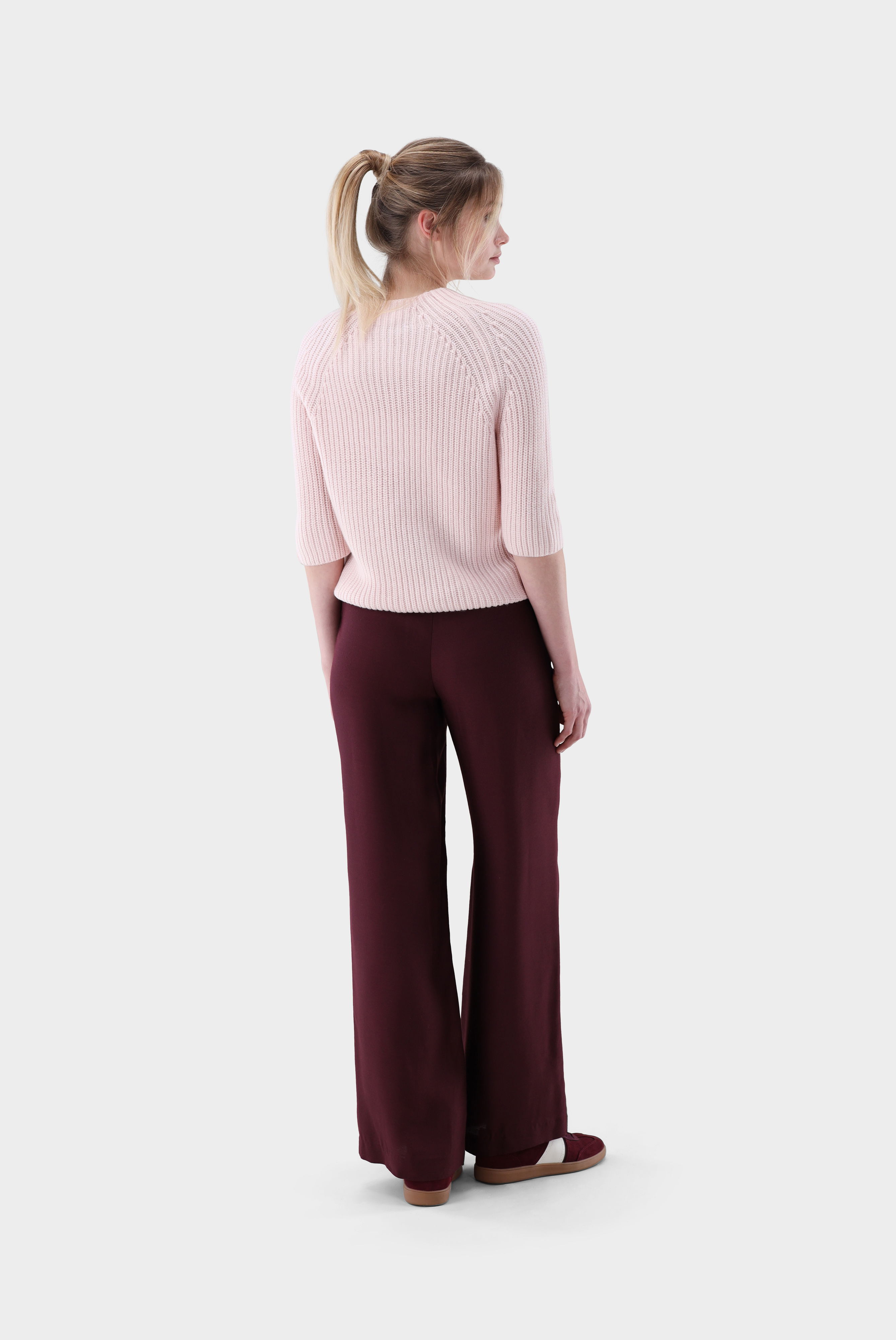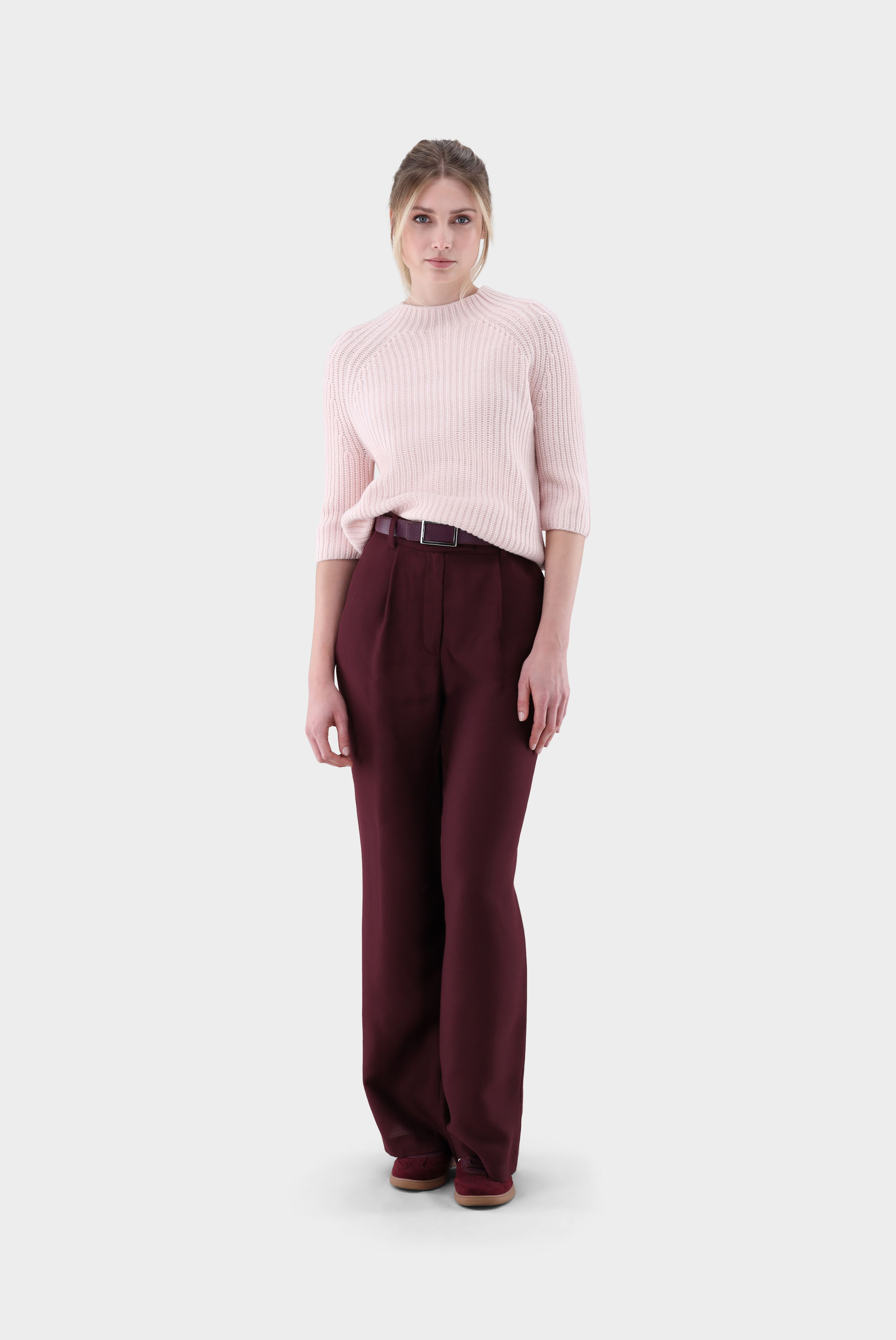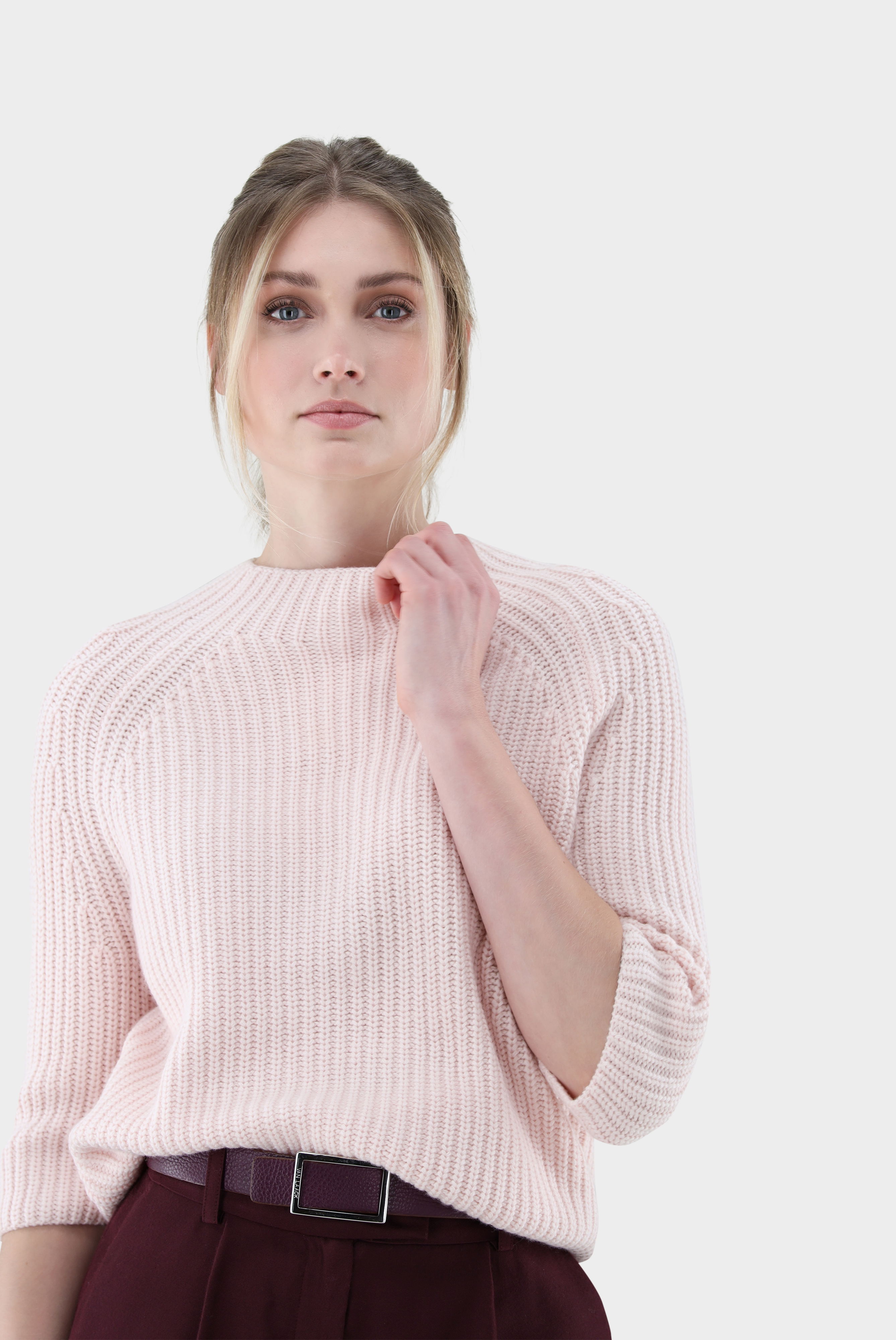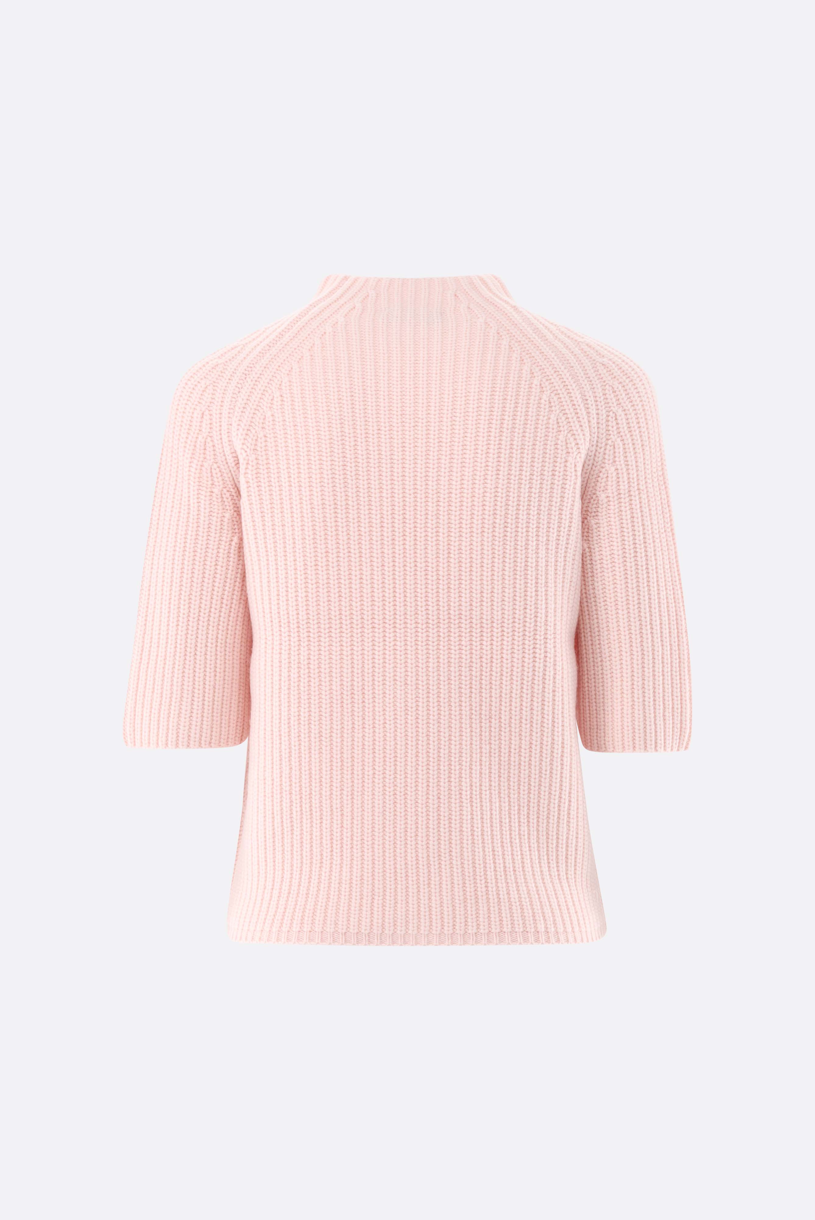 This cropped stand-up collar sweater impresses with its modern design and high-quality material. The wool-cashmere blend ensures a particularly soft feel, pleasant warmth, and luxurious comfort. Short sleeves and the fine cardigan stitch give the piece an elegant structure and modern touch. Versatile, the sweater is ideal for stylish layering looks in everyday life or for sophisticated casual outfits that combine comfort and timeless elegance.