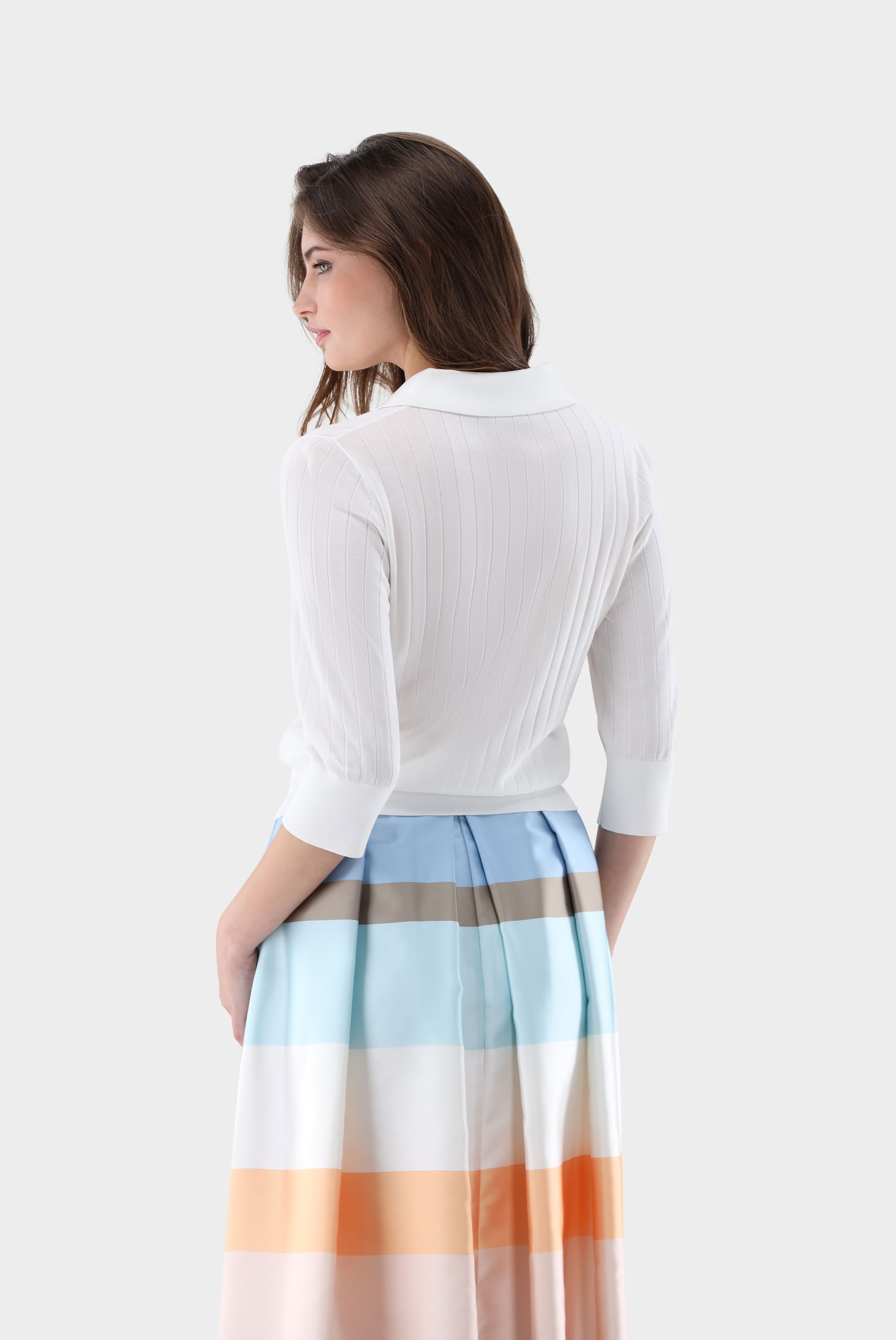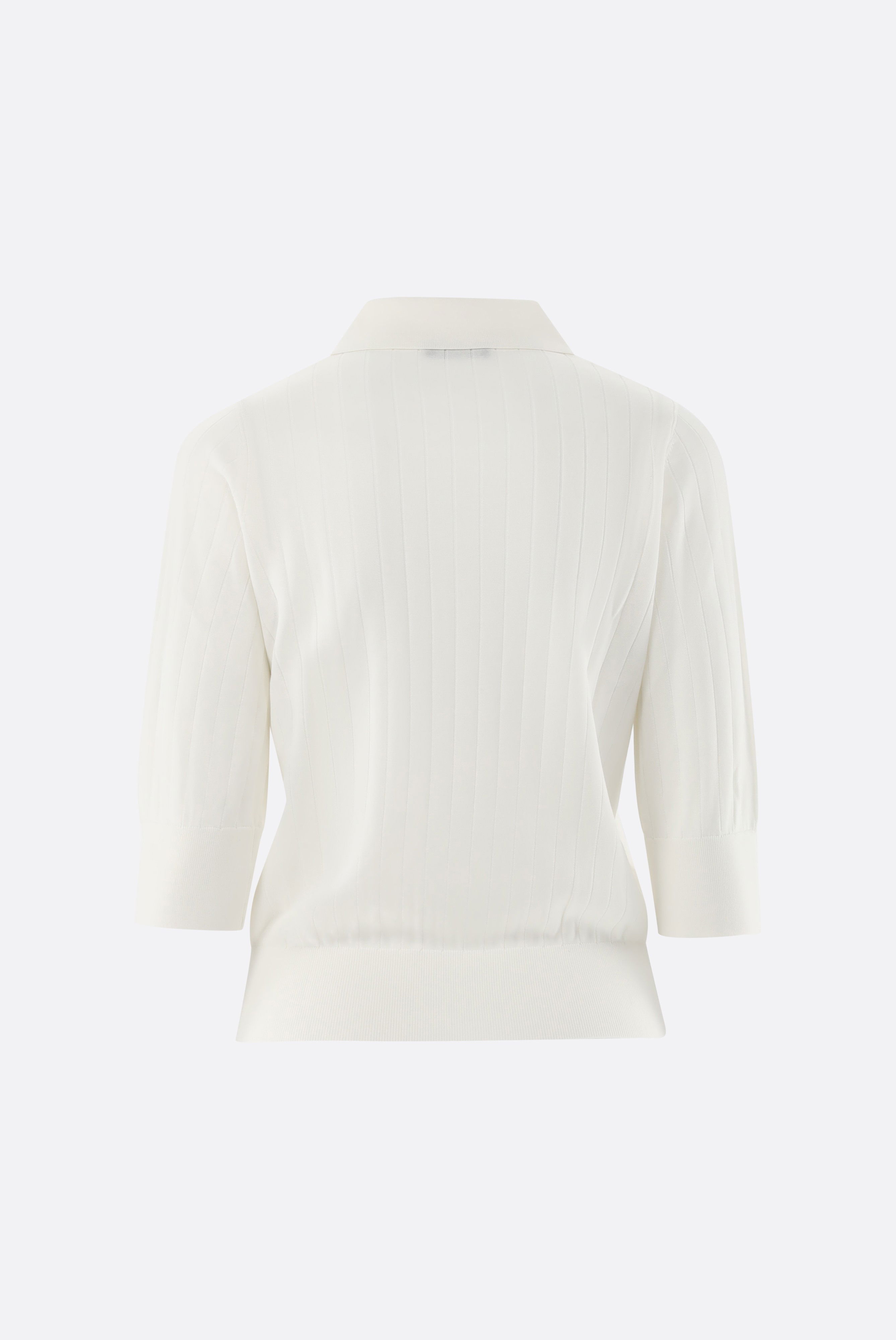 This knitted polo shirt combines modern design with premium materials. Knitted from cotton and viscose, it boasts a luxurious feel and subtle sheen. The three-quarter sleeves add a feminine touch, while the ribbed texture and fine cuffs ensure a perfect fit. Offering exceptional comfort, this polo shirt is ideal for elegant casual looks or stylish business outfits with a fashionable edge.