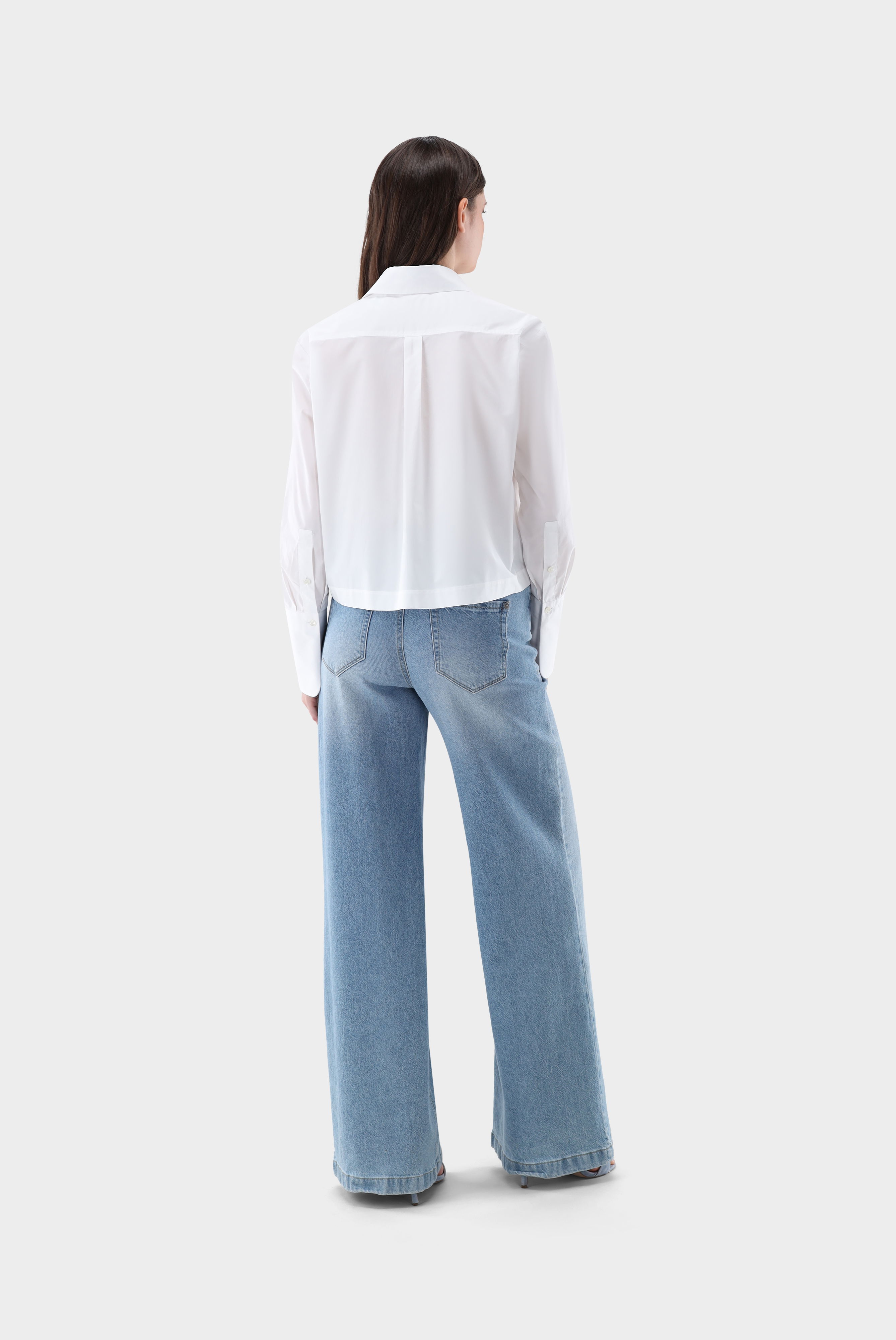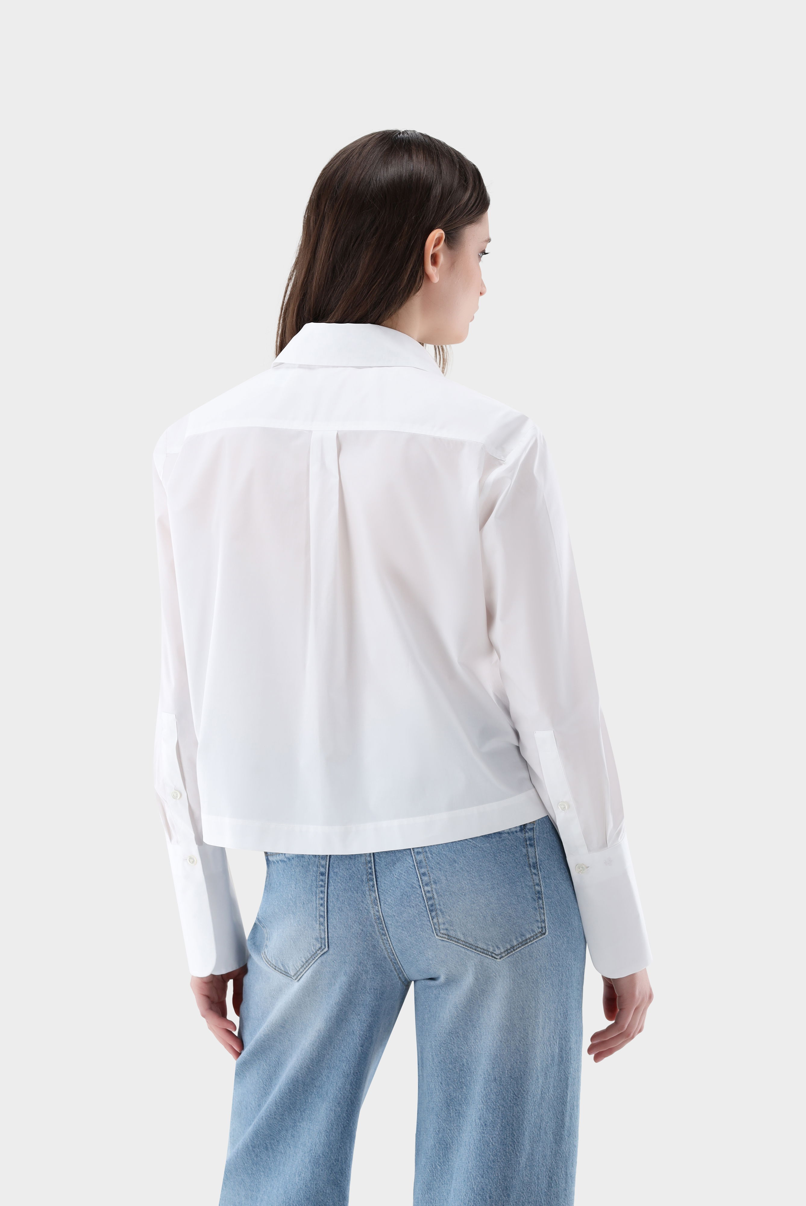 This relaxed-fit, short shirt blouse combines comfort and style. The two heart-shaped pockets with ruffles add a special, intricately crafted detail, while the cropped length lends a modern touch. Perfect for high-waisted trousers and versatile enough for casual, business, or festive occasions. A back yoke with a box pleat accentuates the back. Elegant mother-of-pearl buttons complete the design.