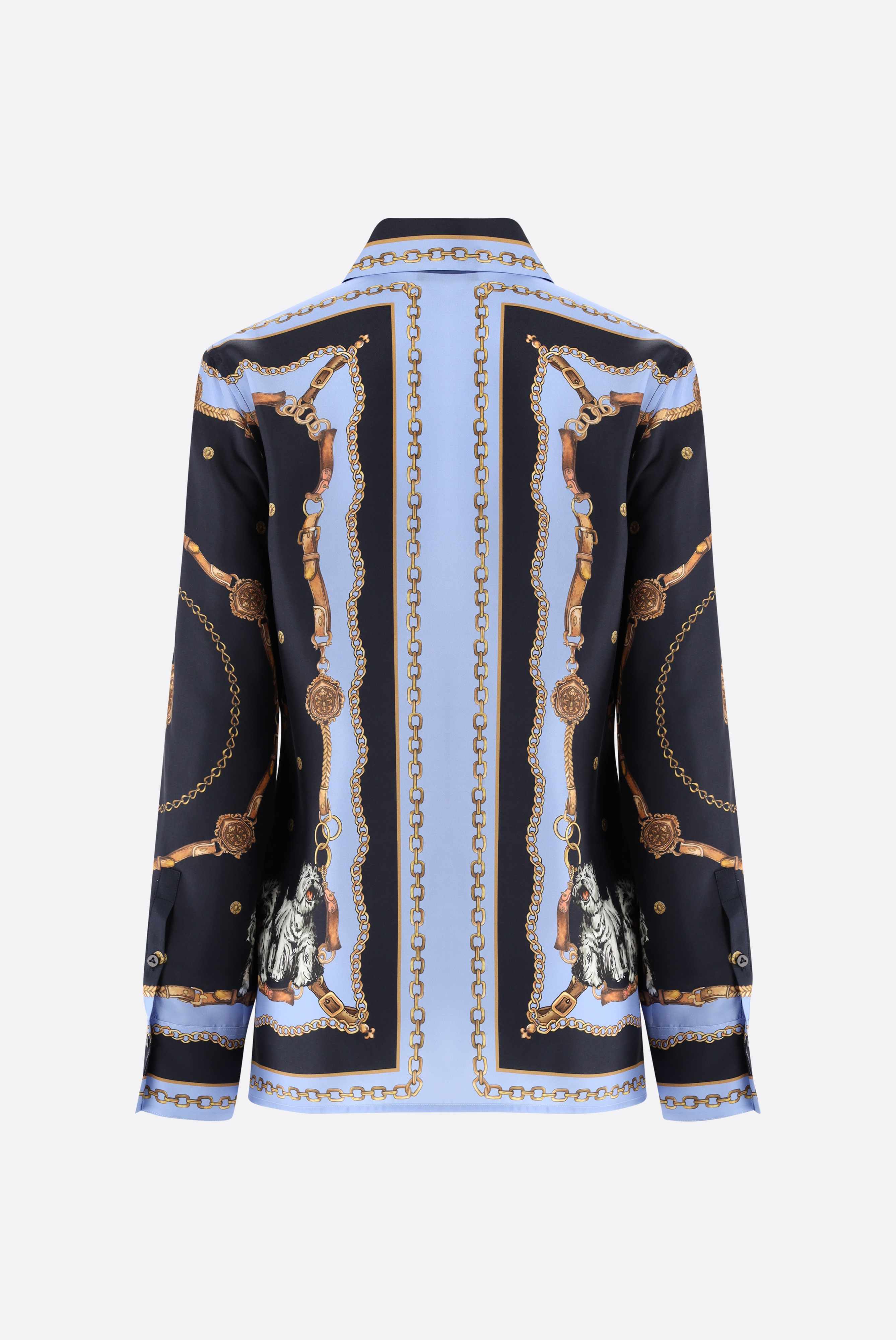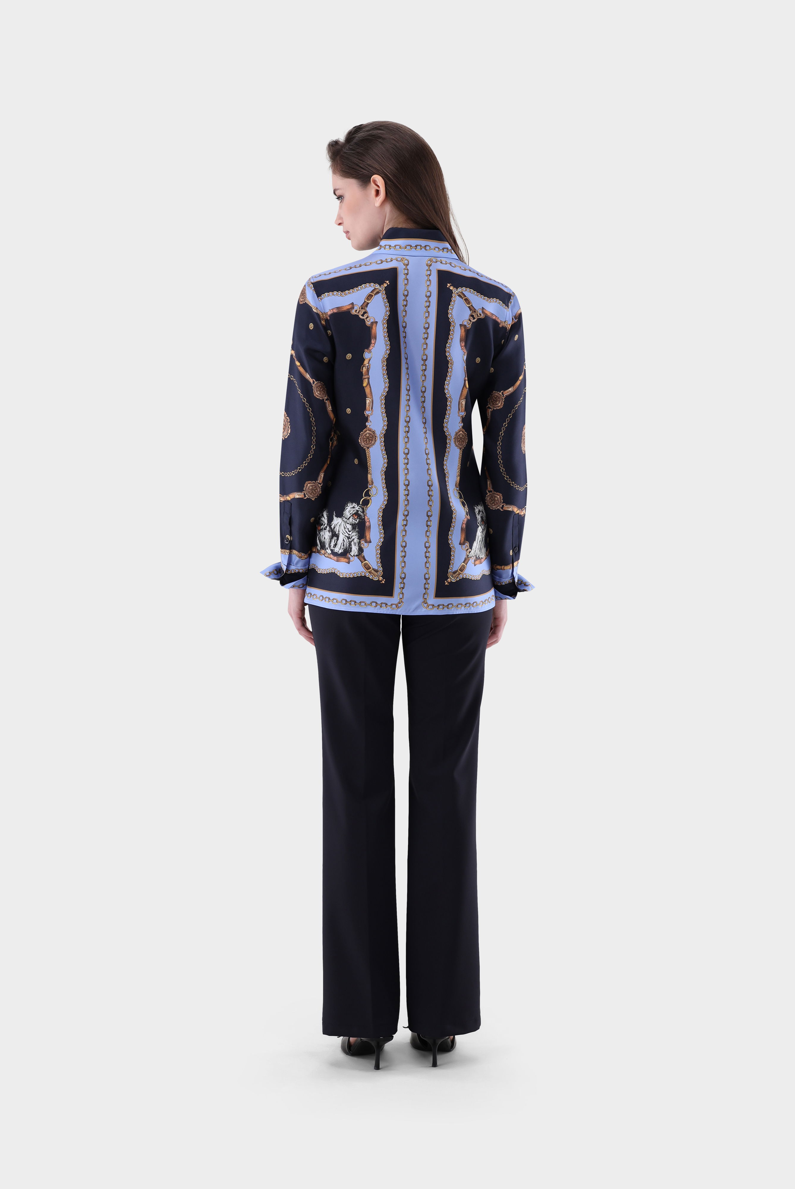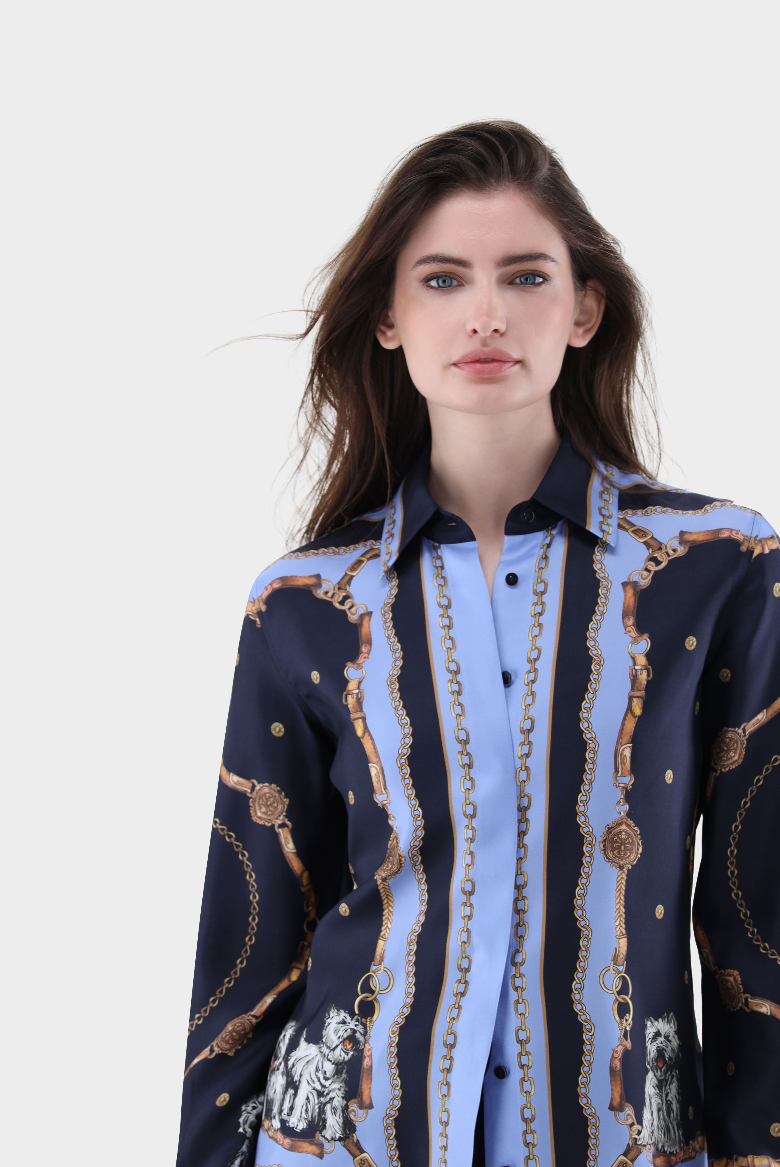 Entdecken Sie unsere halb taillierte Hemdbluse aus edlem Seidentwill. Der elegante Foulard-Print mit platziertem Westie-Motiv verleiht der Bluse einen charmanten, individuellen Look. Die langen Ärmel und die hochwertige Seide sorgen für einen fließenden Fall und ein besonders angenehmes Tragegefühl. Ob im Büro oder in der Freizeit – diese Designerbluse lässt sich vielseitig kombinieren und setzt modische Akzente.