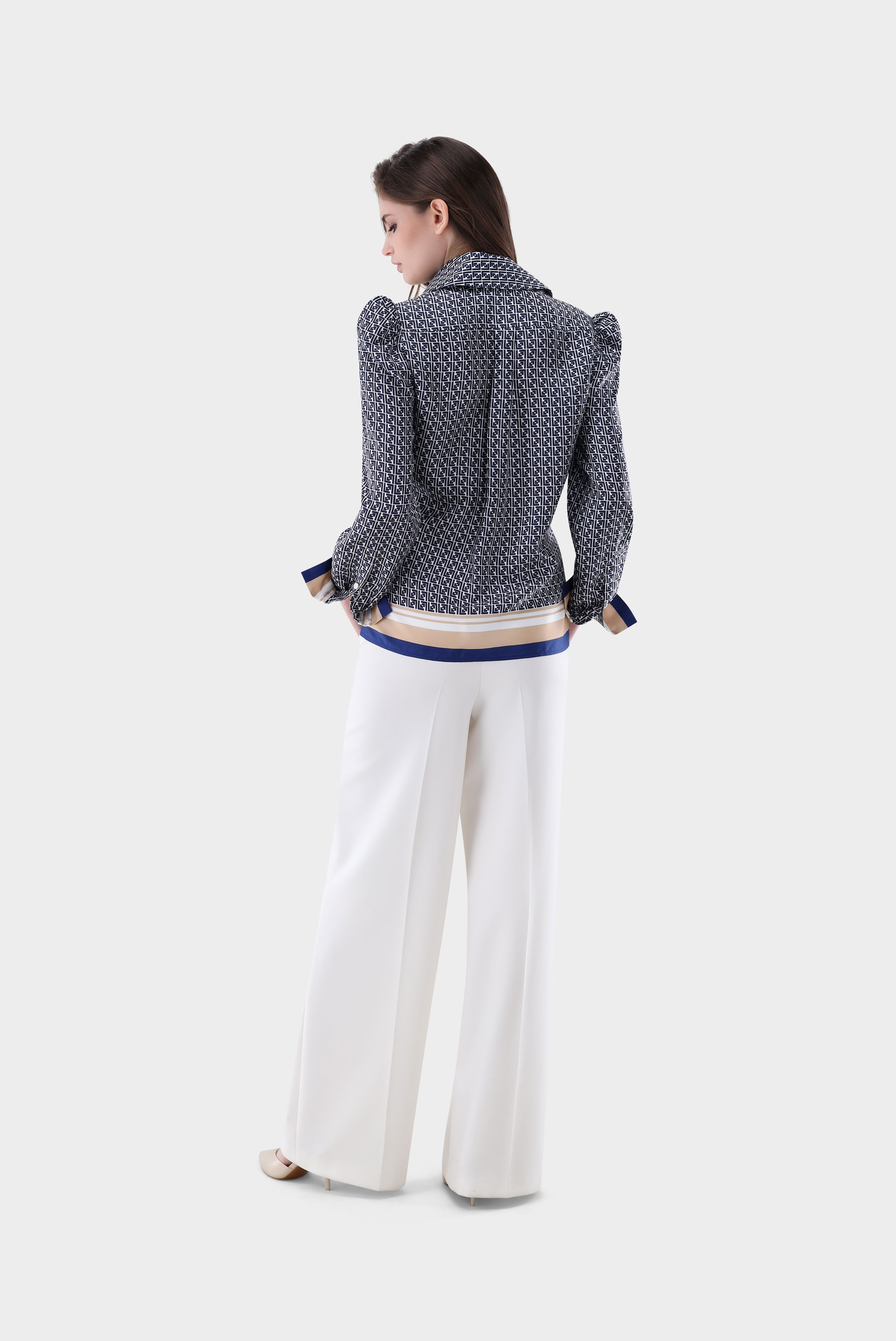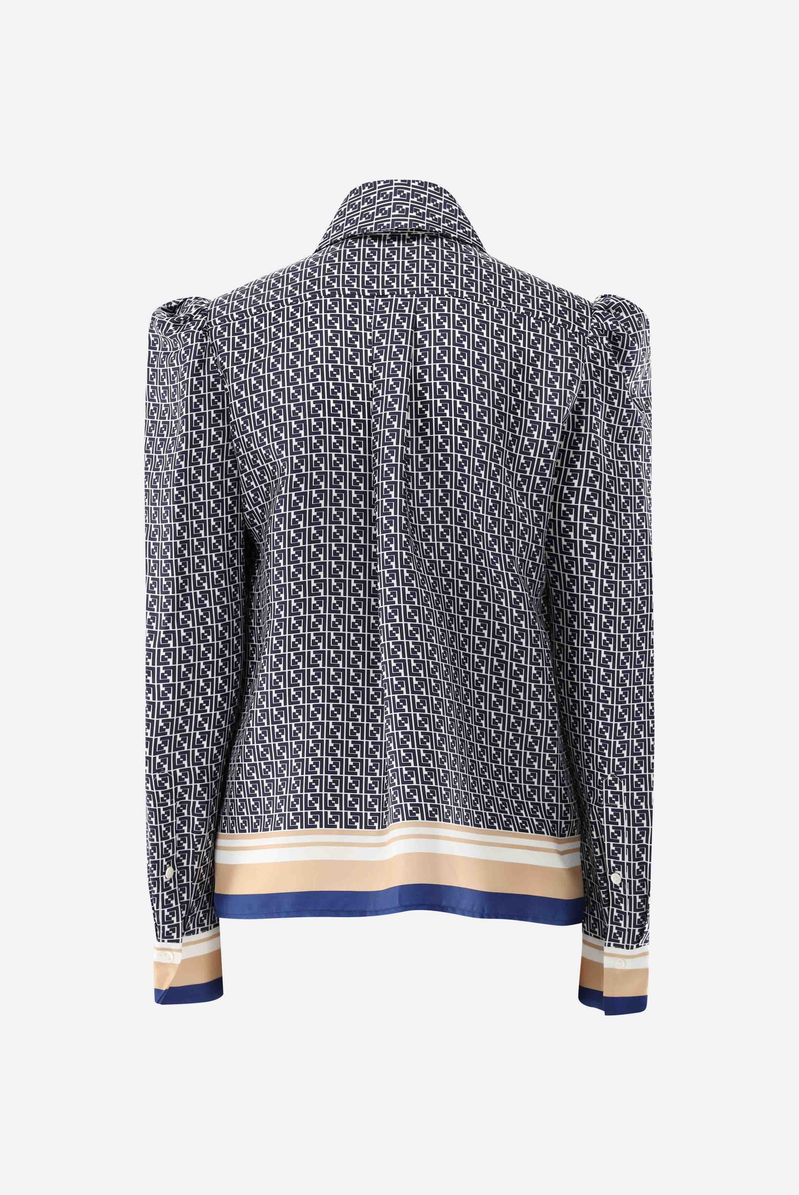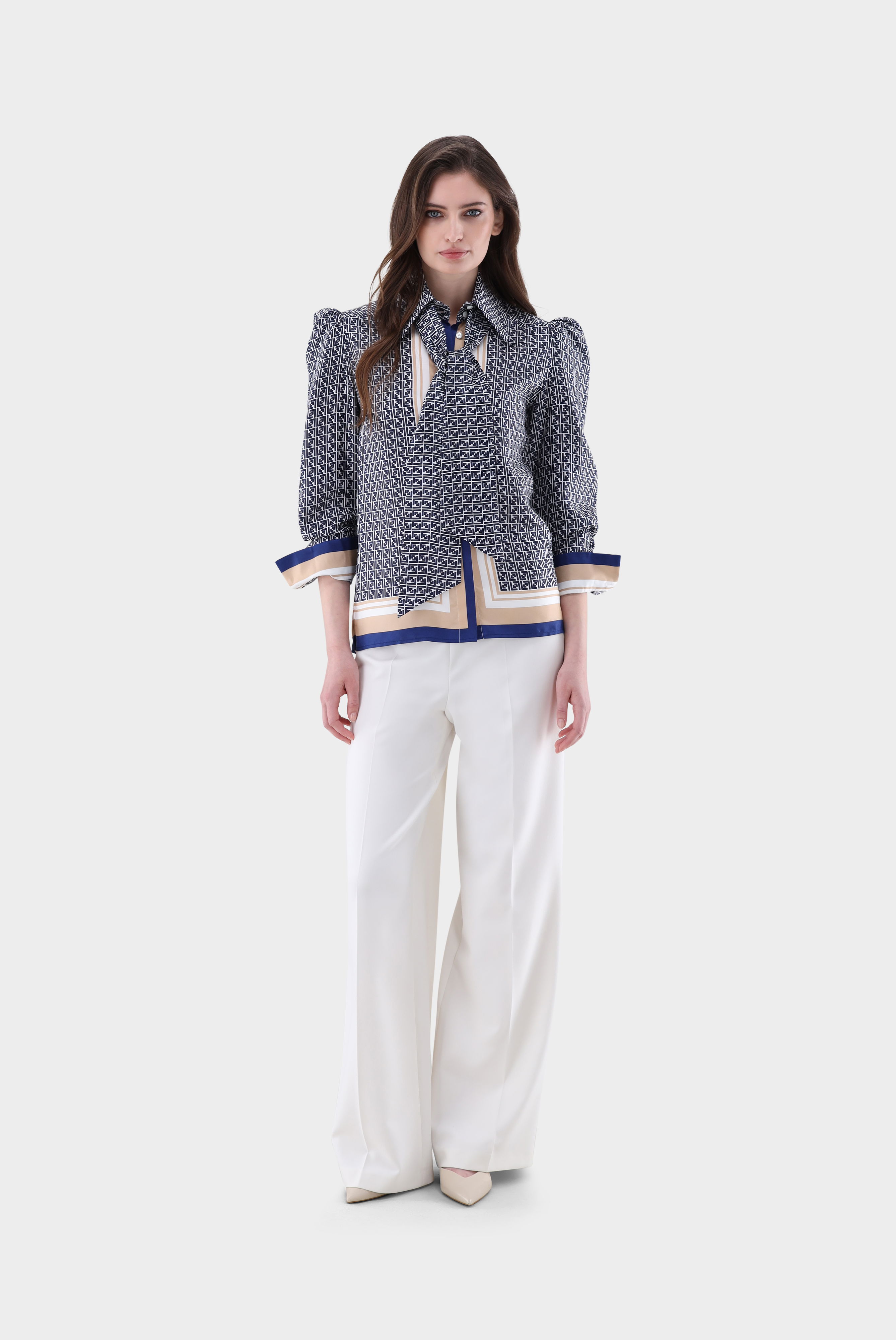 This semi-fitted shirt blouse features an elegant pussy-bow collar and long, feminine puff sleeves. A back yoke with a box pleat provides additional comfort and a perfect fit. The placed, signature print adds a special touch. Crafted from fine silk twill, the shirt blouse offers a luxurious feel and a flowing drape. This style is ideal for expressive business and casual looks.