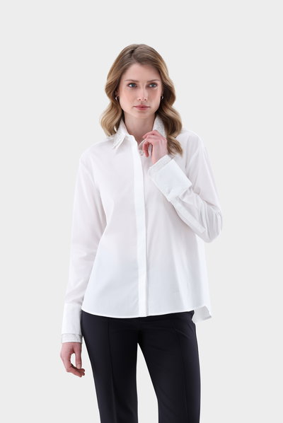 Shirt blouse with pearls on the collar and cuffs
