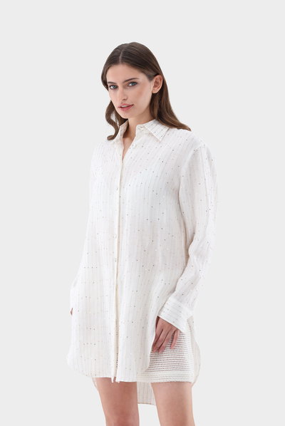 This loose-fit shirt made from a high-quality linen-polyester blend combines comfort with stylish details. The back yoke with pleated detail and the decorative embroidery with sequins give the blouse an elegant touch. The long sleeves and loose cut ensure a comfortable fit. This shirt blouse is the perfect choice for a casual, yet chic look - ideal for the beach or summer vacation.