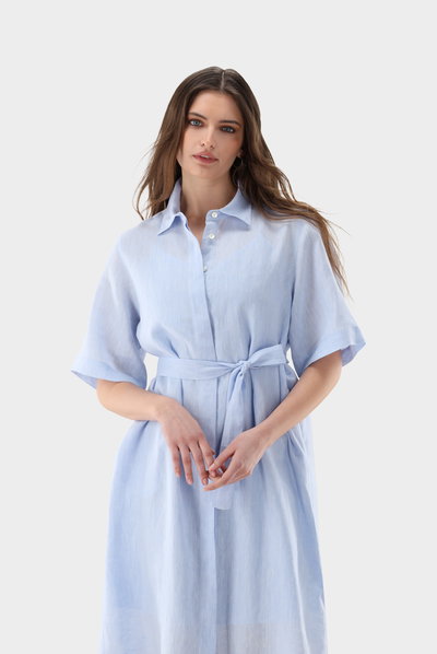 This loosely cut, knee-length shirt dress impresses with its timeless design and exceptional comfort. Short sleeves and a concealed button placket create a clean, modern look. The tie belt accentuates the waist as desired, while the back yoke and side slits offer freedom of movement. Made from soft linen, the dress is particularly breathable and ideal for everyday summer and casual looks.