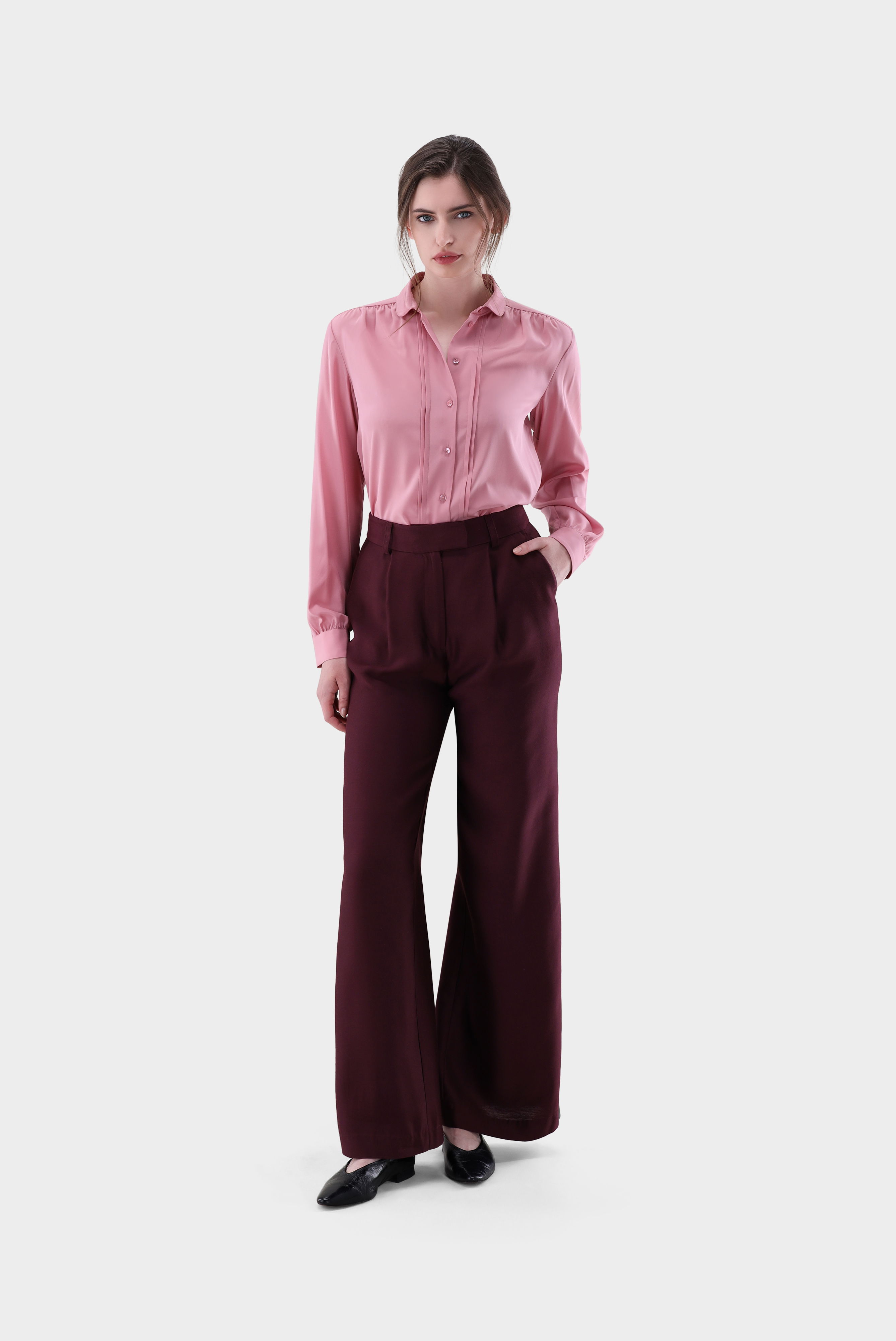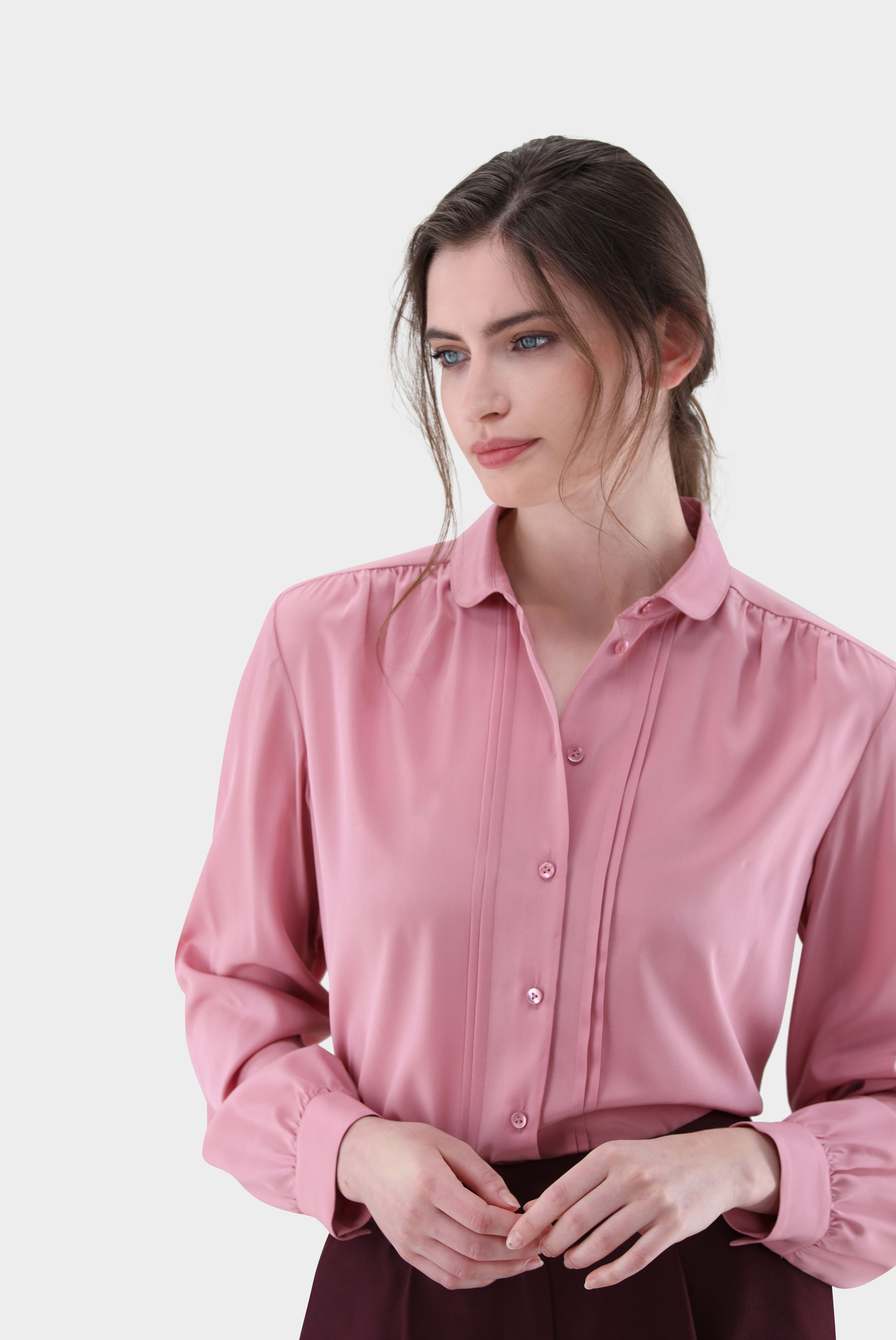 This loose-fit blouse made of stretch silk crepe de chine combines timeless elegance with modern comfort. The long sleeves are cleverly gathered at the cuffs and front yoke, creating a feminine silhouette. Fine, embroidered pleats on the front add subtle accents and give the blouse a distinctive structure. The classic Peter Pan collar stylishly rounds off the design. Perfect for the office, special occasions, or elegant everyday looks – this blouse is a versatile must-have for any wardrobe.