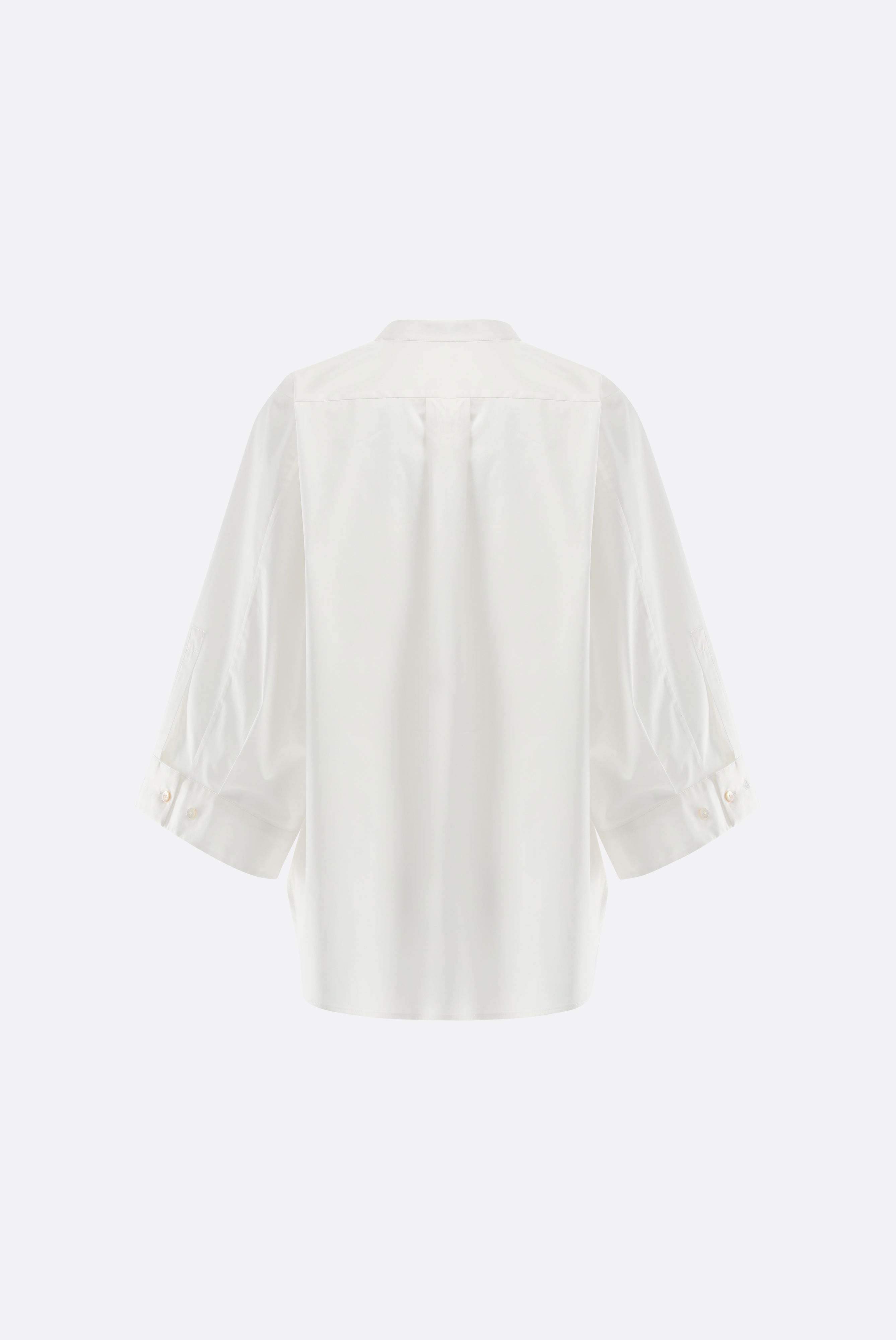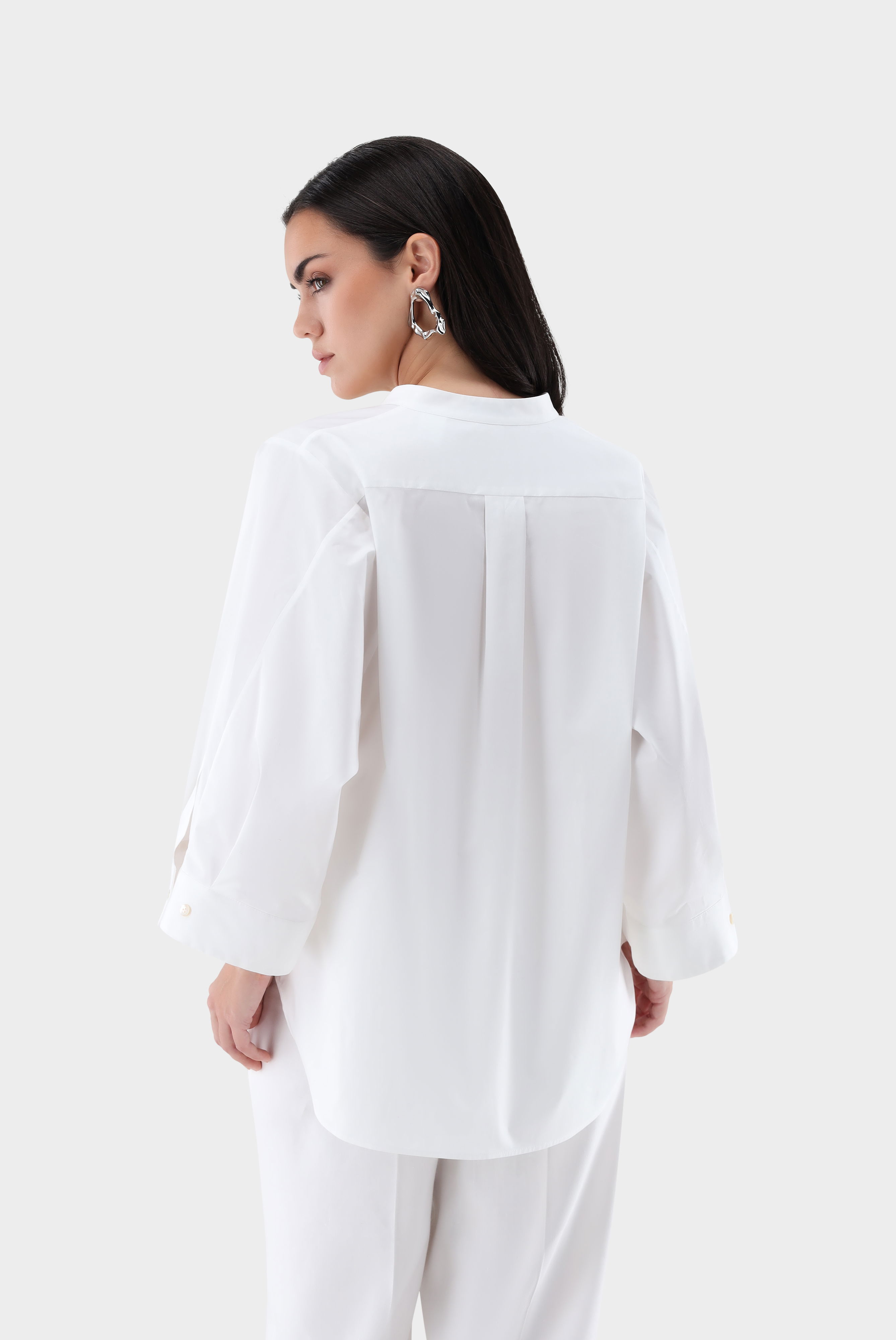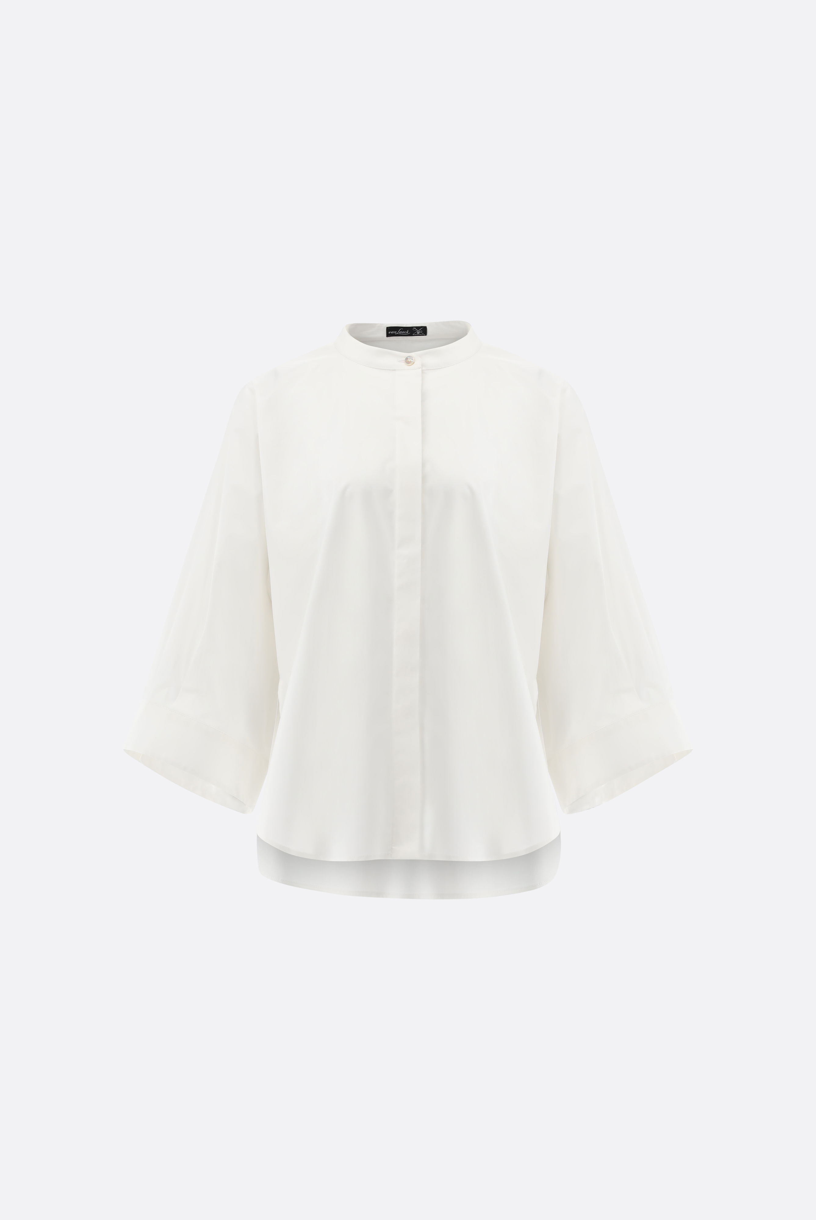 This relaxed-fit blouse impresses with its modern silhouette and extra-wide 7/8 sleeves. A concealed button placket and stand-up collar add a touch of understated elegance, while a back yoke with a box pleat and side slits offer freedom of movement. Crafted from a high-quality cotton-stretch blend in paper-touch poplin, this style boasts a smooth surface, shape retention, and a pleasant feel. Versatile and easy to style, it's ideal for both stylish casual and business-casual looks.