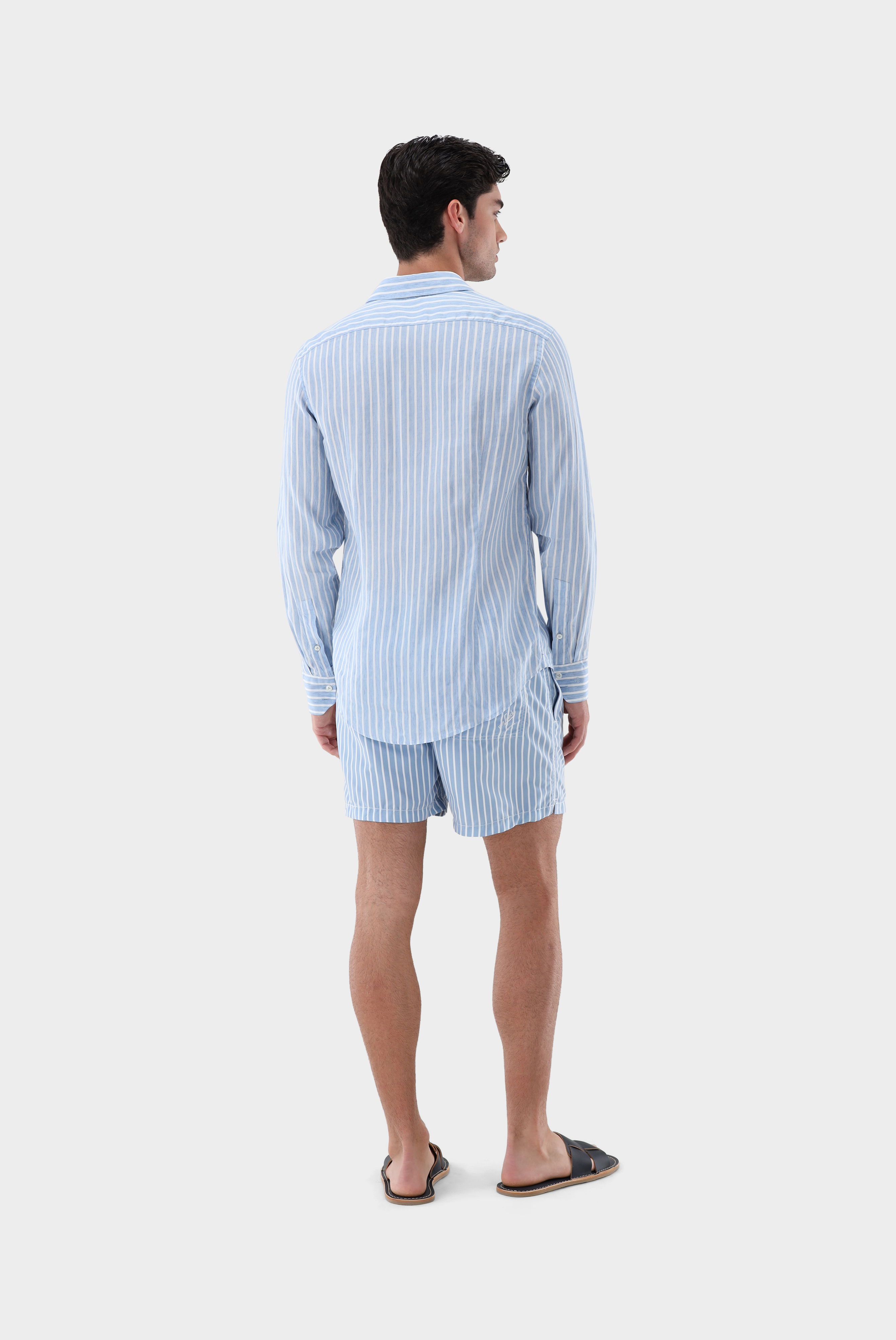 This shirt made from a high-quality blend of Tencel and linen impresses with its particularly light and flowing fabric. It therefore has a particularly casual look, ideal for summer outfits. In addition, swimming trunks with the model name SWIMSHORTS in the same striped pattern can be purchased.