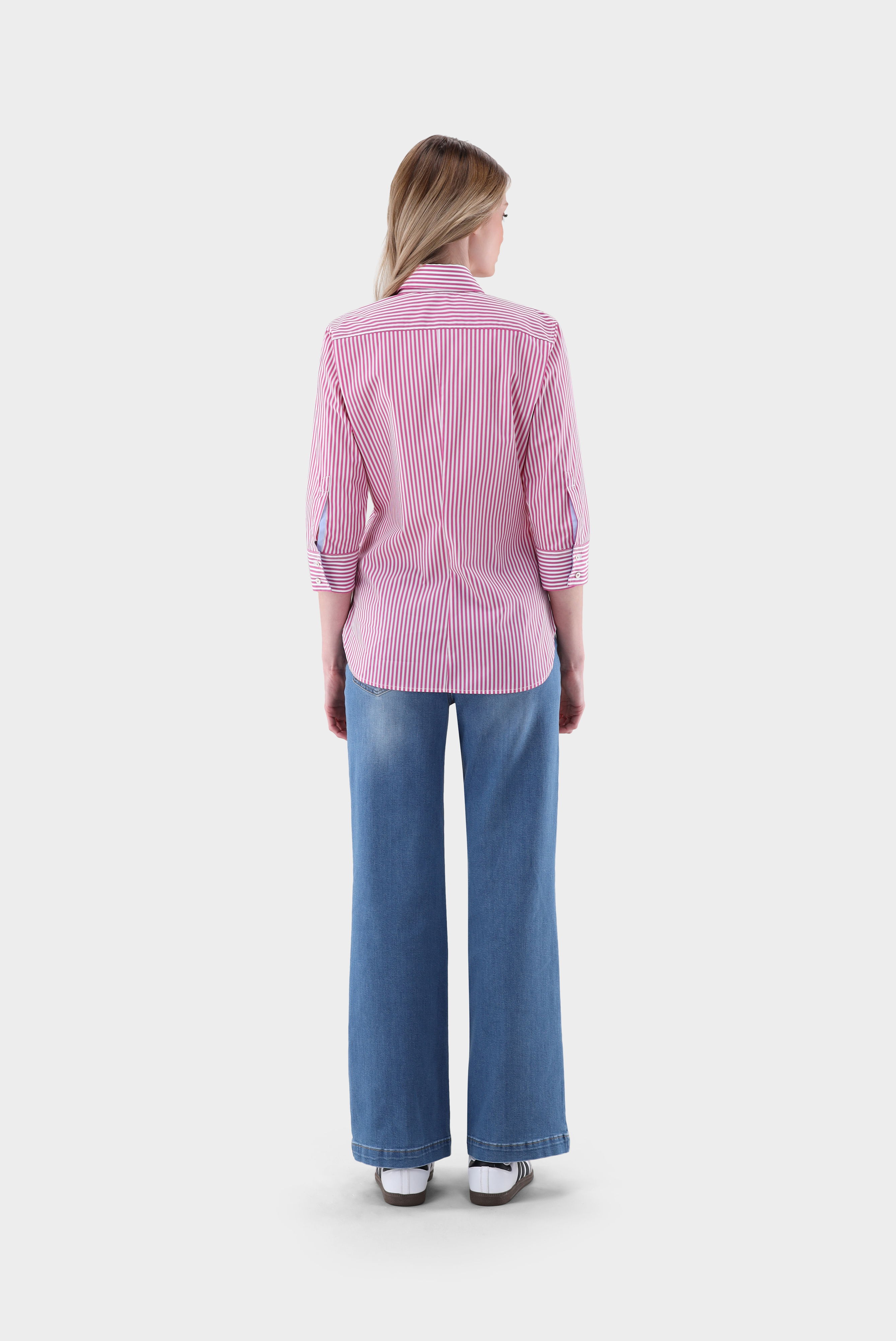 This fitted blouse with 7/8 sleeves offers high comfort and a perfect fit, thanks to the cotton-stretch blend fabric. The blouse features classic stripes in Bengal style and is accented with contrast details at the collar stand and inner cuffs. The cuffs, inner placket, and sleeve slit turn-up are made from blue Oxford fabric, giving the blouse an elegant touch. A decorative stitch in stripe color adds a stylish accent. Mother-of-pearl buttons and a stand-up collar complete the design, making the blouse ideal for both business and casual occasions.