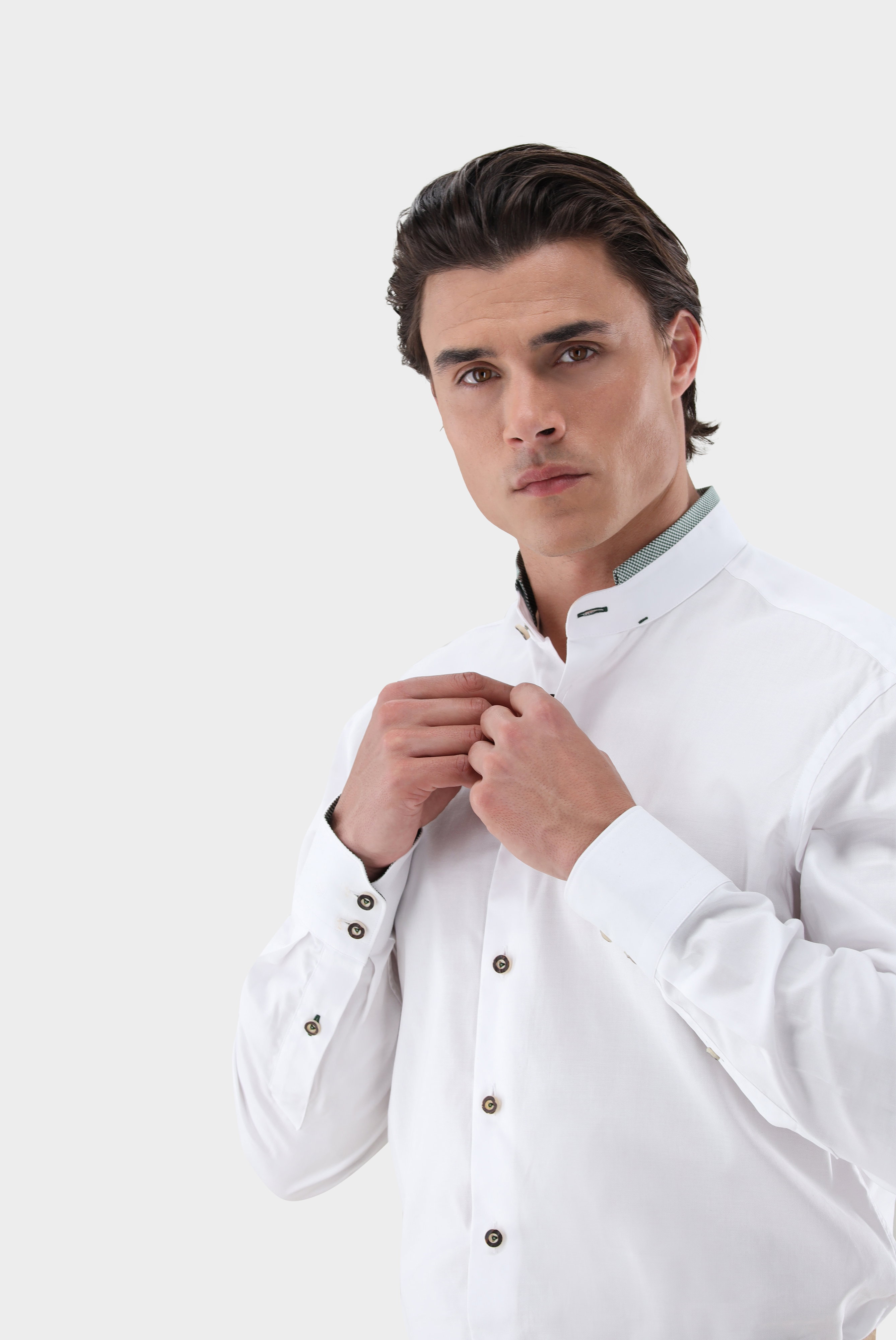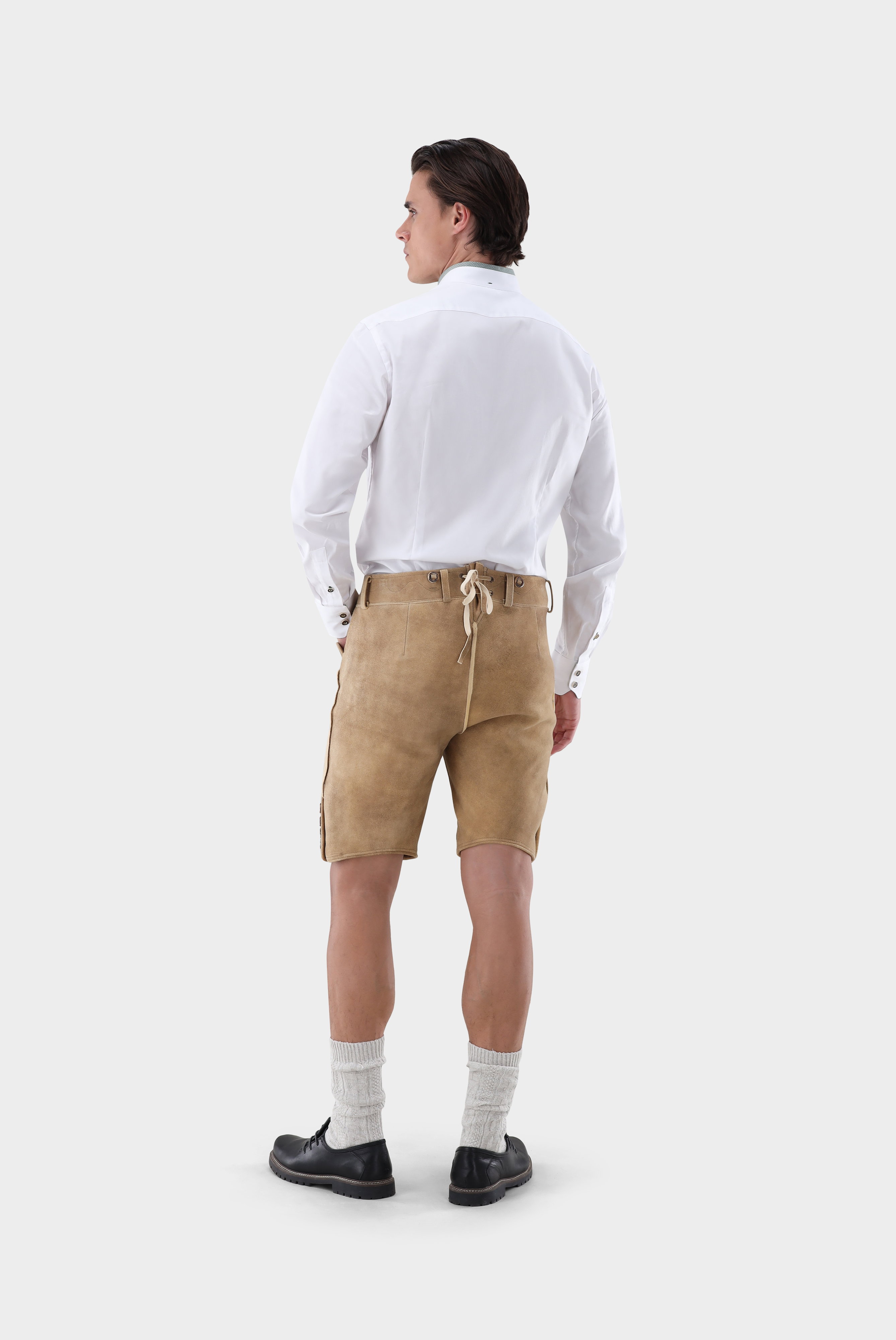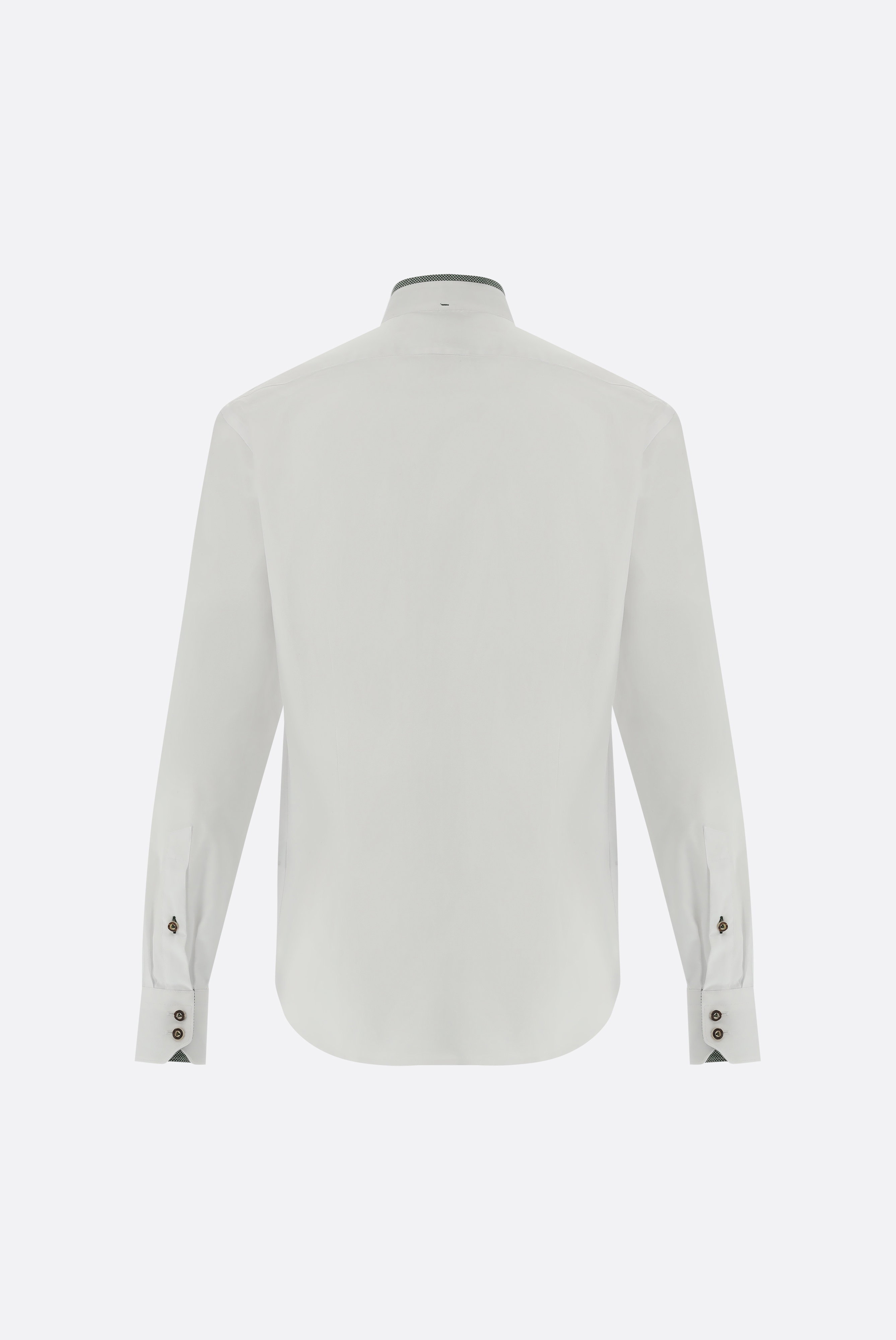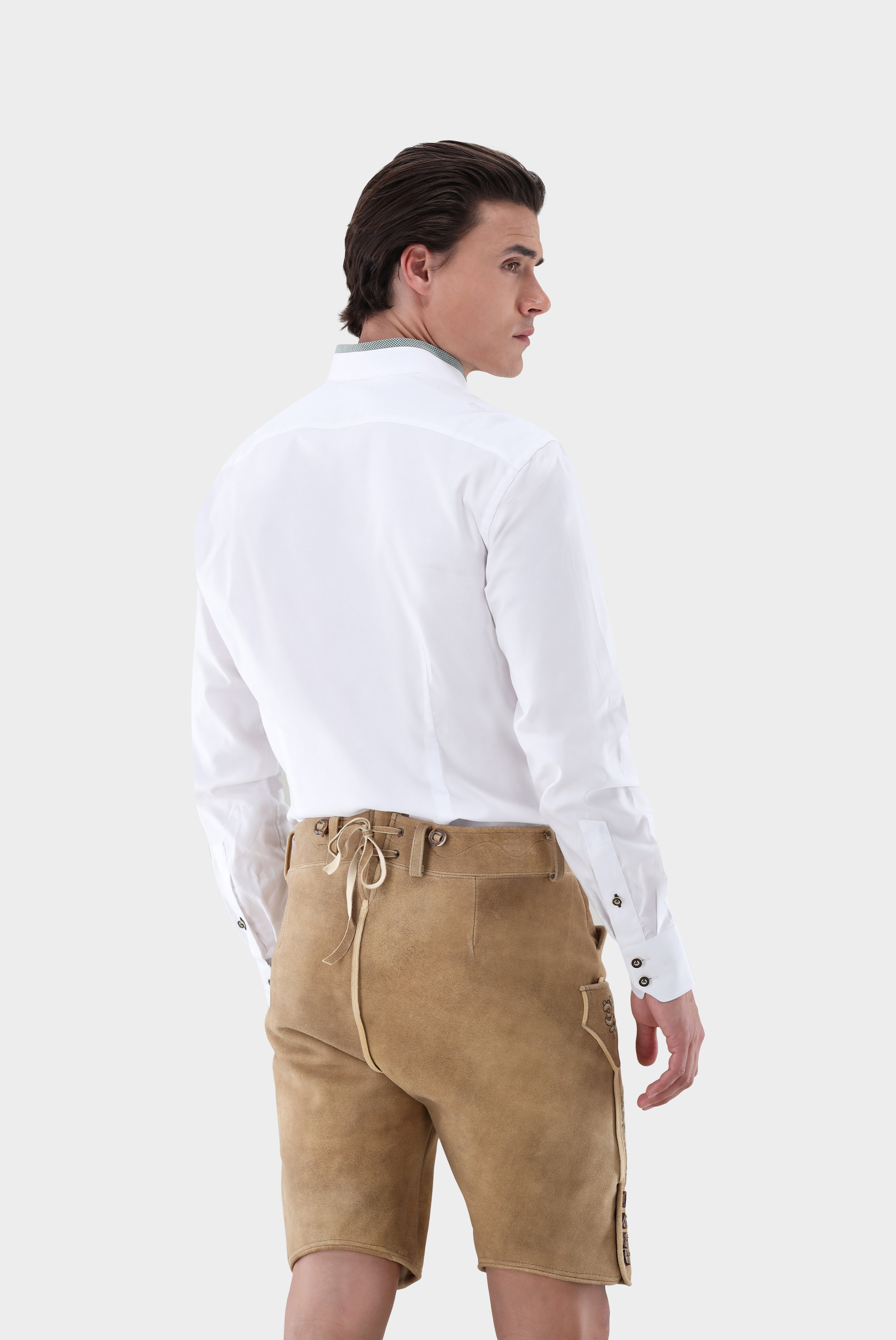 The white shirt with checked piping details on the inner side of the stand-up collar, is the luxurious choice for your outfit. Made of high-quality and soft oxford fabric, it is one of the finest oktoberfest shirts on the market. The traditional stand-up collar and real horn buttons complete the traditional yet noble look. Combined with lederhosen, a jacket and a traditional waistcoat, this shirt really stands out.