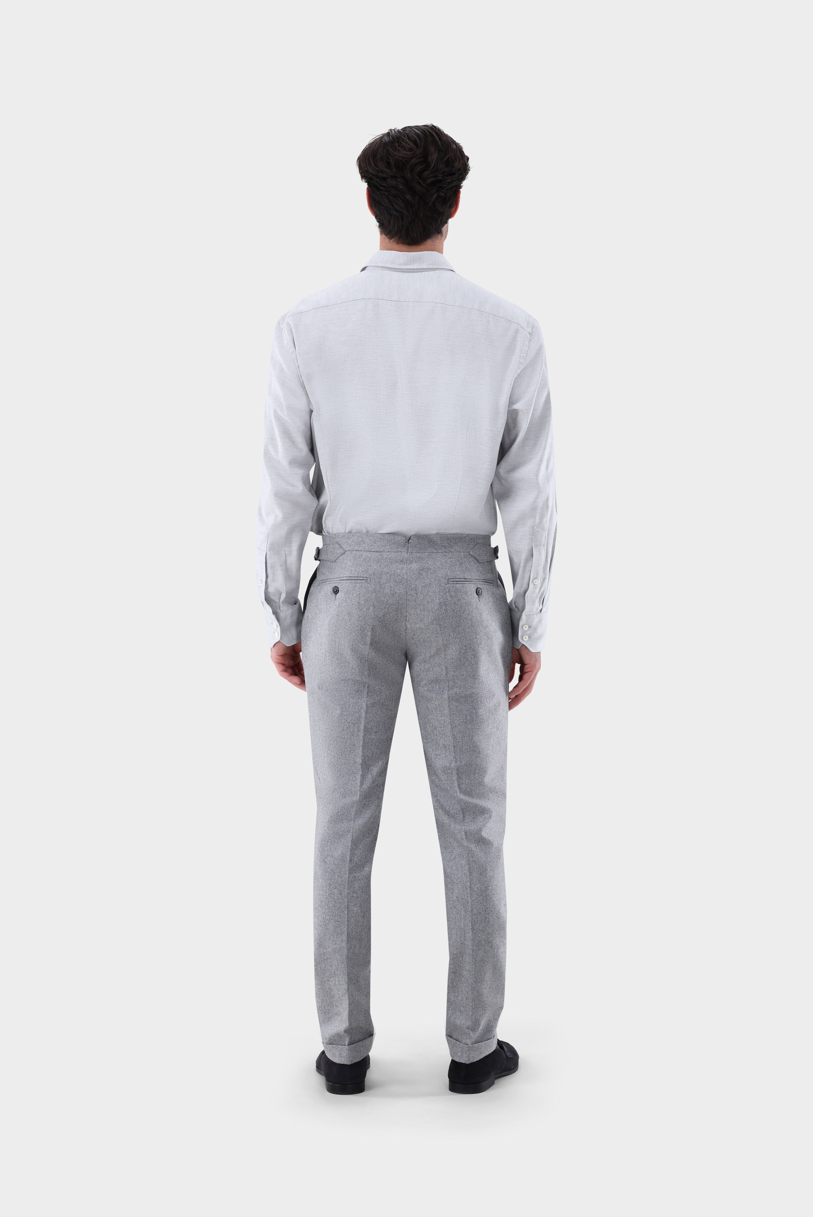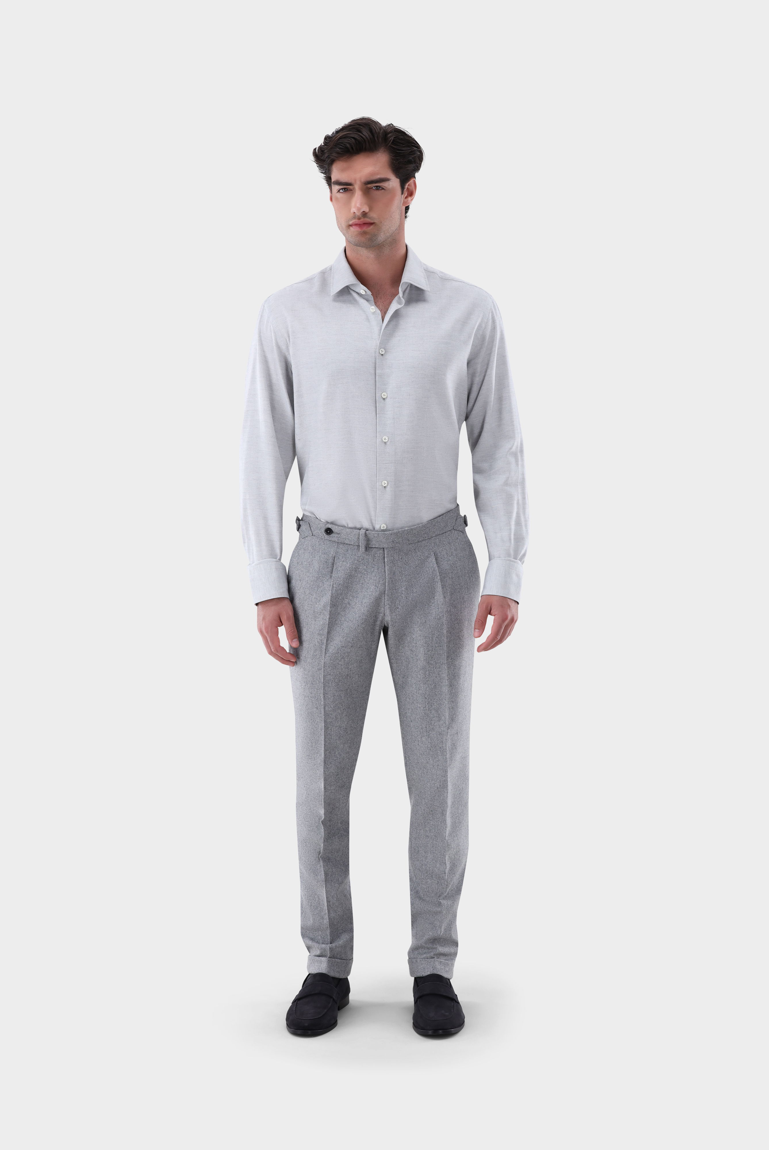 Slim-fitting pleated wool flannel trousers with an extended waistband, turn-ups, and adjustable waist tabs. These modern trousers elegantly combine style and comfort.