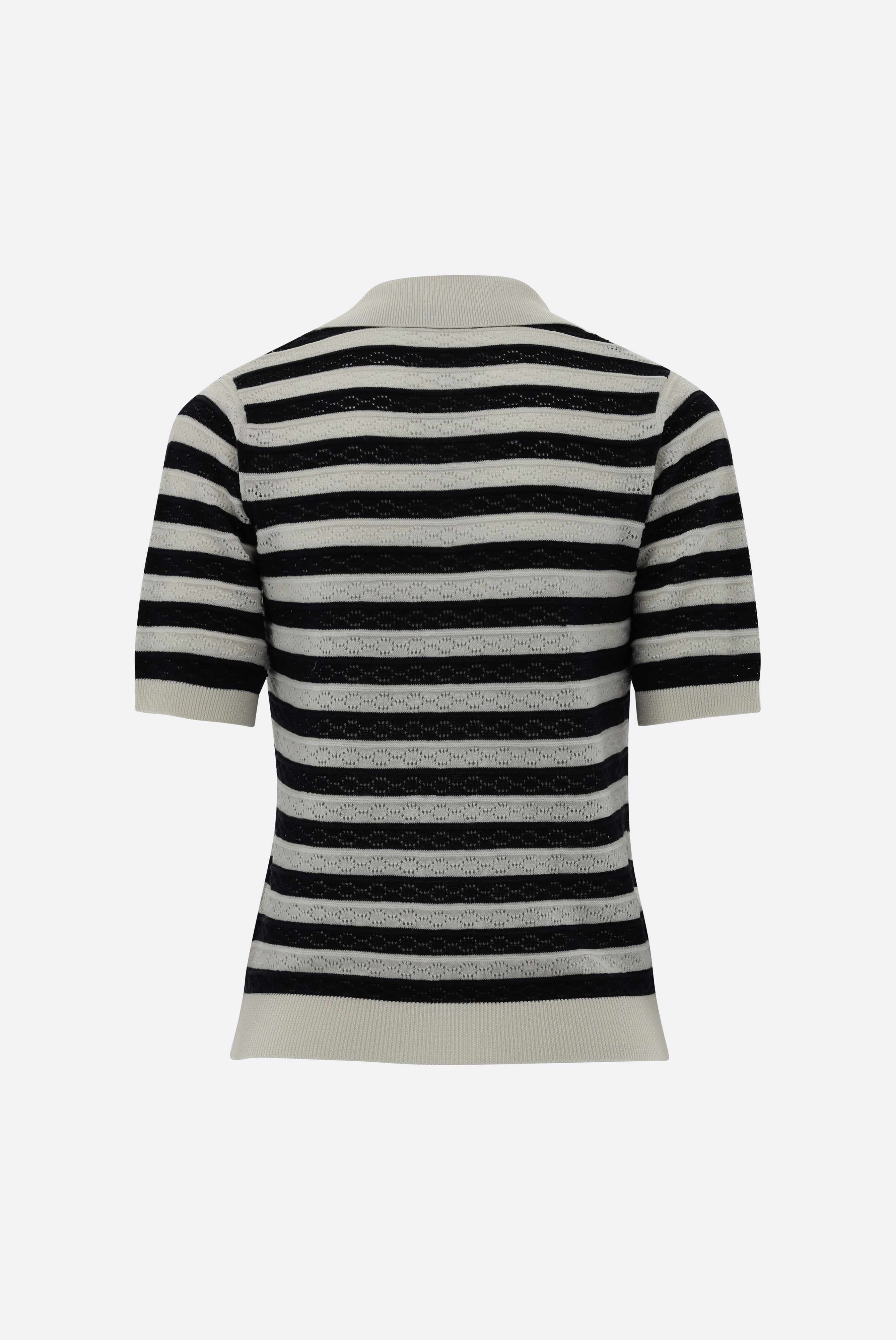 Striped V-neck polo shirt with openwork pattern, made of Air Cotton. This product impresses with its comfort and high-quality workmanship. The use of twisted, fine cotton yarns in a knitted lace pattern ensures exceptional breathability and creates a modern, romantic look.