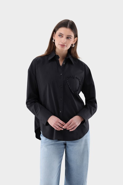 This relaxed-fit blouse combines comfort and style. The heart-shaped chest pocket with a ruffle on the left side adds a special, intricately crafted detail, while the loose fit with slightly dropped shoulders lends a modern touch. Perfect for casual and business looks or festive occasions. Elegant mother-of-pearl buttons complete the design.